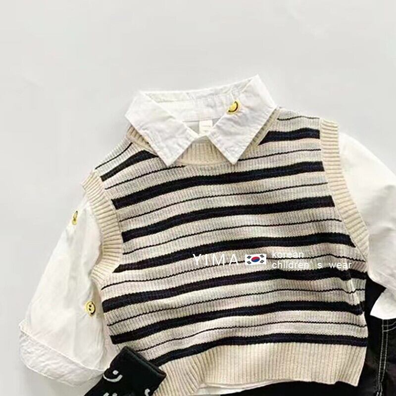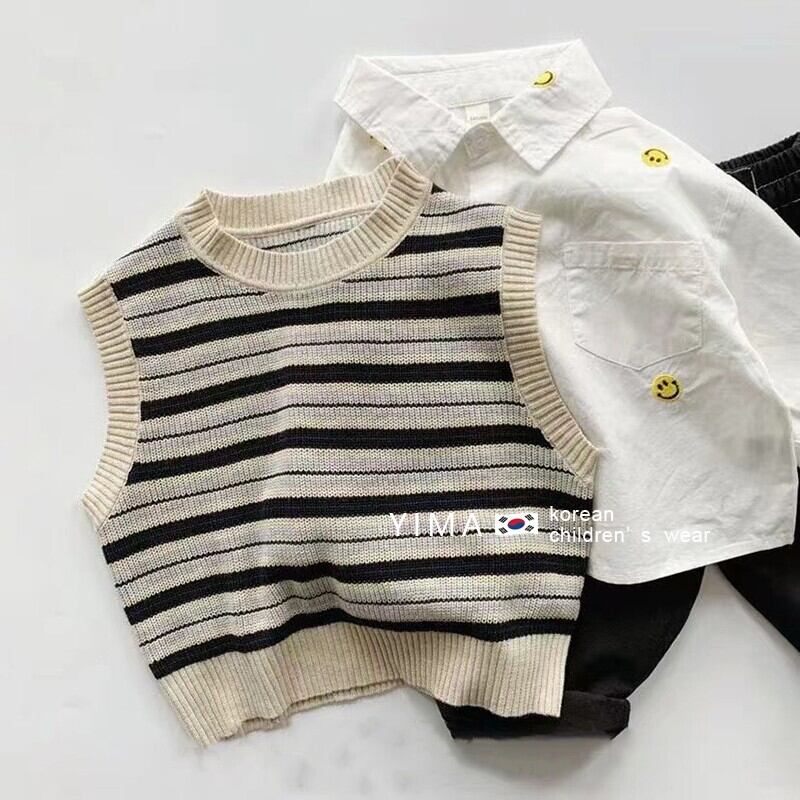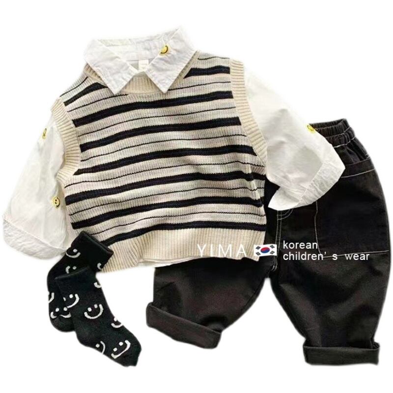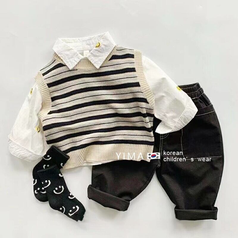 色:ストライプニットベスト,白長袖シャツ,ブラックジーンズ