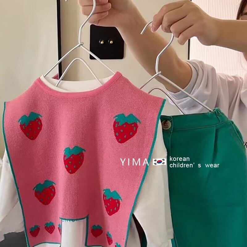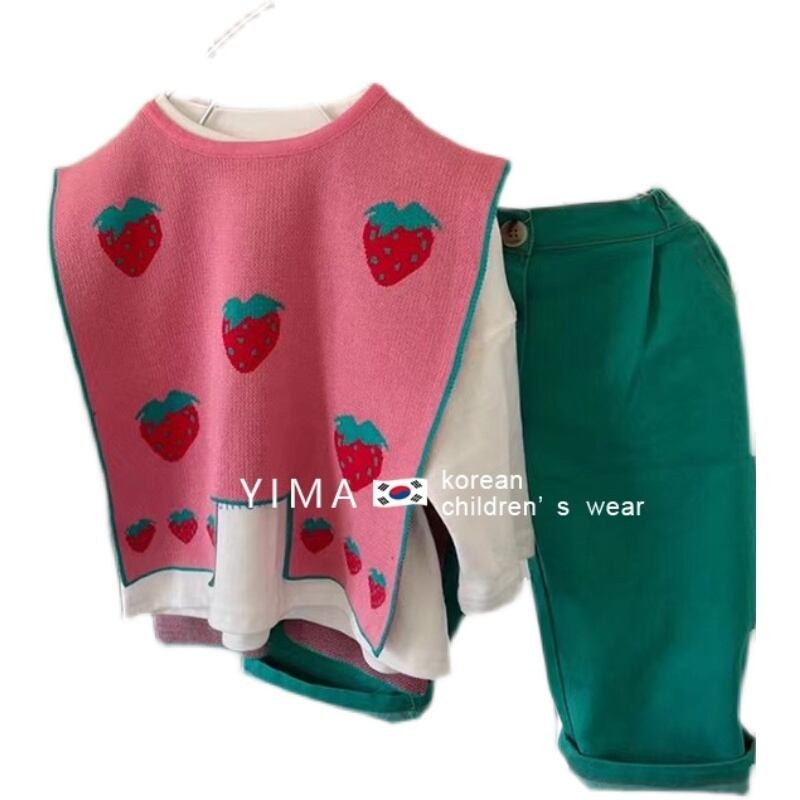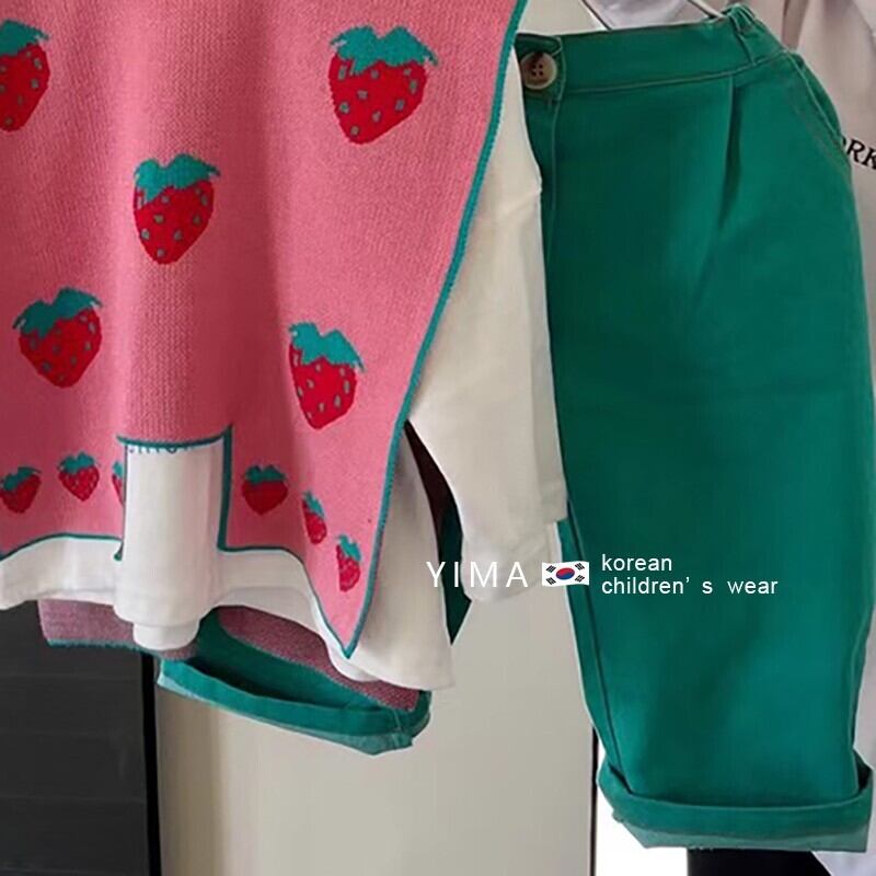 色:ピンクストロベリーショール,白い長袖,グリーンパンツ