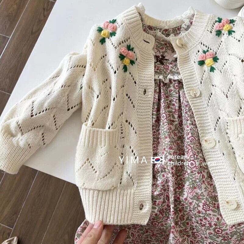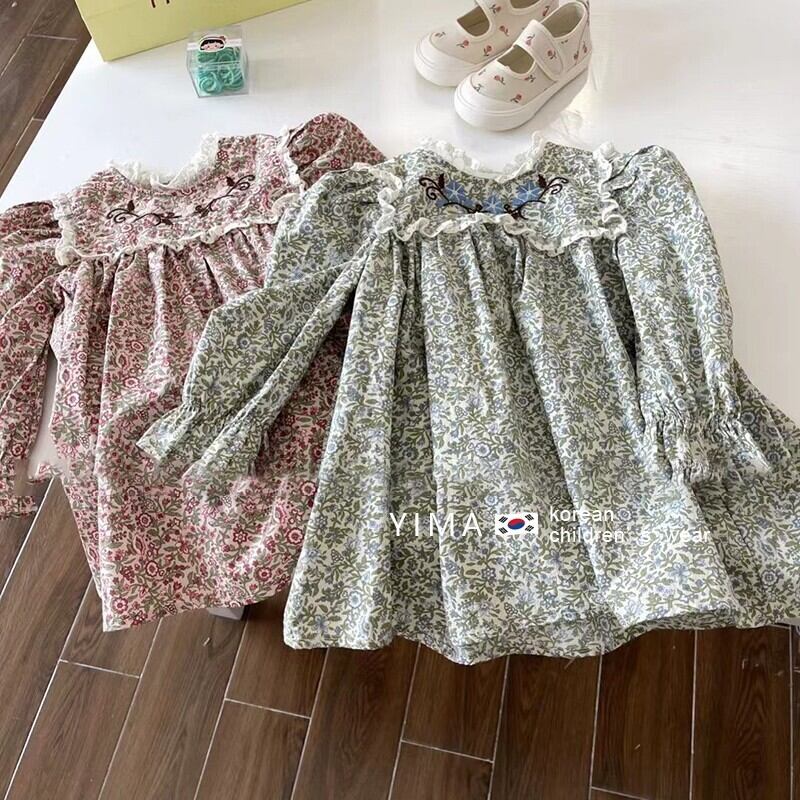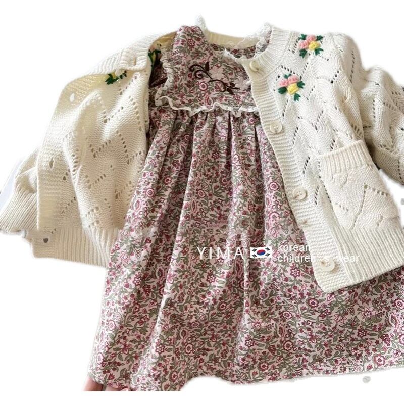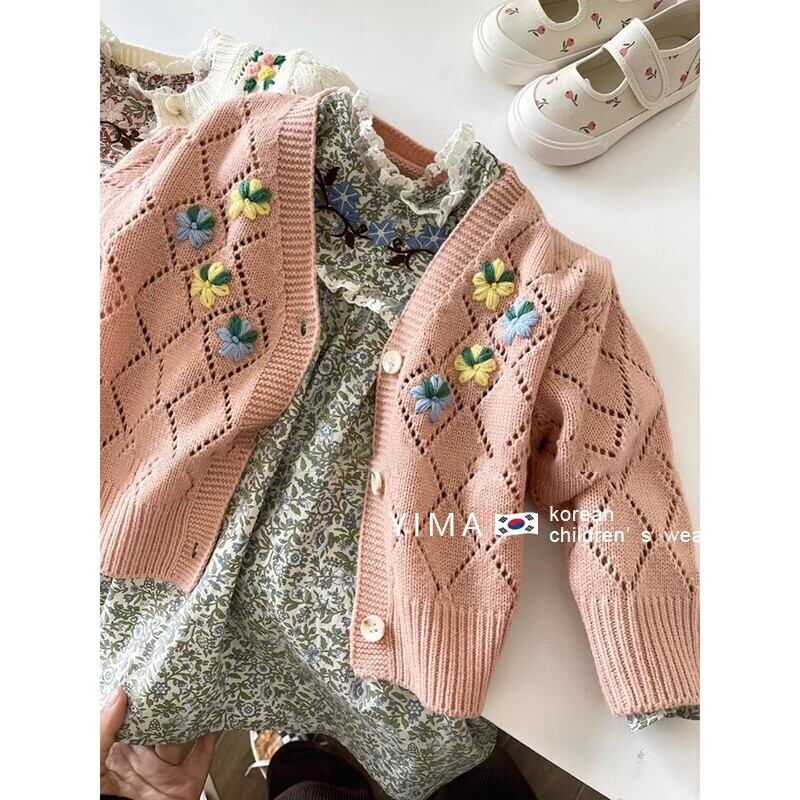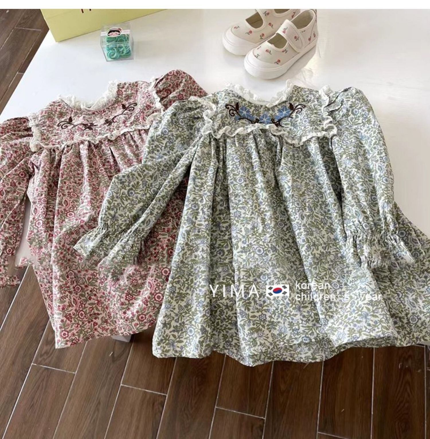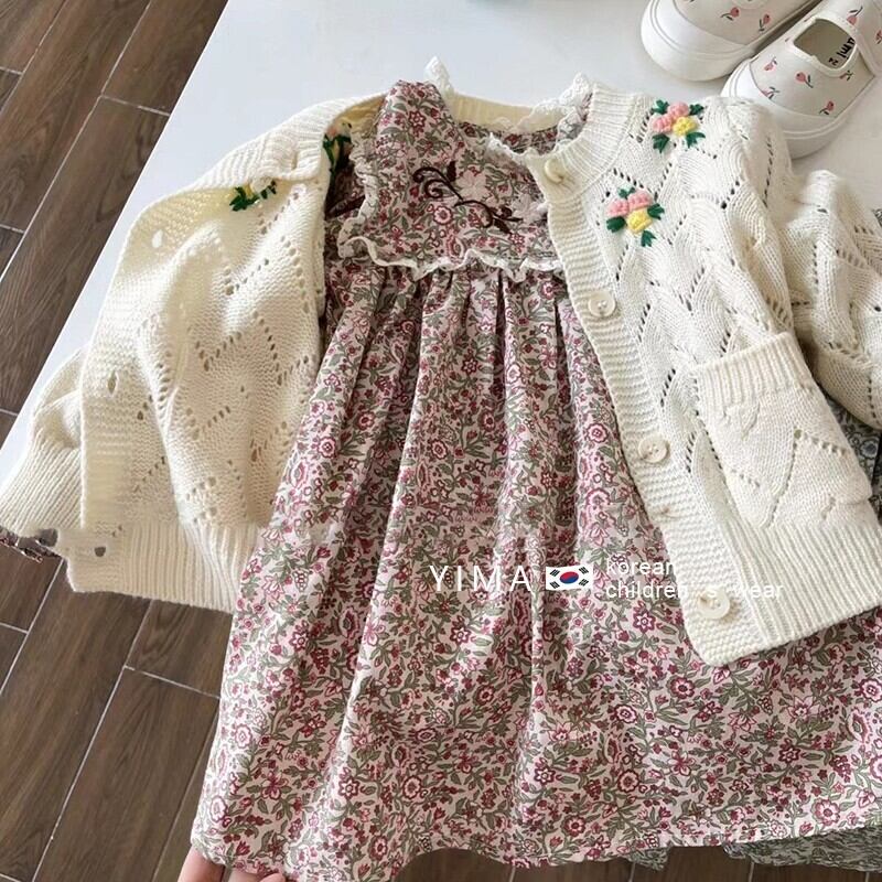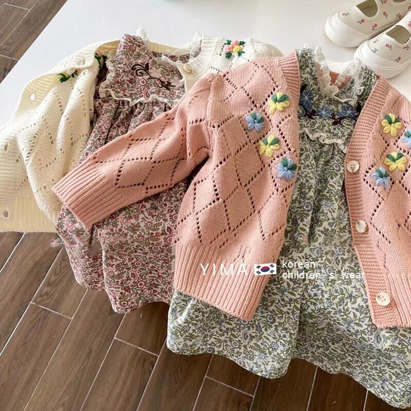 色:グリーンフローラルスカート,赤い花柄スカート,ベージュのセーター,ピンクのセーター