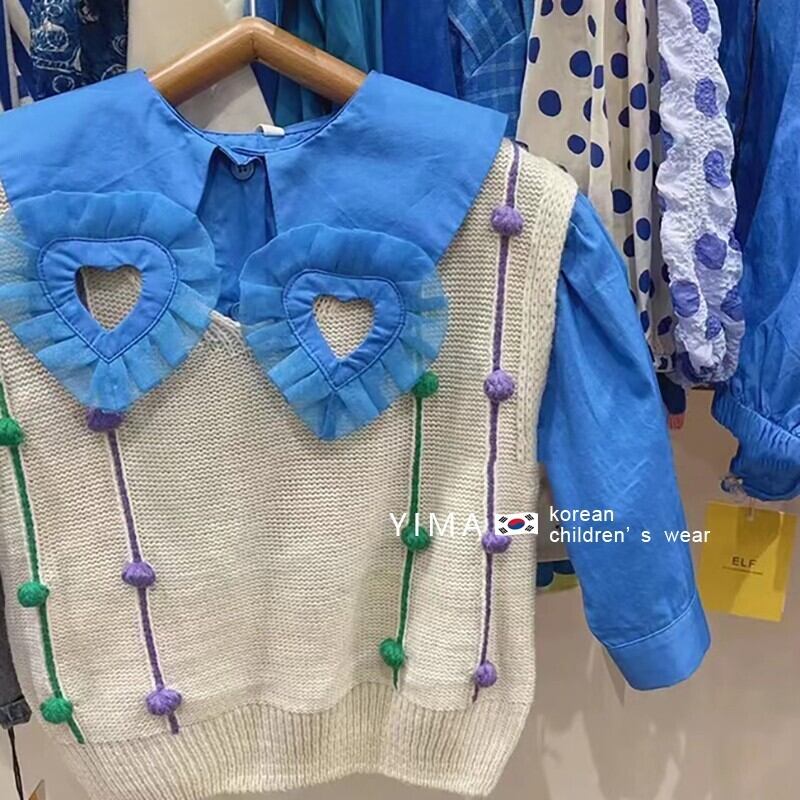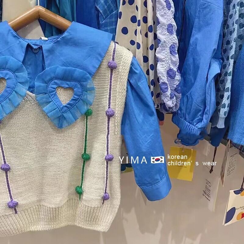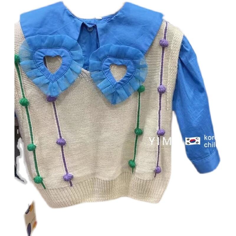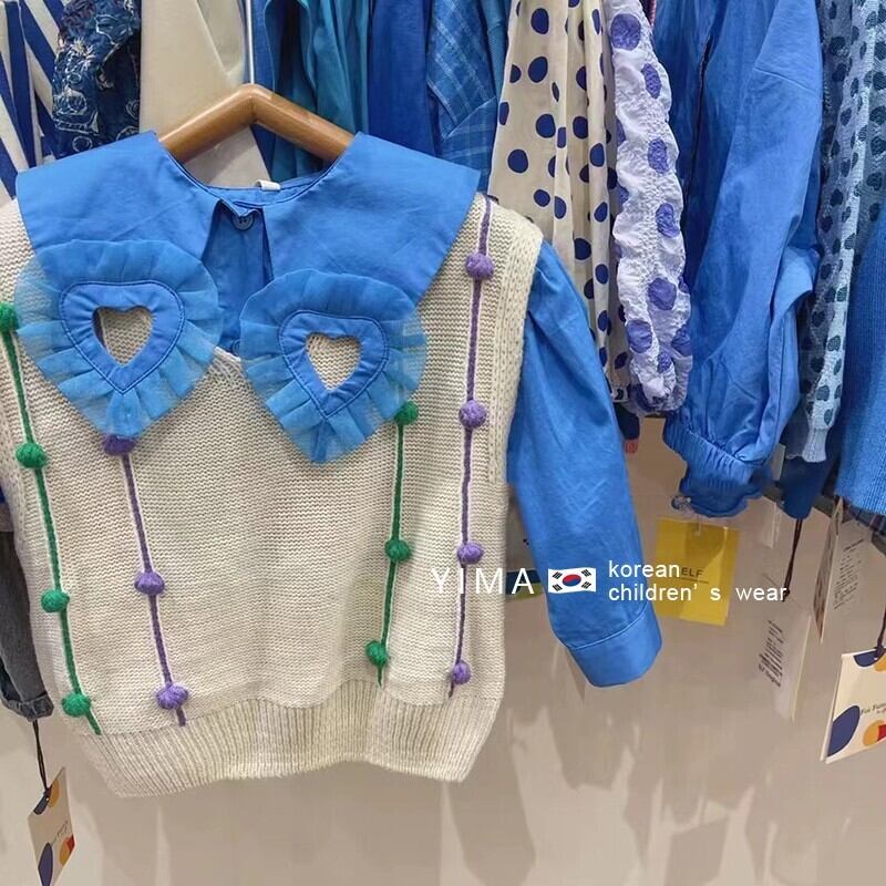 色:ブルーのデザインシャツ,ベージュのニットベスト