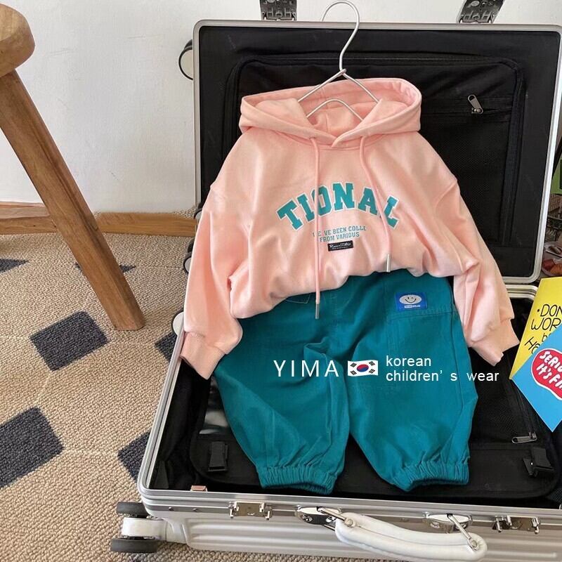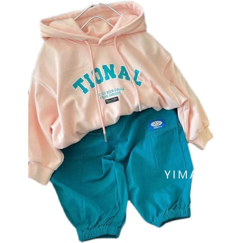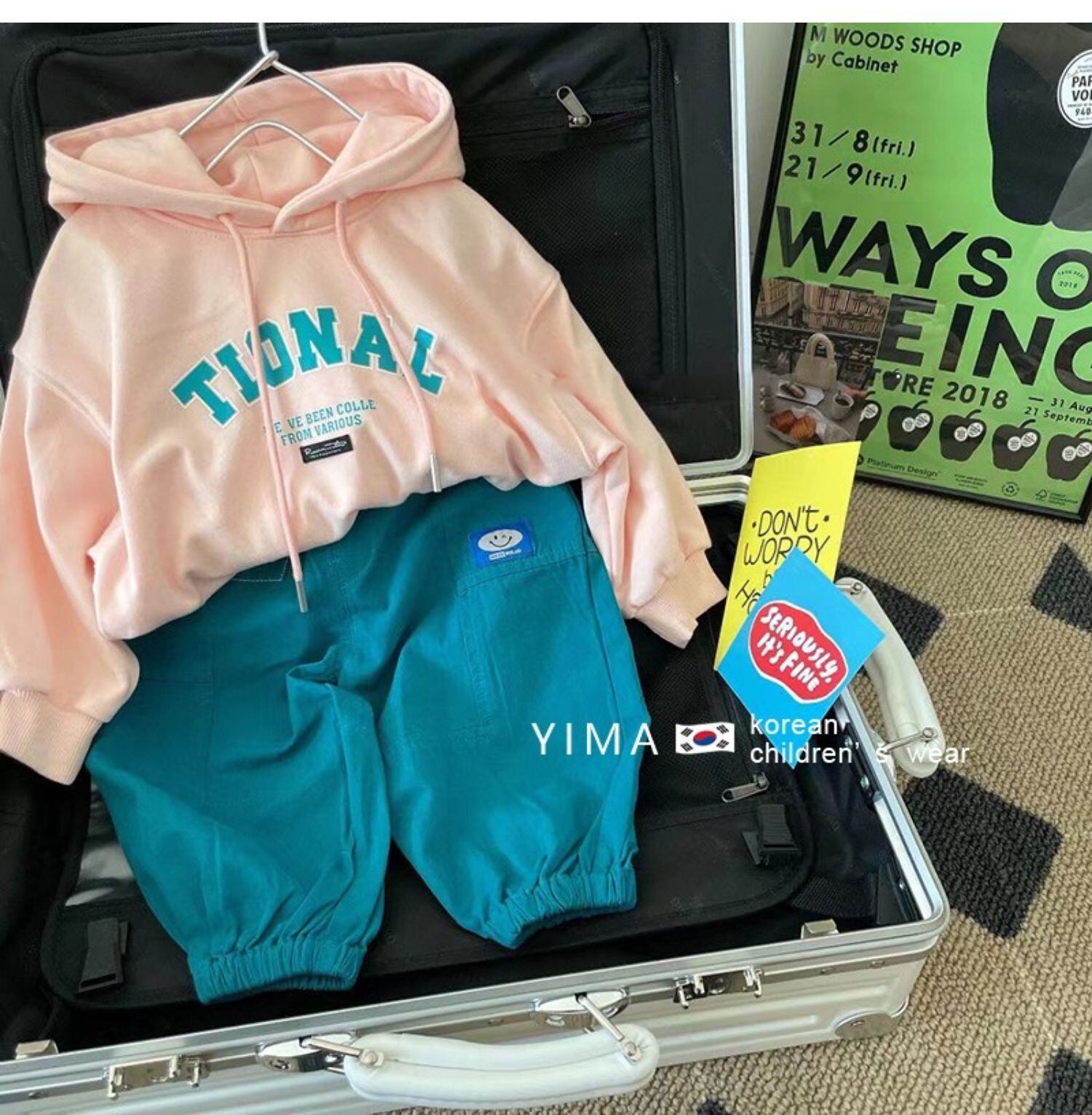 色:コーラルピンクのスウェットシャツ,レイクブルーパンツ