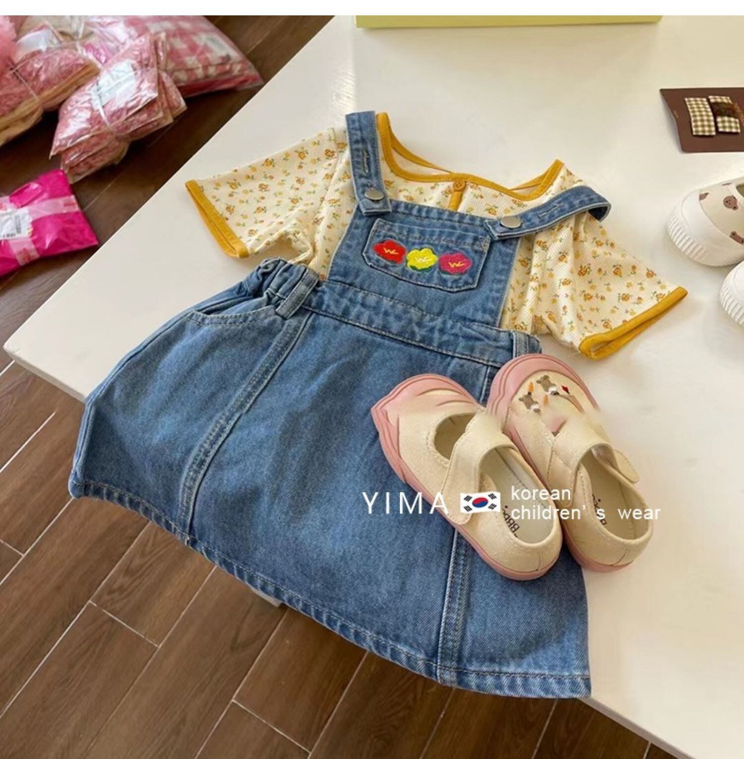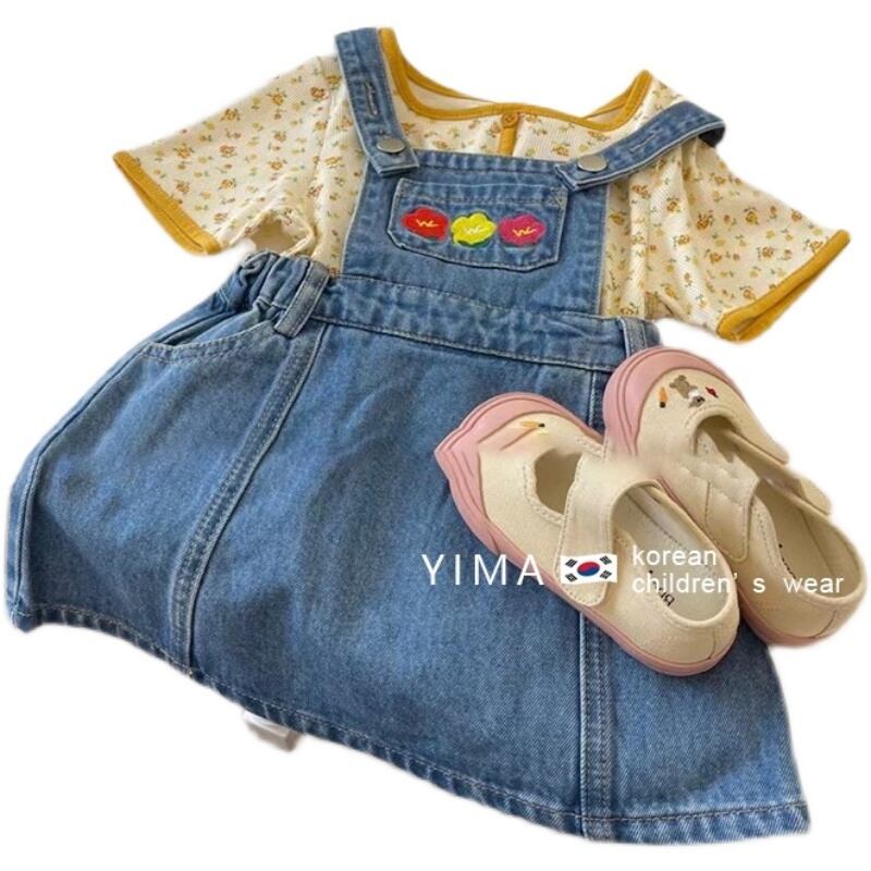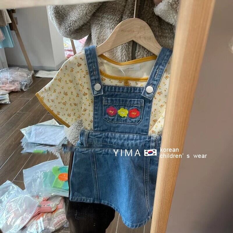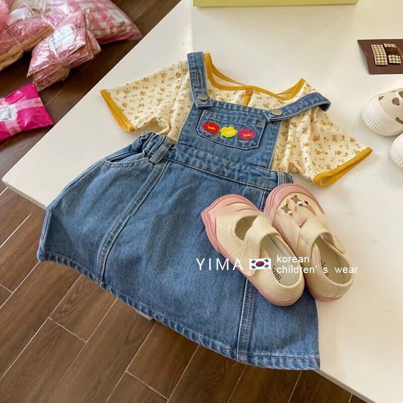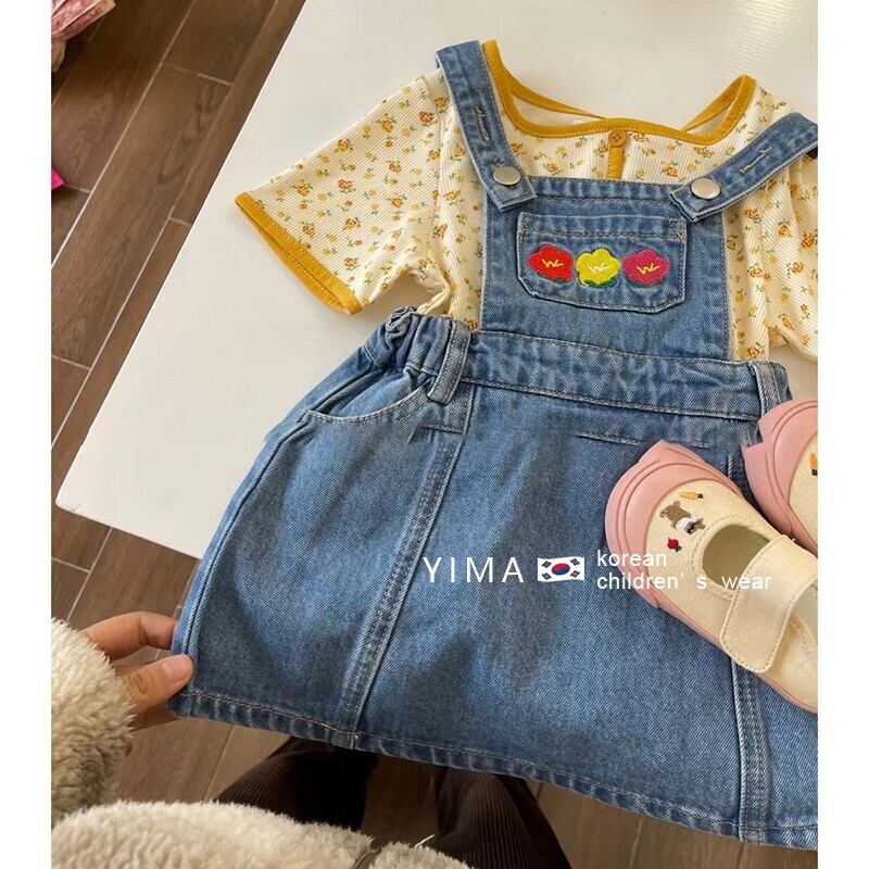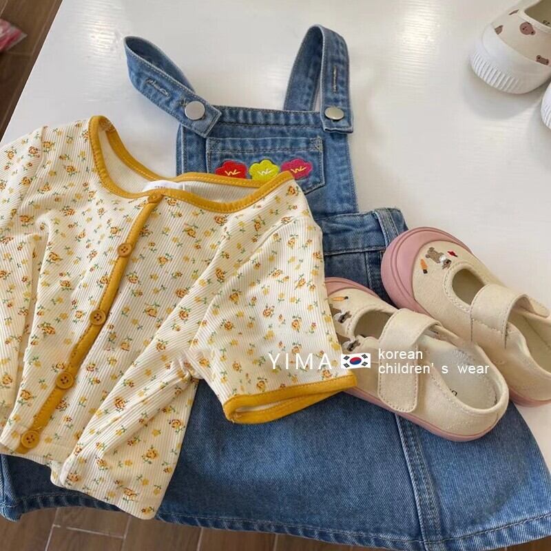 色:ブルーストラップスカート,黄色い花柄のシャツ