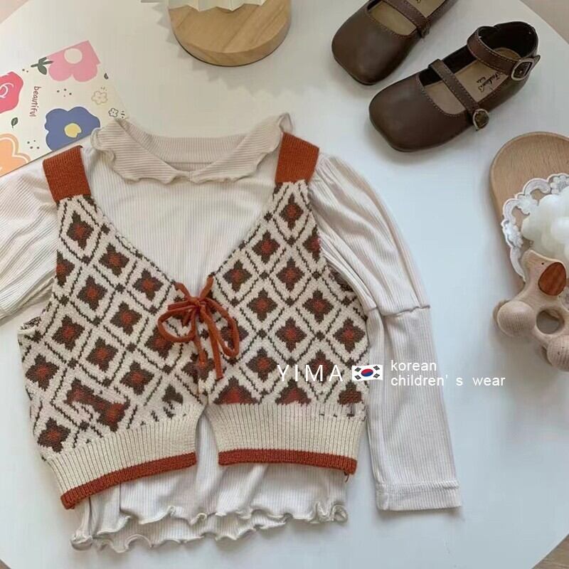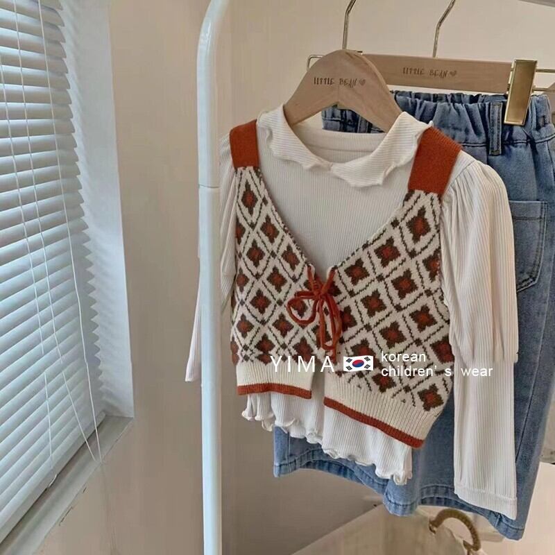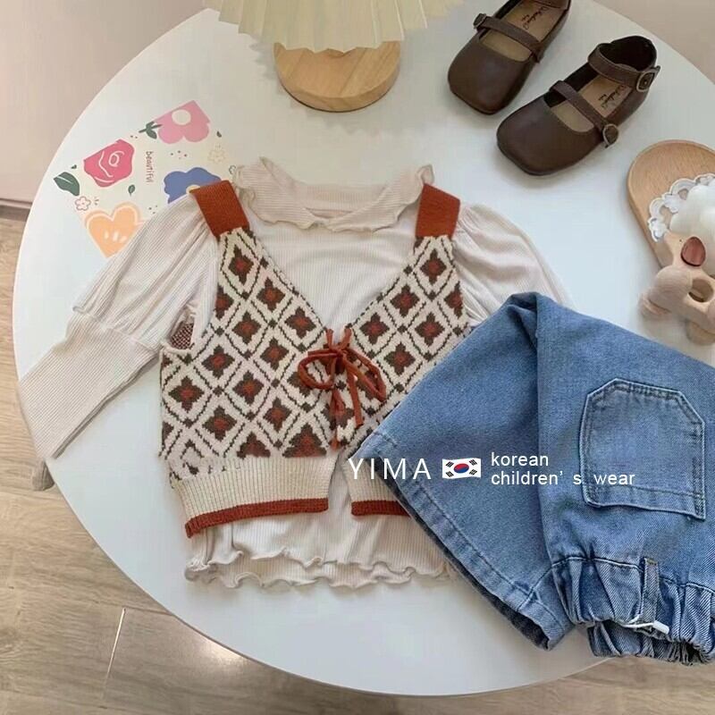 色:ベージュのベスト,ベージュのボトミングトップ,ブルージーンズ