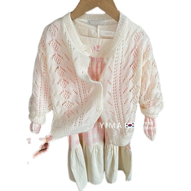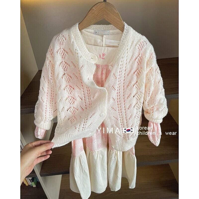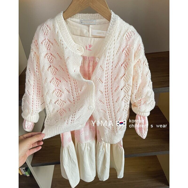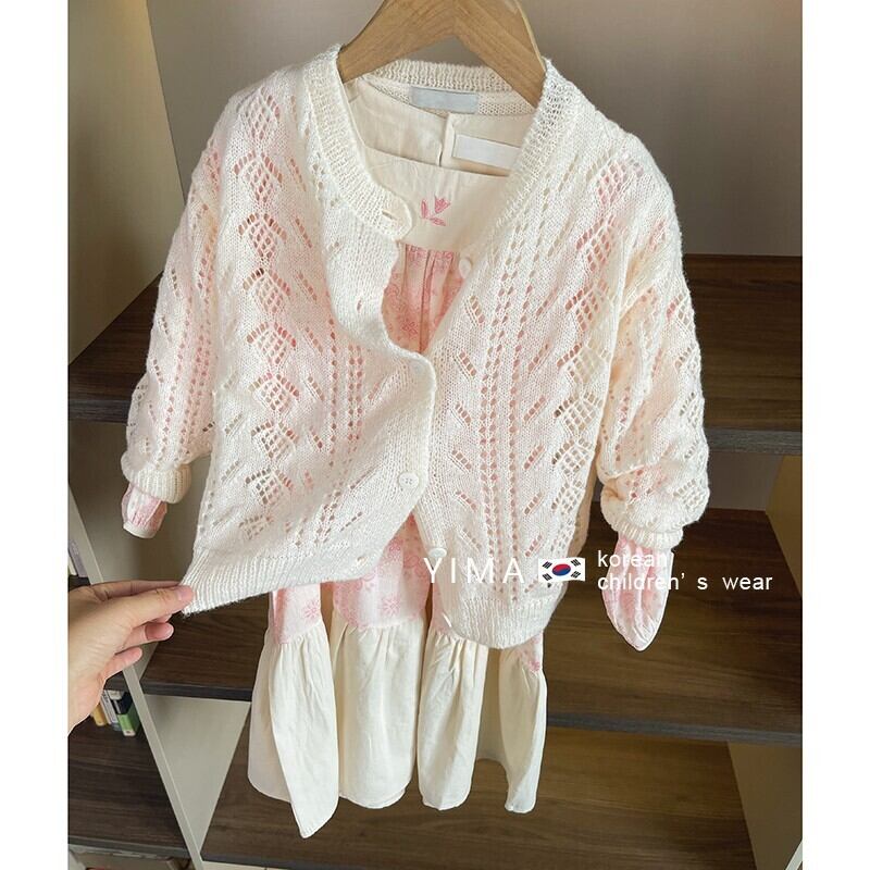 色:ホワイトニットカーディガン,ピンクの花柄ドレス