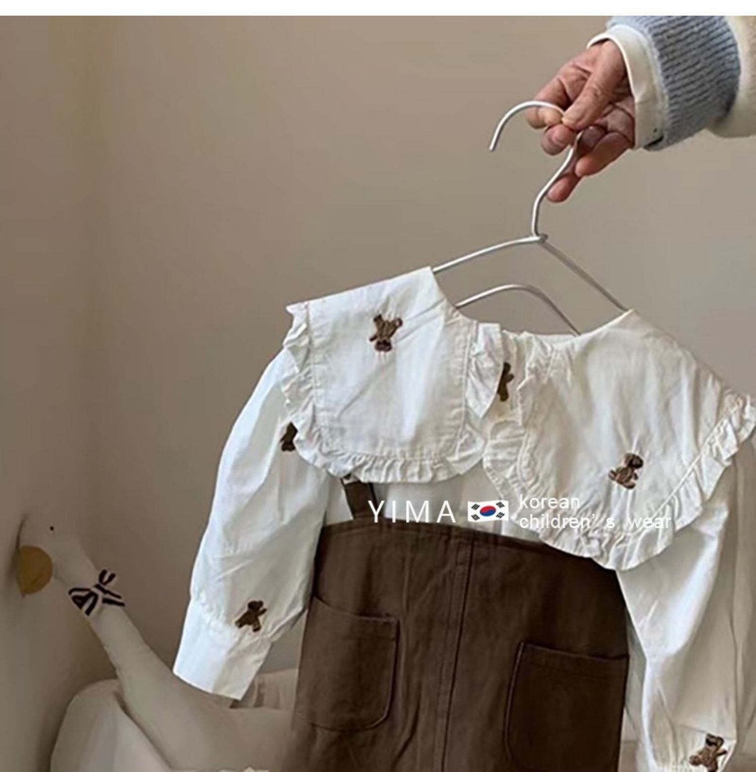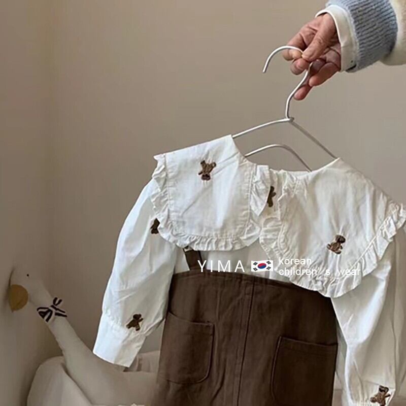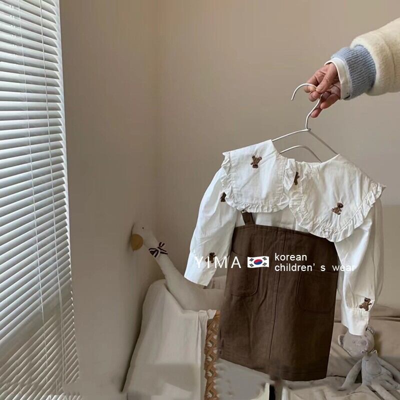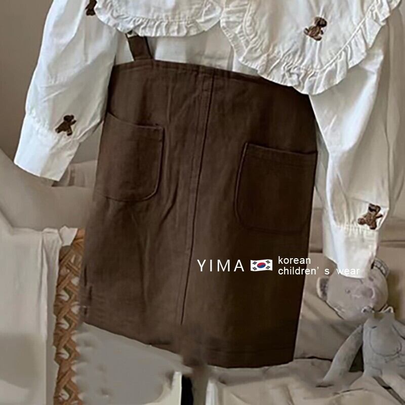色:茶色のストラップドレス,白のシャツ