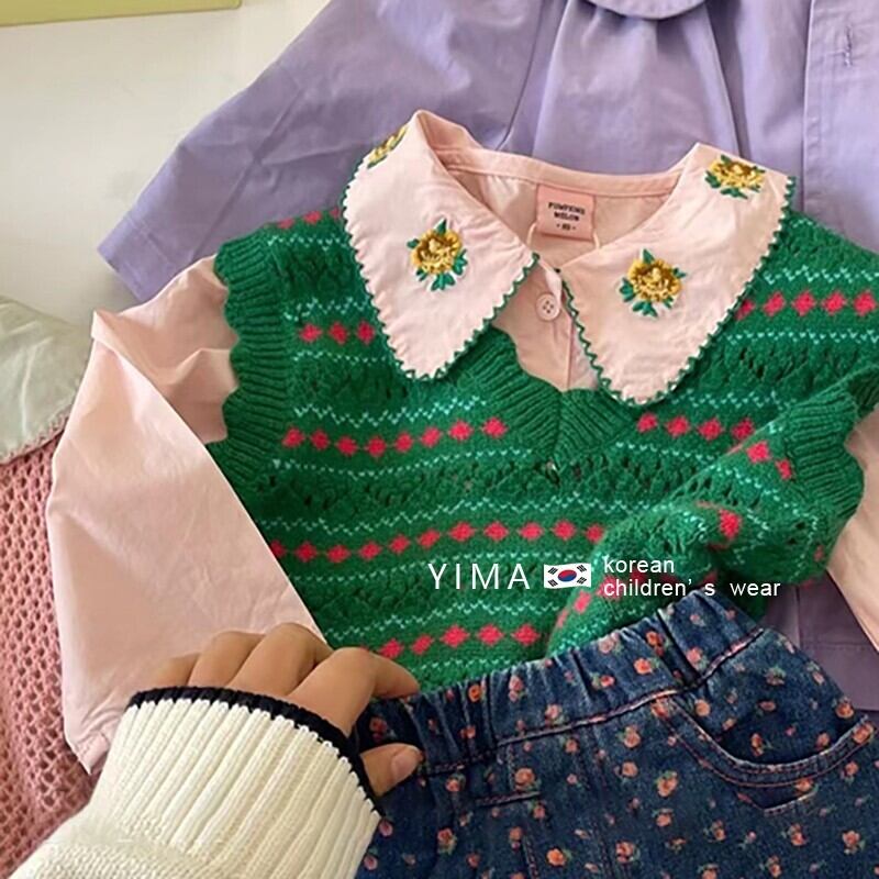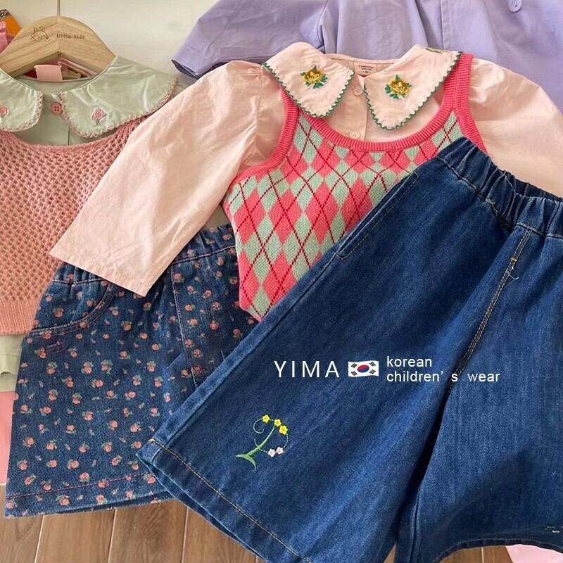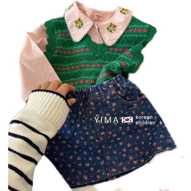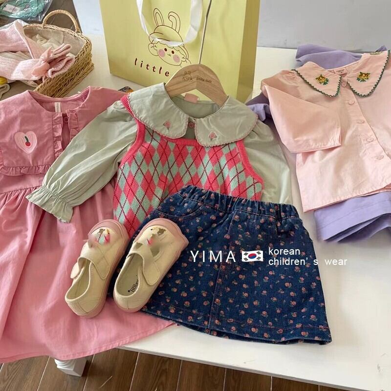 色:ピンクのシャツ,グリーンベスト,ブルーフローラルスカート,ピンクとグリーンのひし形のベスト