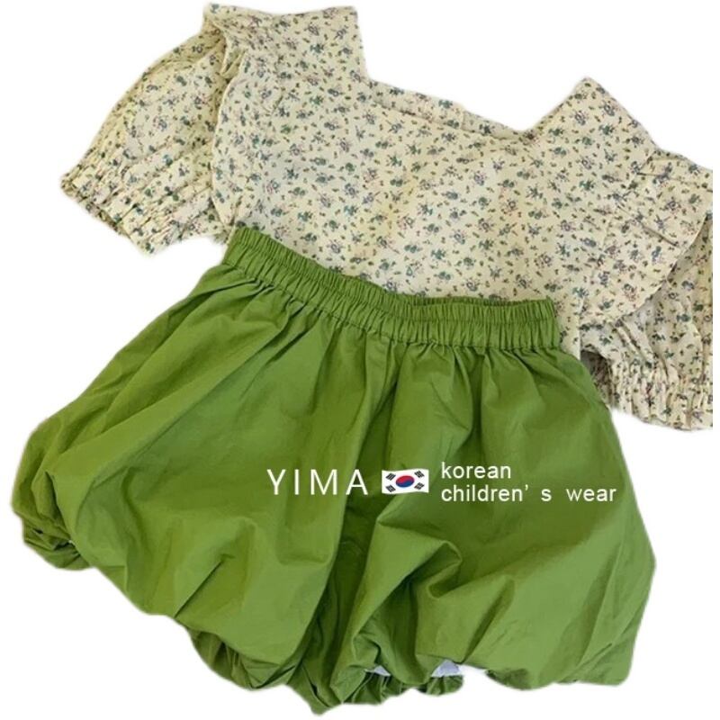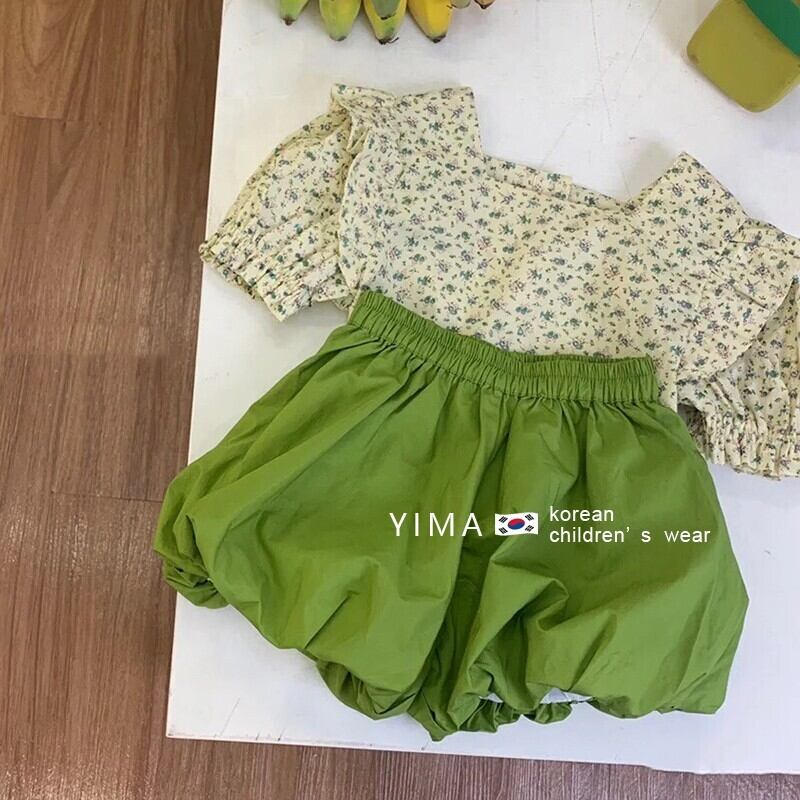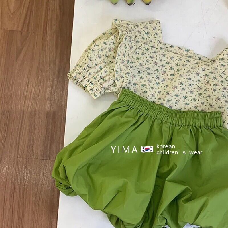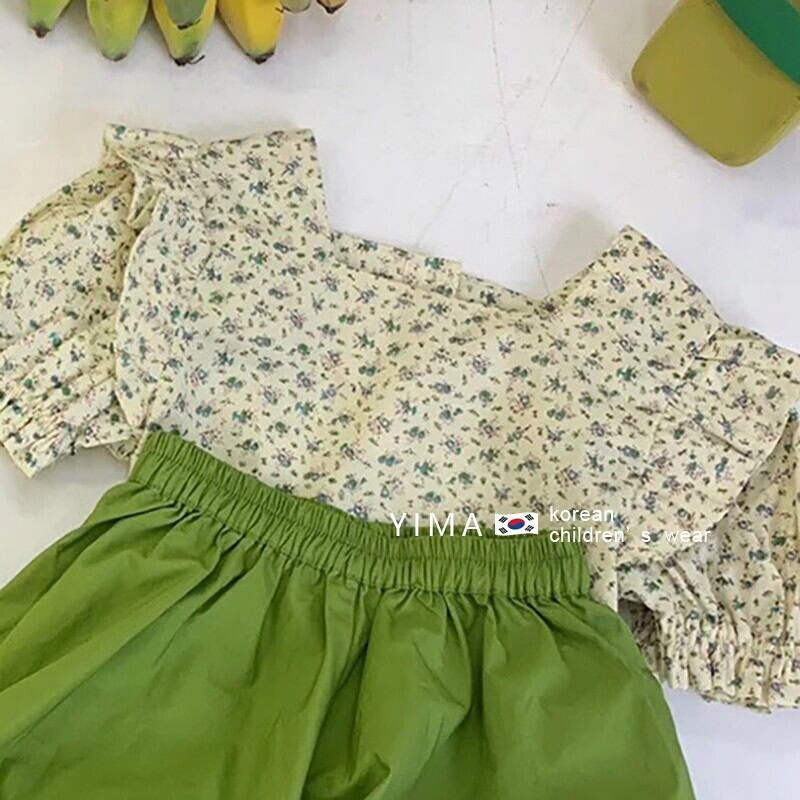 色:フローラルトップ,グリーンショートパンツ