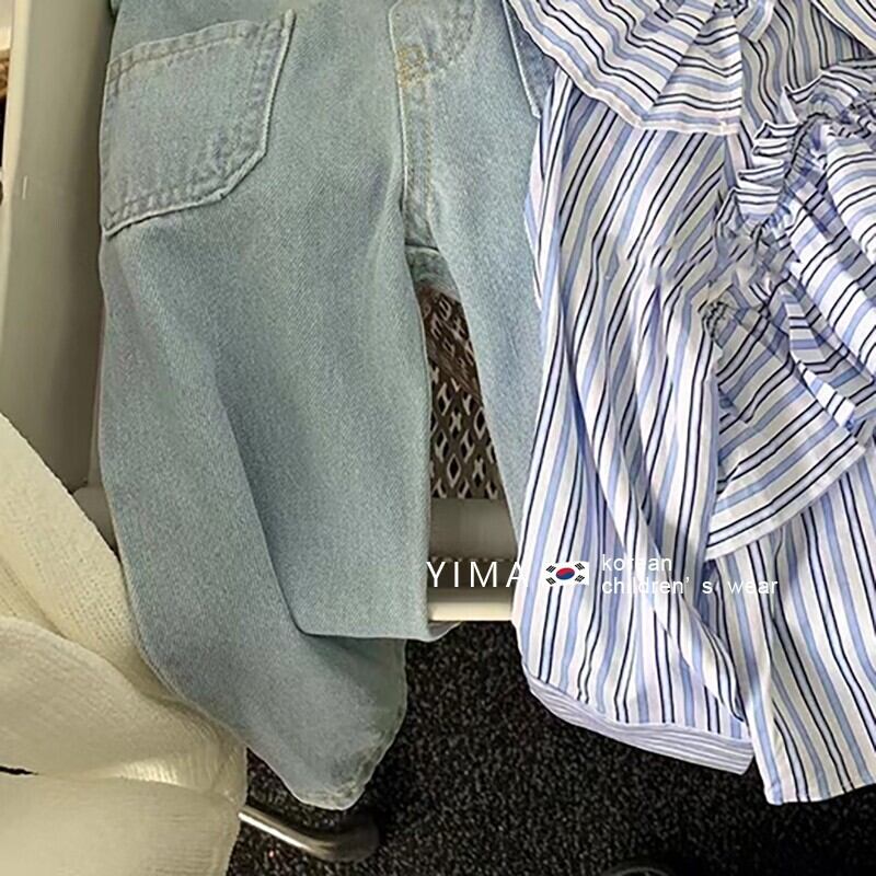 色:ブルーストライプシャツ,ライトブルージーンズ,ベージュパンツ
