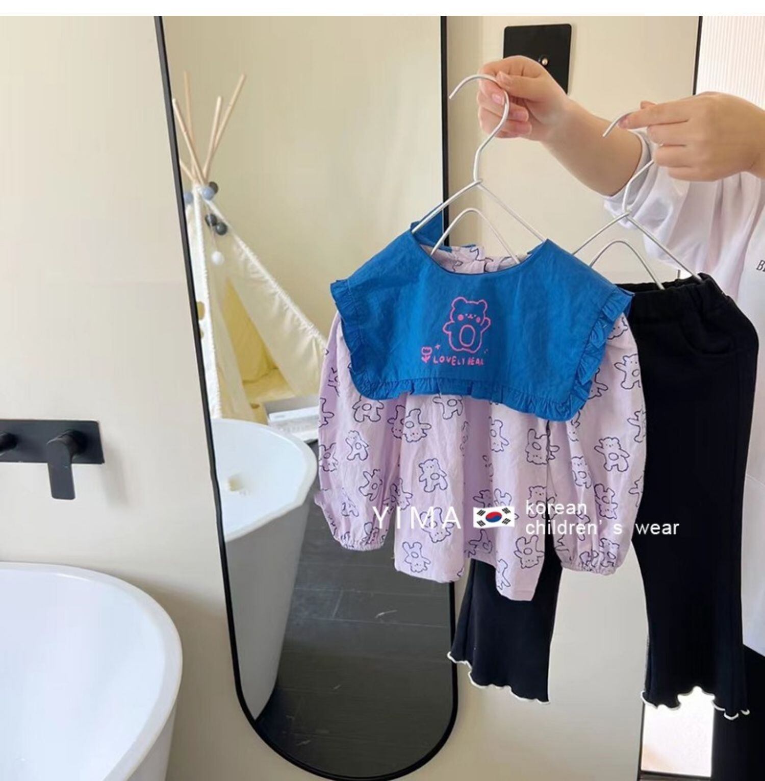 色:パウダーブルーのシャツ,黒いズボン