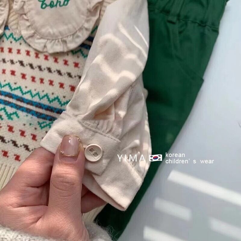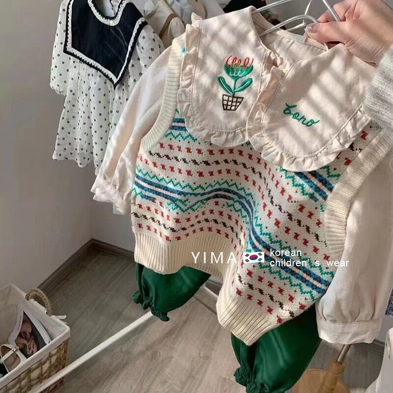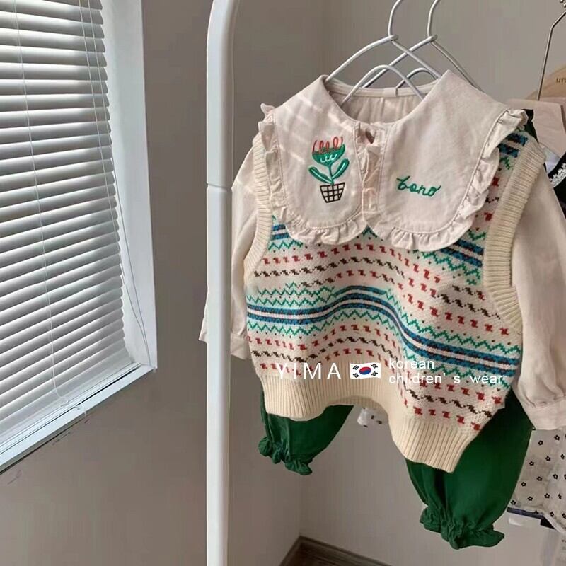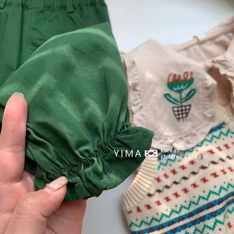 色:ベージュのニットベスト,ベージュのラペルシャツ,グリーンパンツ
