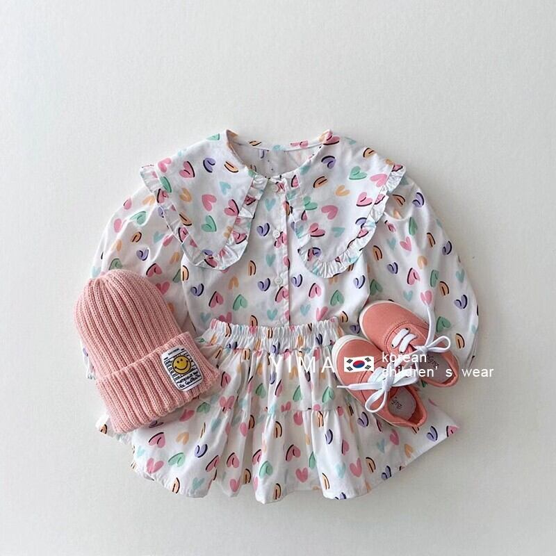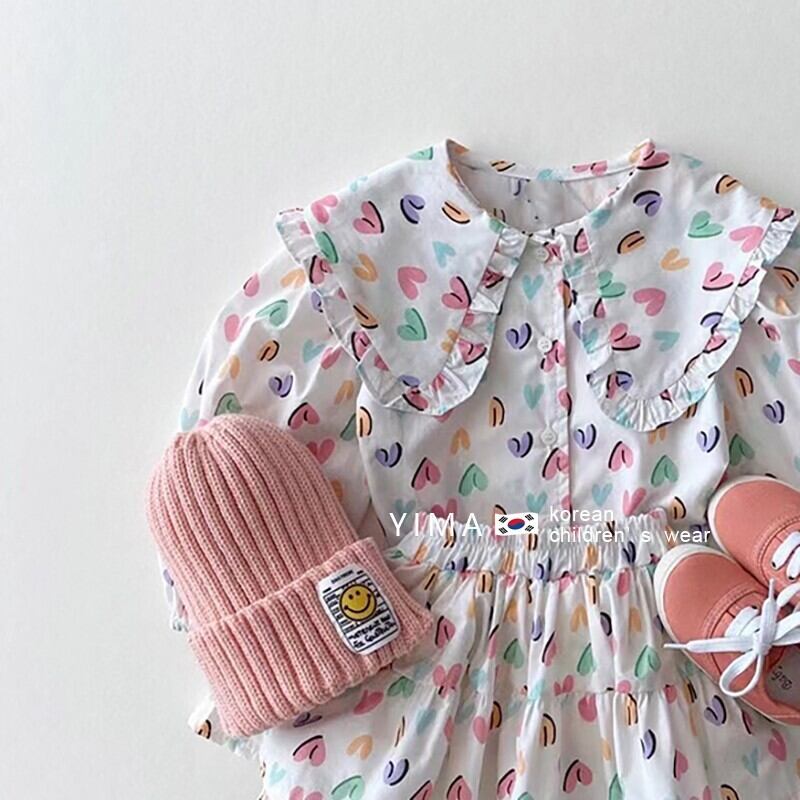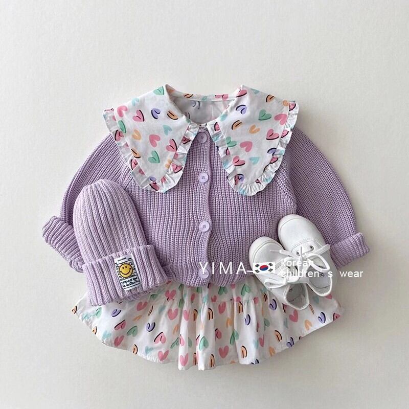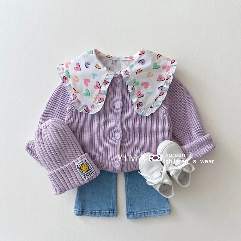 色:ホワイトプリントシャツ,ホワイトプリントスカート,パープルニットカーディガン,ブルージーンズ