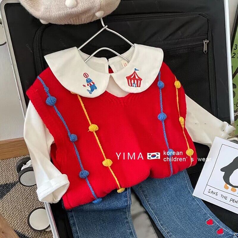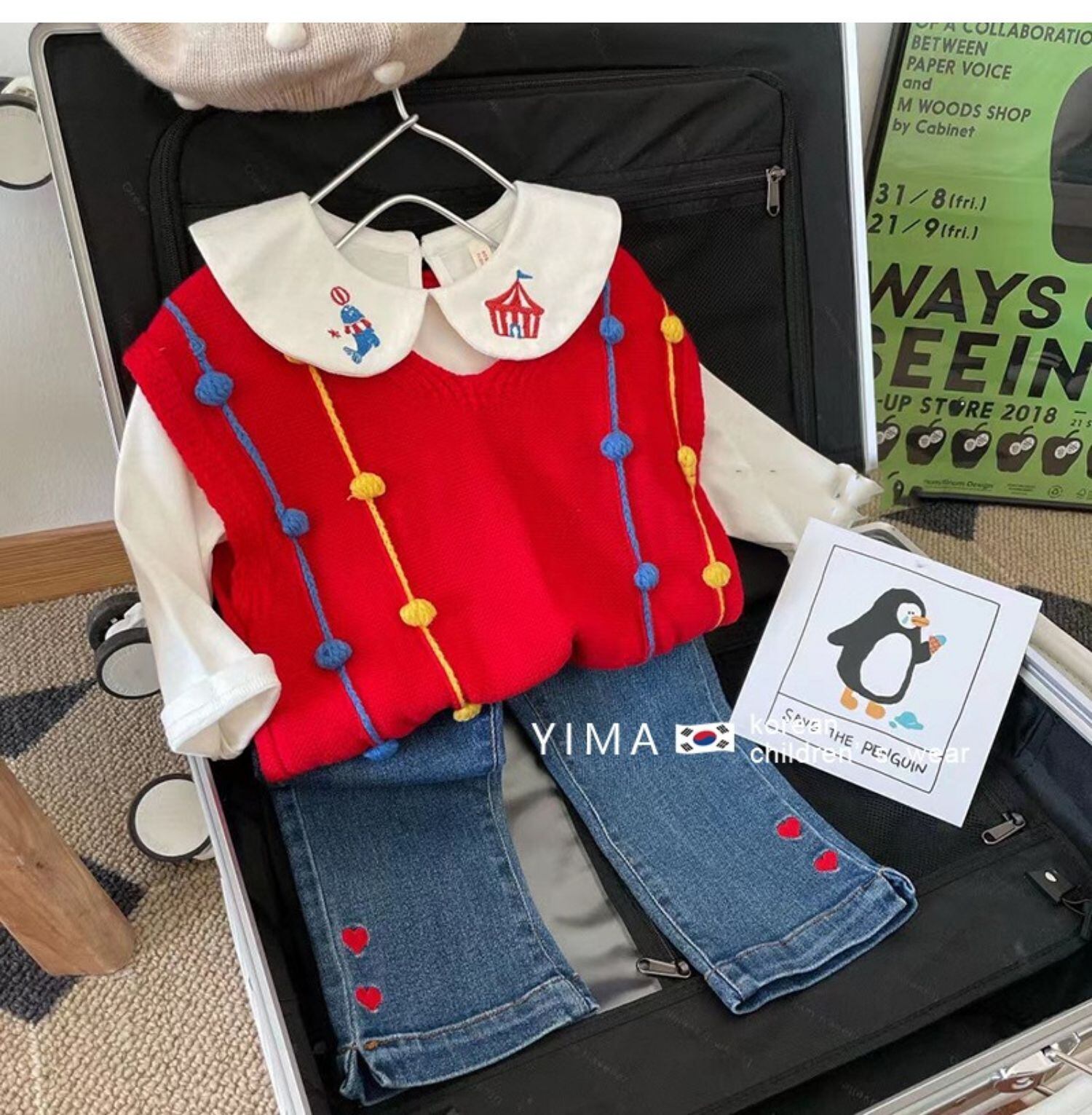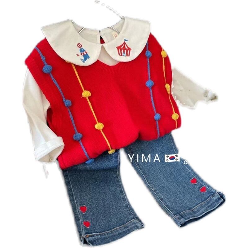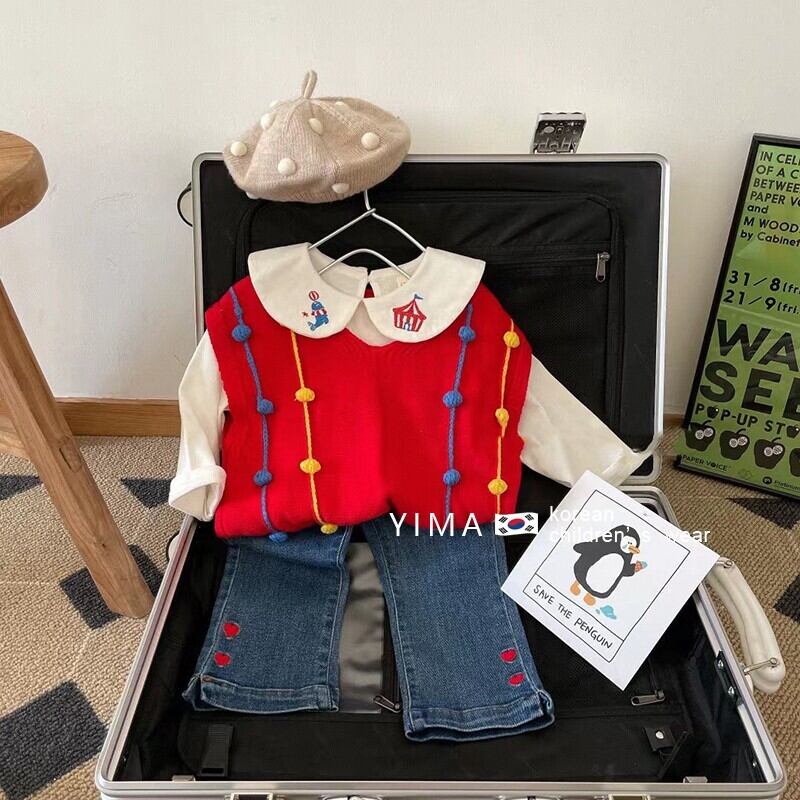 色:赤いベスト,オフホワイトドールカラートップ,ブルージーンズ