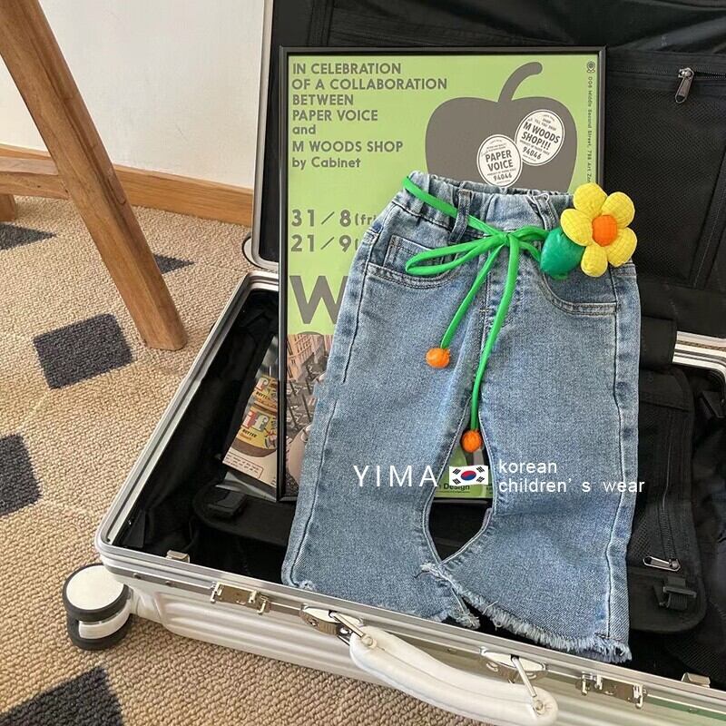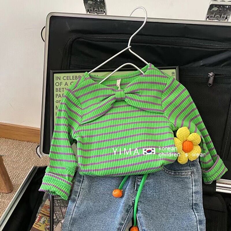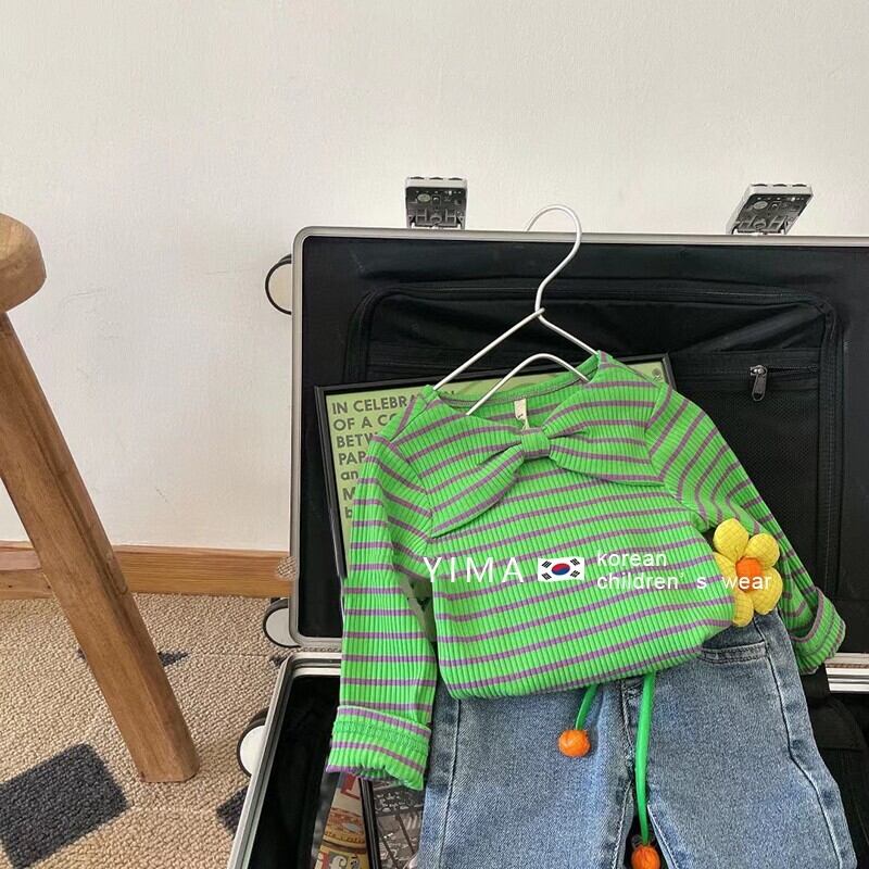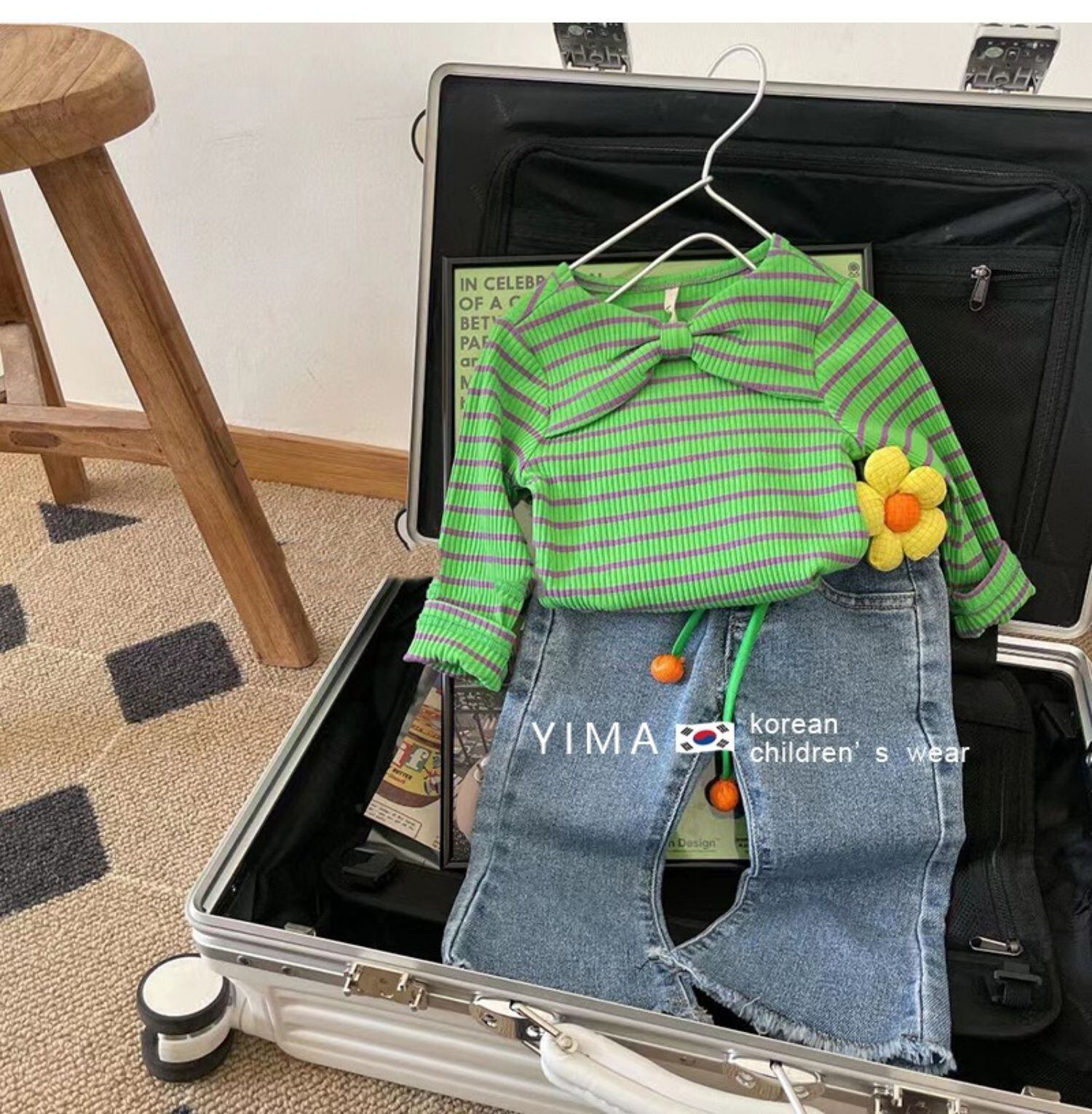 色:ブルージーンズ,グリーンストライプトップ