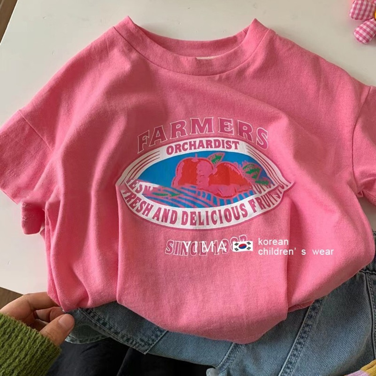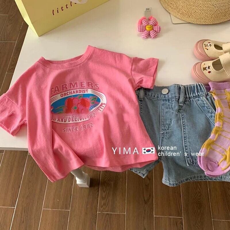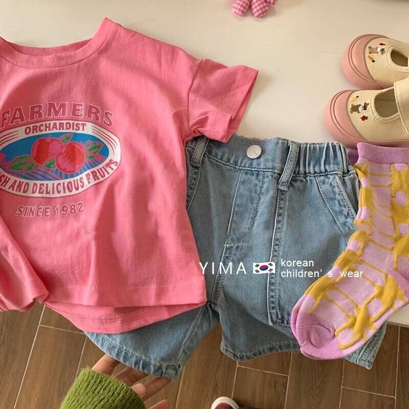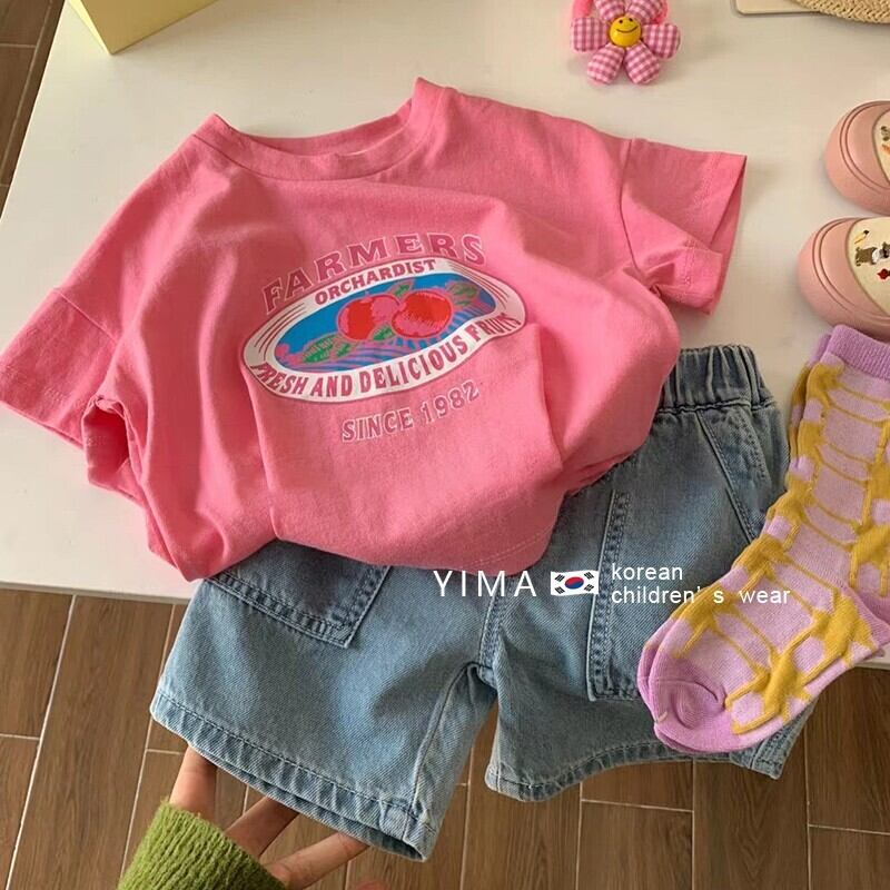色:ピンクのTシャツ,グレーブルーのショートパンツ
