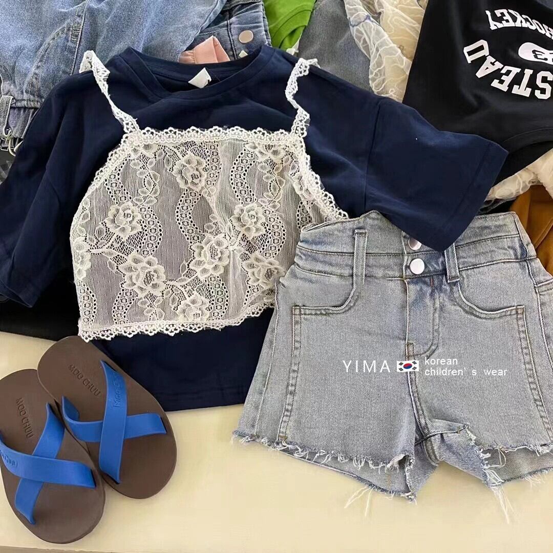 色:ブラックトップ,ベリーパープルトップ,水色のショートパンツ,ホワイトレースサスペンダー