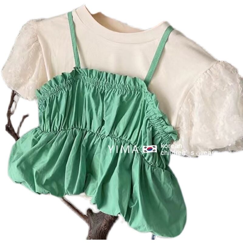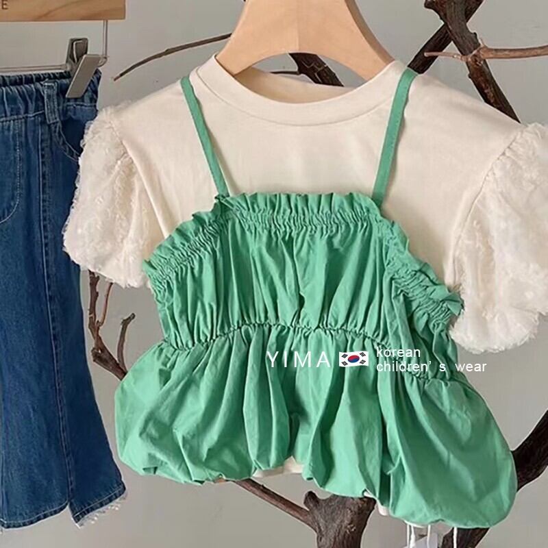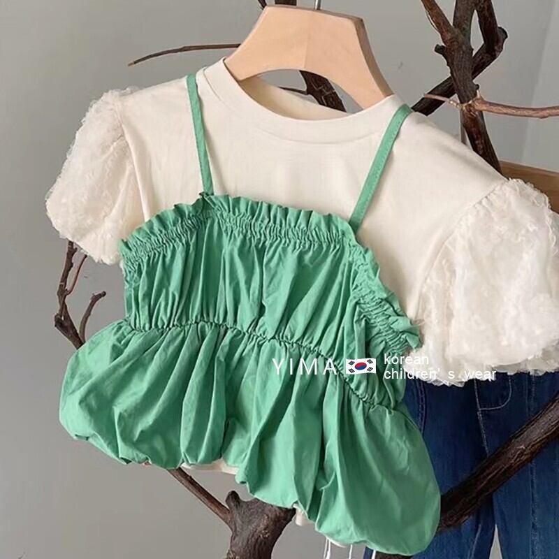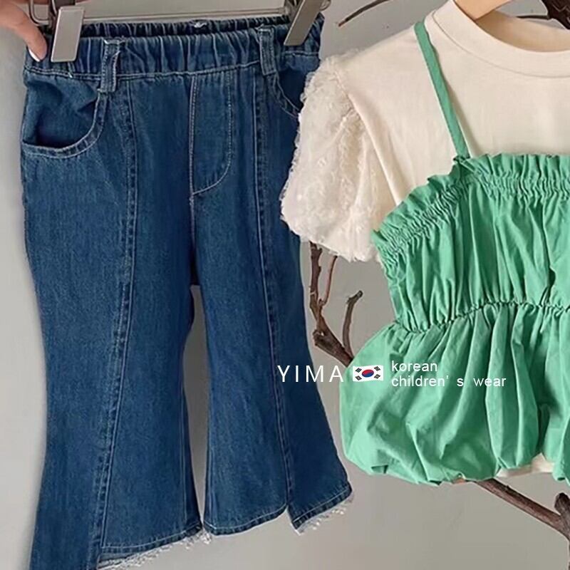色:白と緑のフェイクツーピーストップ,ブルージーンズ
