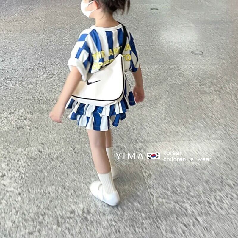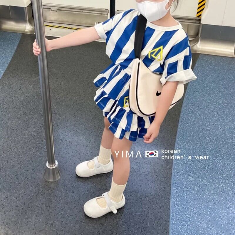 色:ブルートップ,青いスカート,青と白のストライプのスーツ