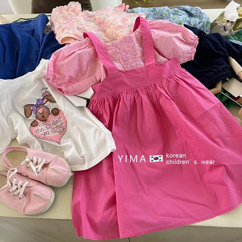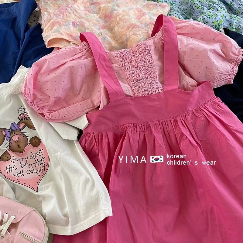 色:ローズレッドのサスペンダースカート,ピンクのシャツ,白いTシャツ