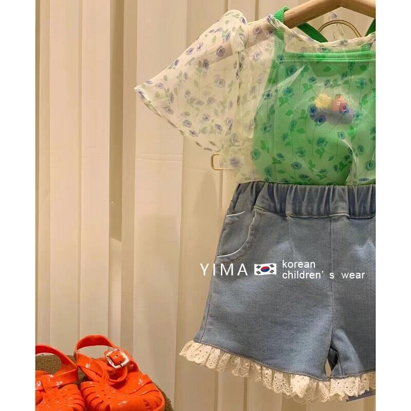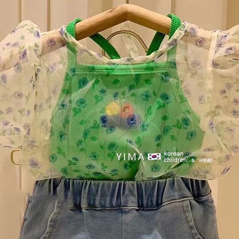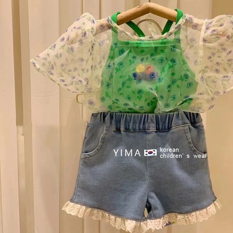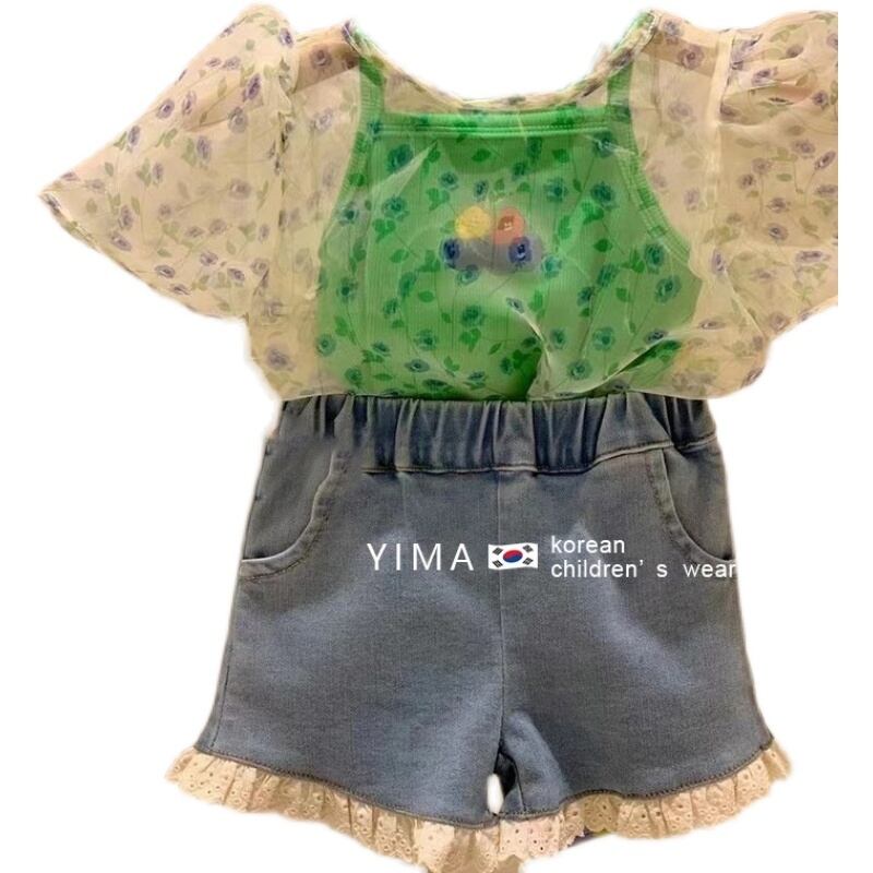 色:グリーンサスペンダー+フローラルブラウス,ブルーショートパンツ