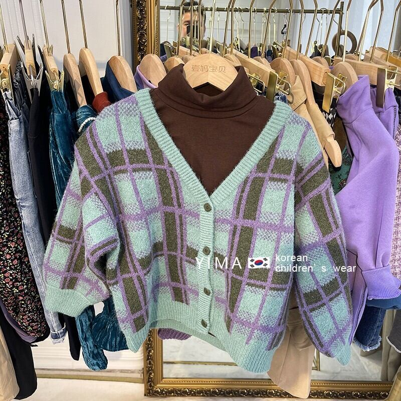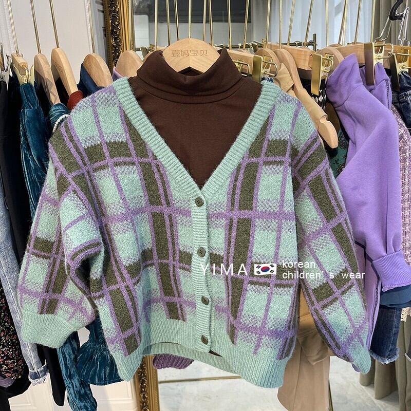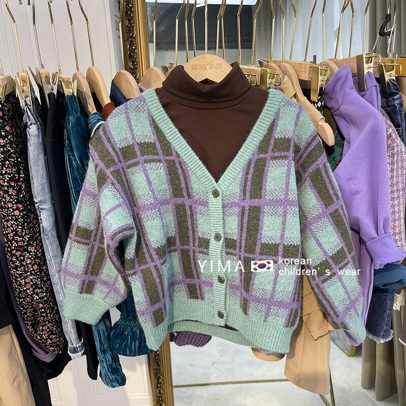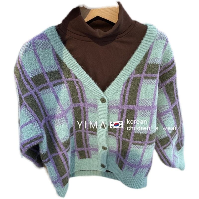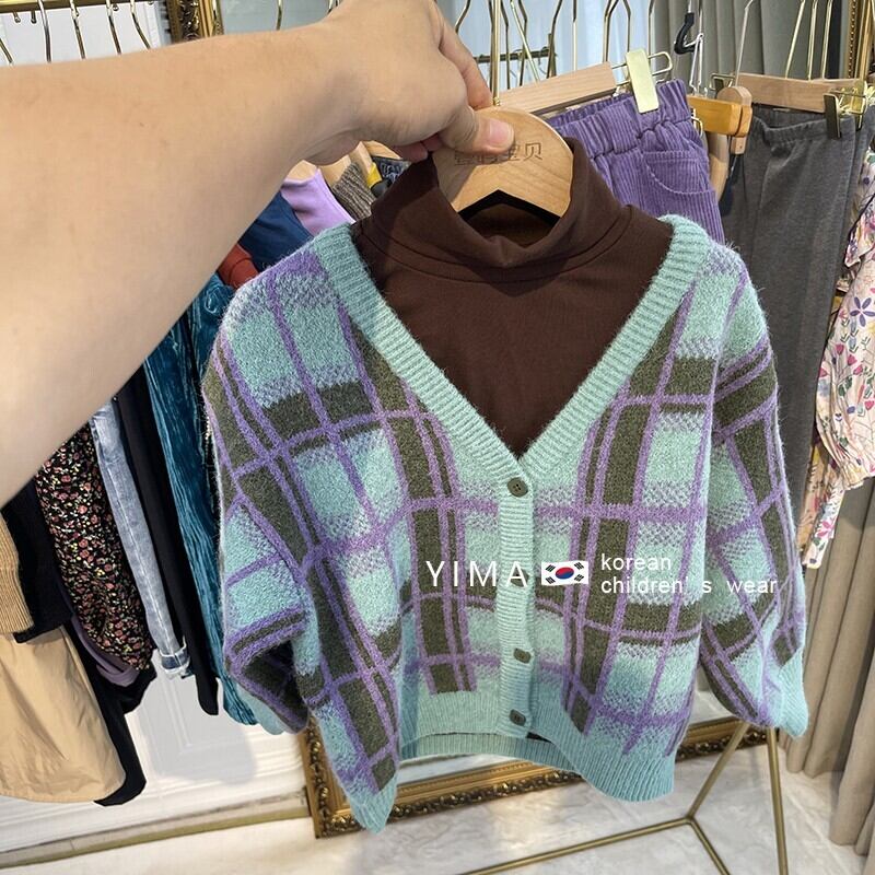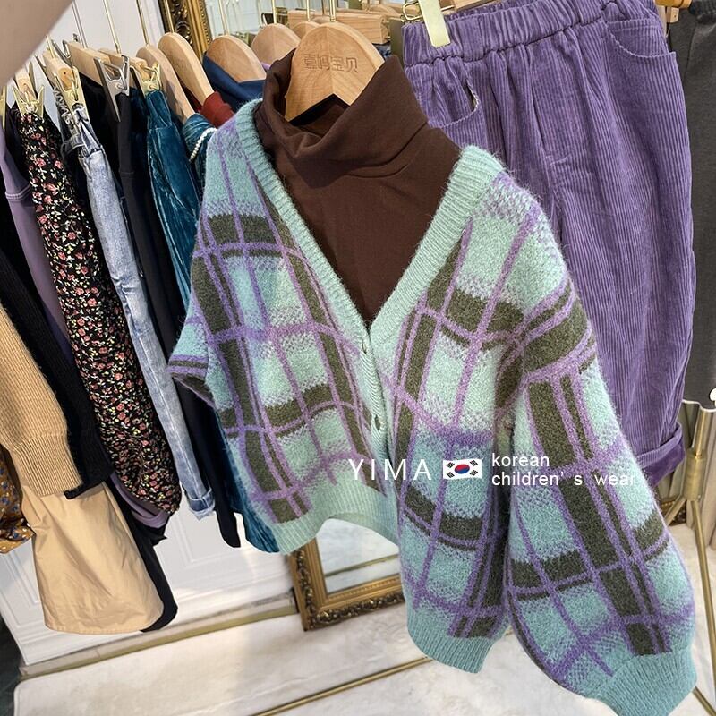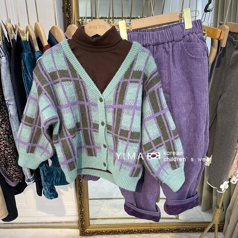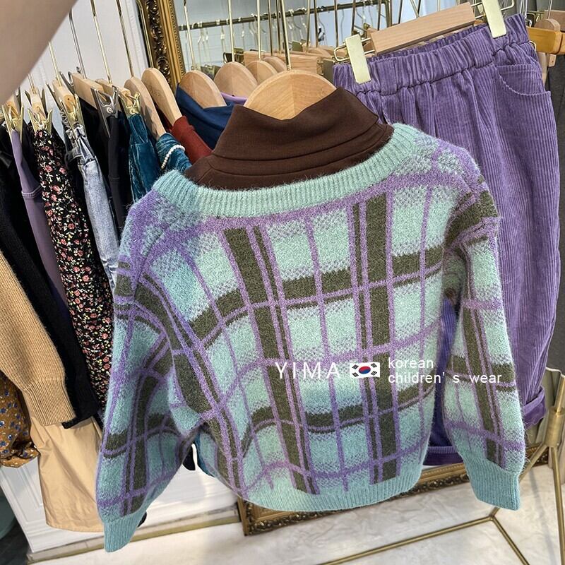 色:青い格子縞のセーター,Ceeカラーボトムスシャツ,パープルフリースパンツ