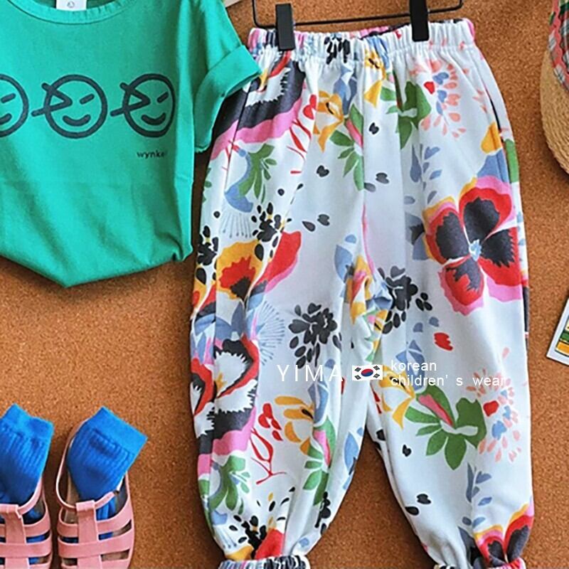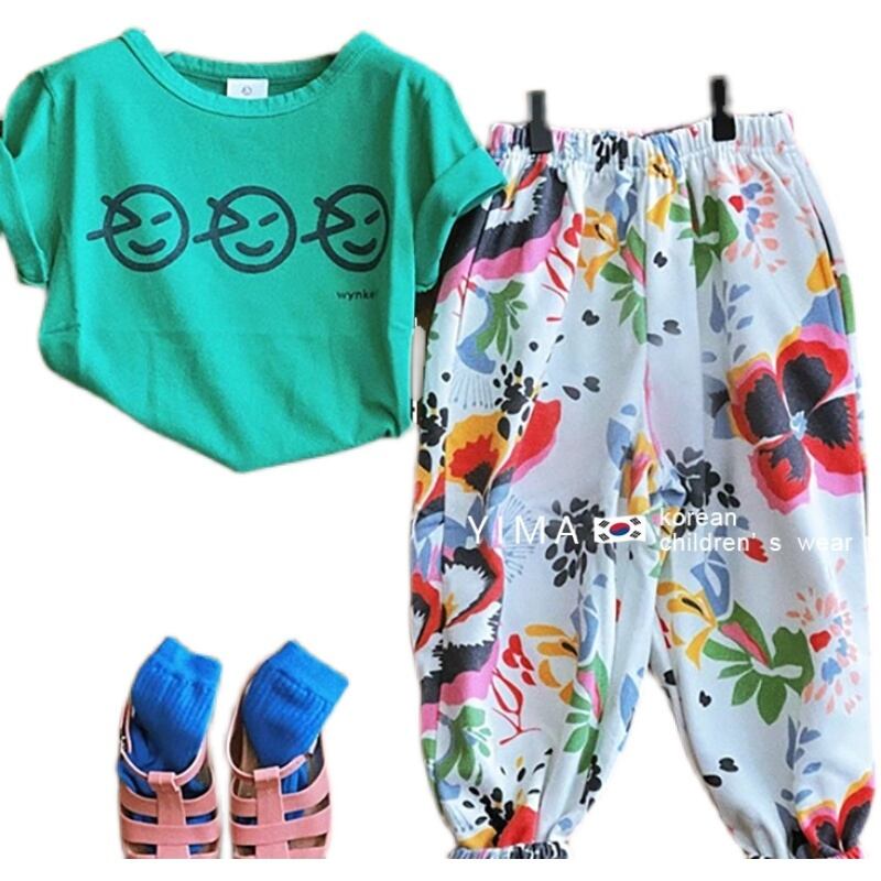 色:緑の半袖,白い花柄パンツ