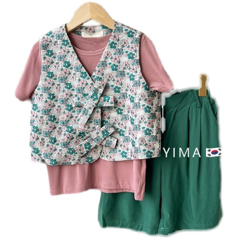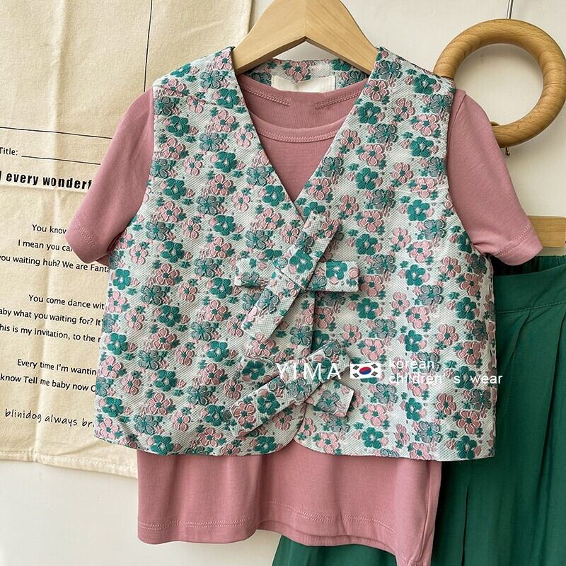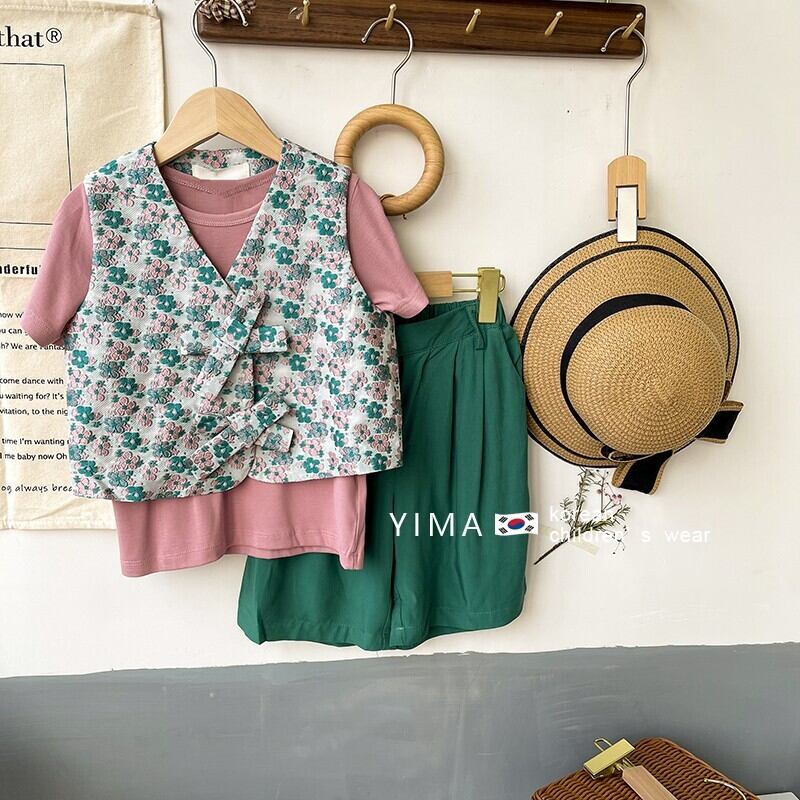 色:緑の花のベスト,グリーンショートパンツ,ピンクの半袖