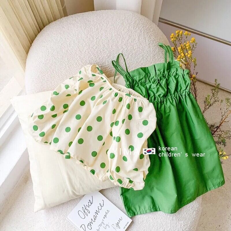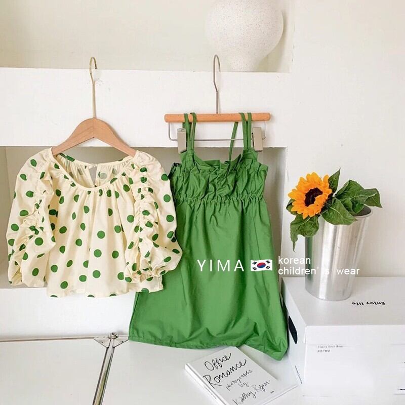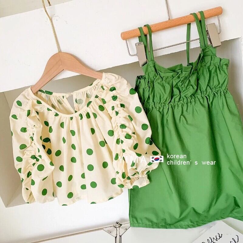 色:水玉トップ,緑のドレス