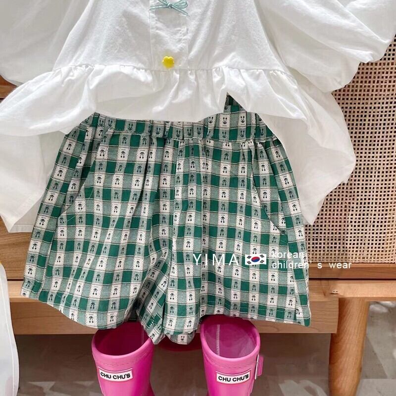 色:白のシャツ,グリーンショートパンツ