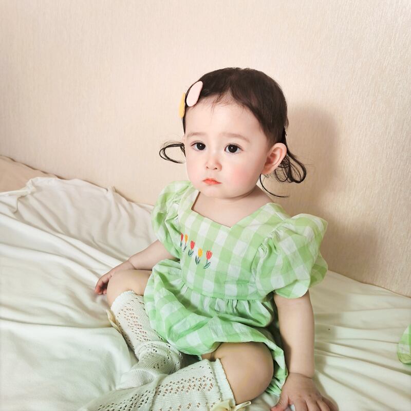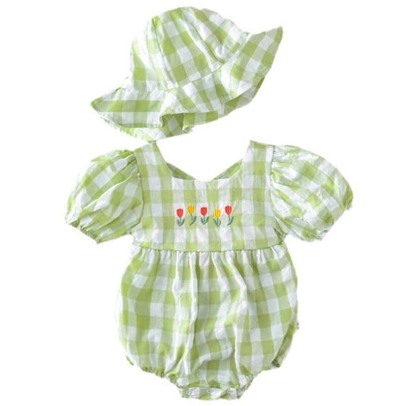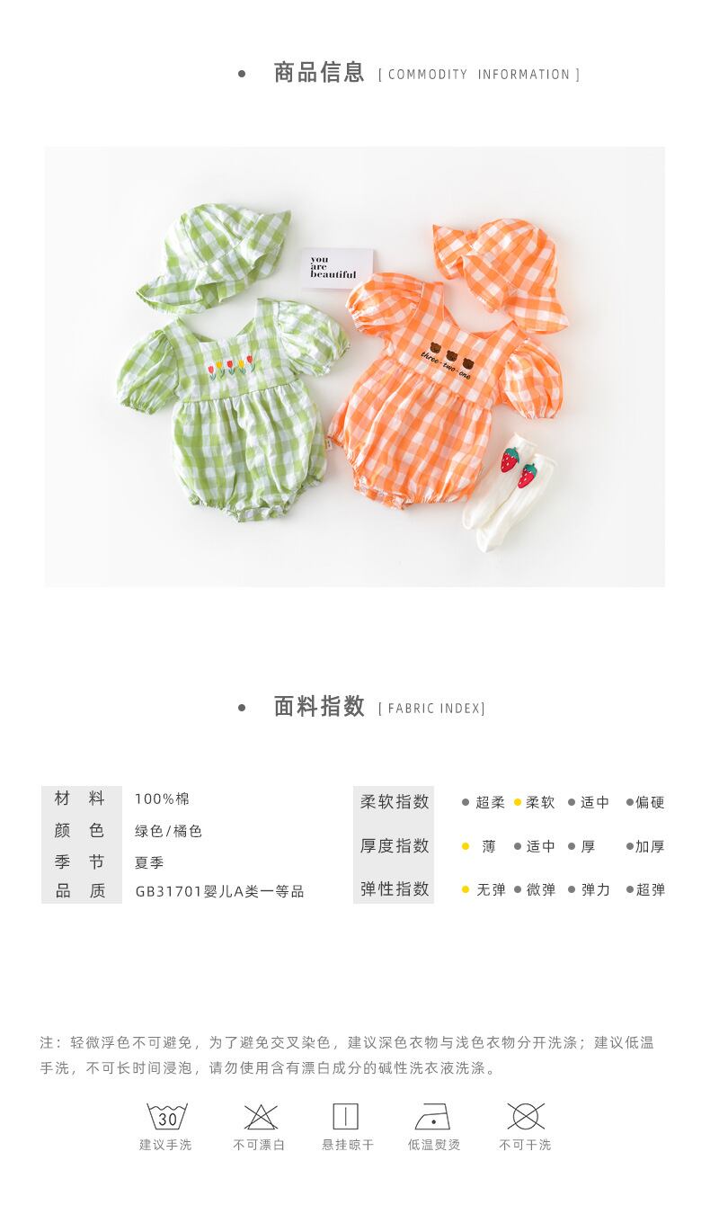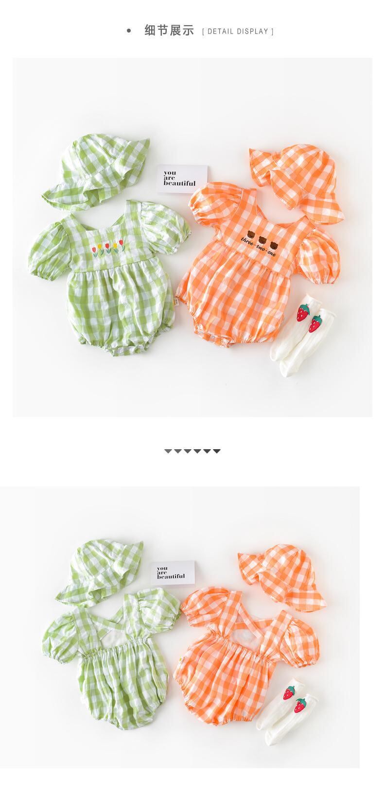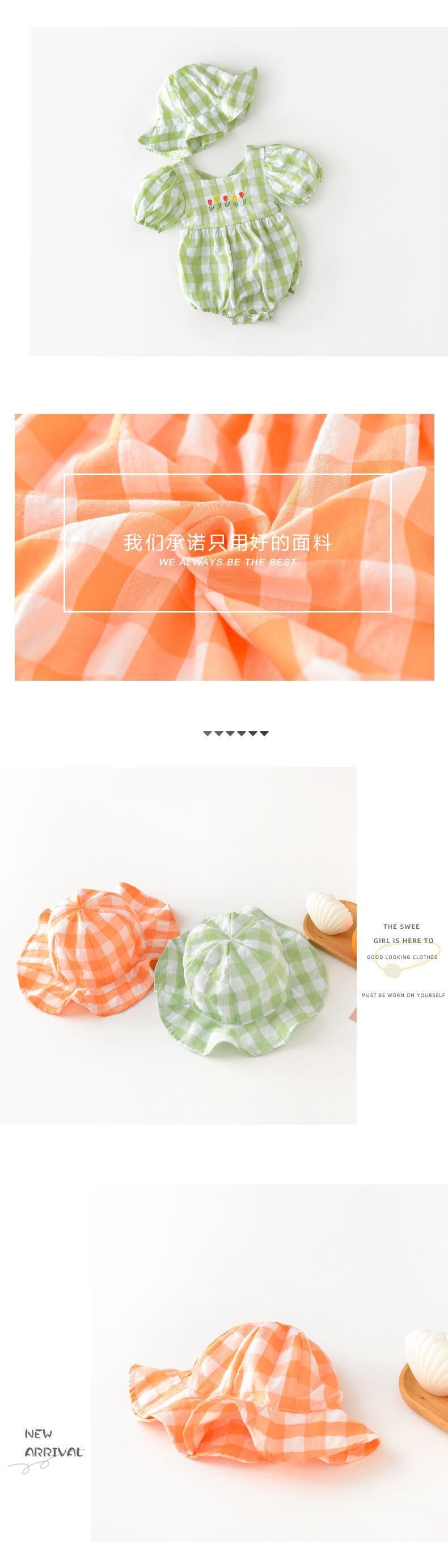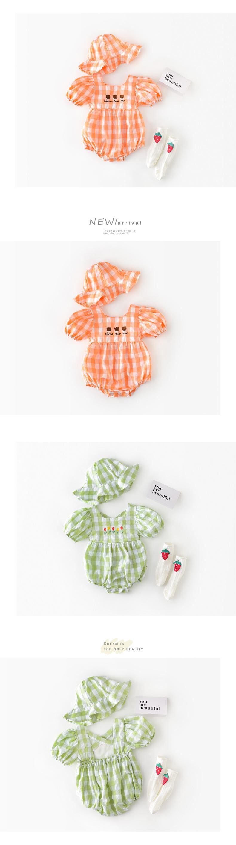 色:帽子付きオレンジロンパース,帽子と緑のロンパース
