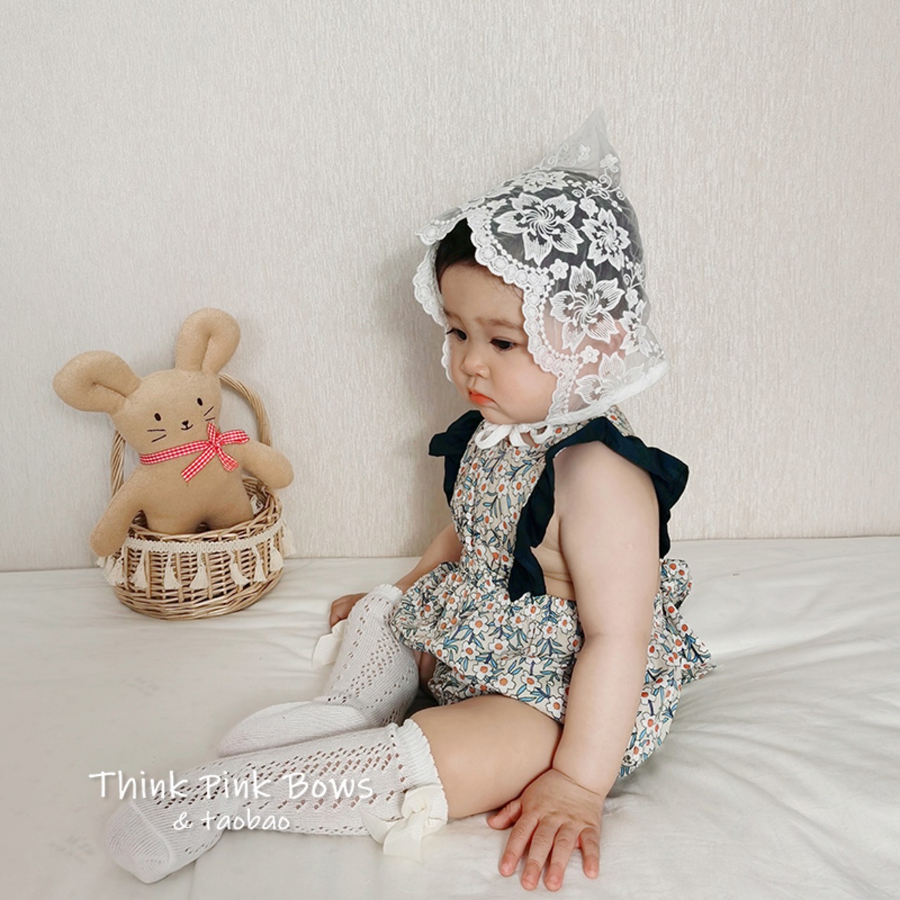 色:ダークグリーンのフリンジフローラルレースアップロンパース,ロンパース+帽子なしの靴下
