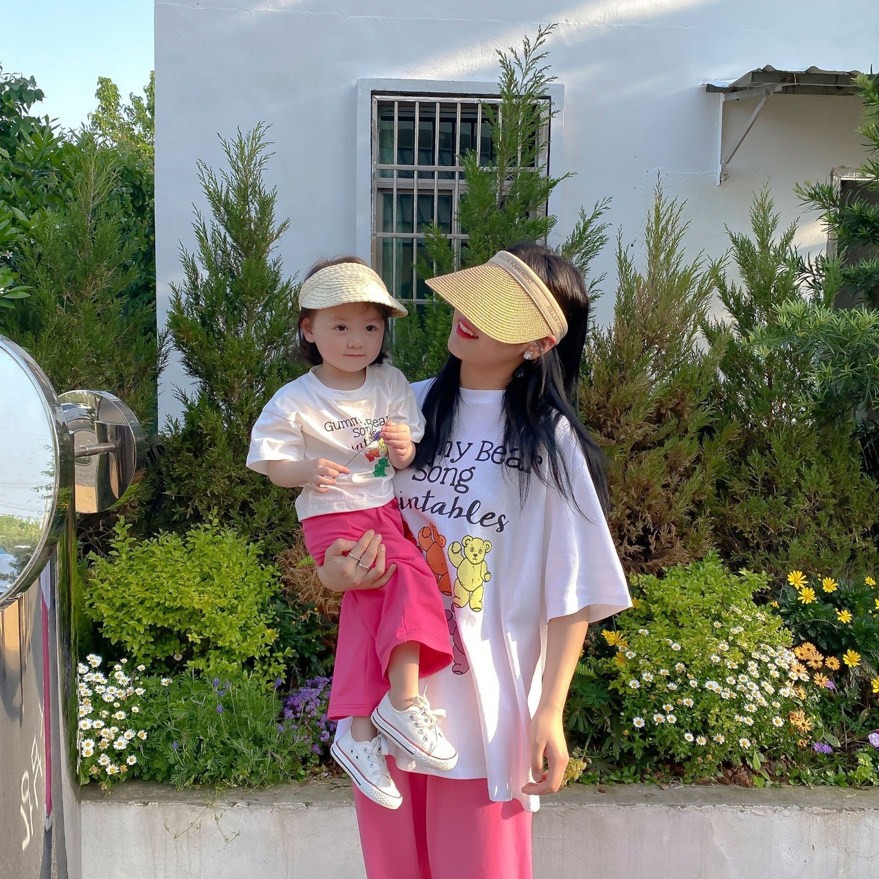 色:カラフルなクマのTシャツ(ベビーカラーが優先),ローズレッドパンツ(ベビーカラーが優勢)