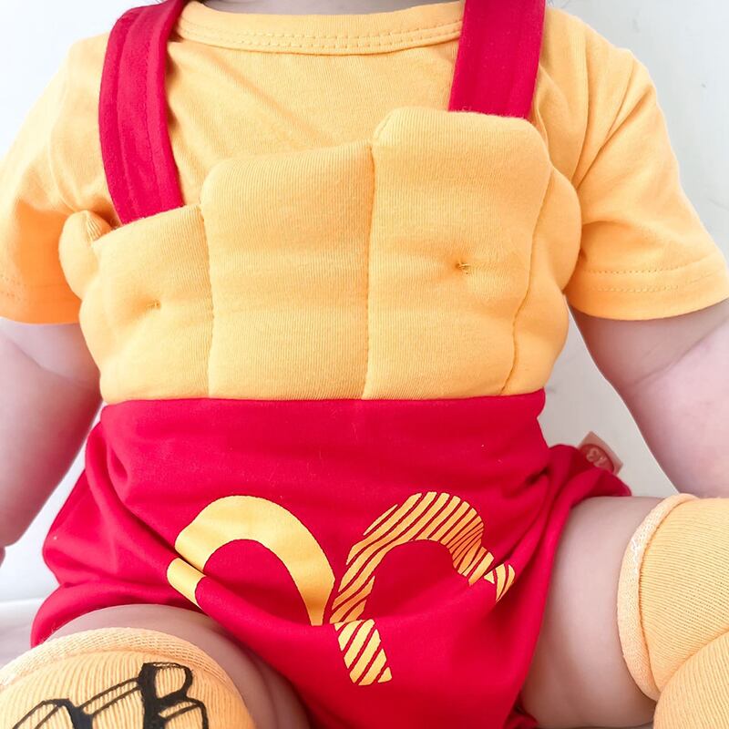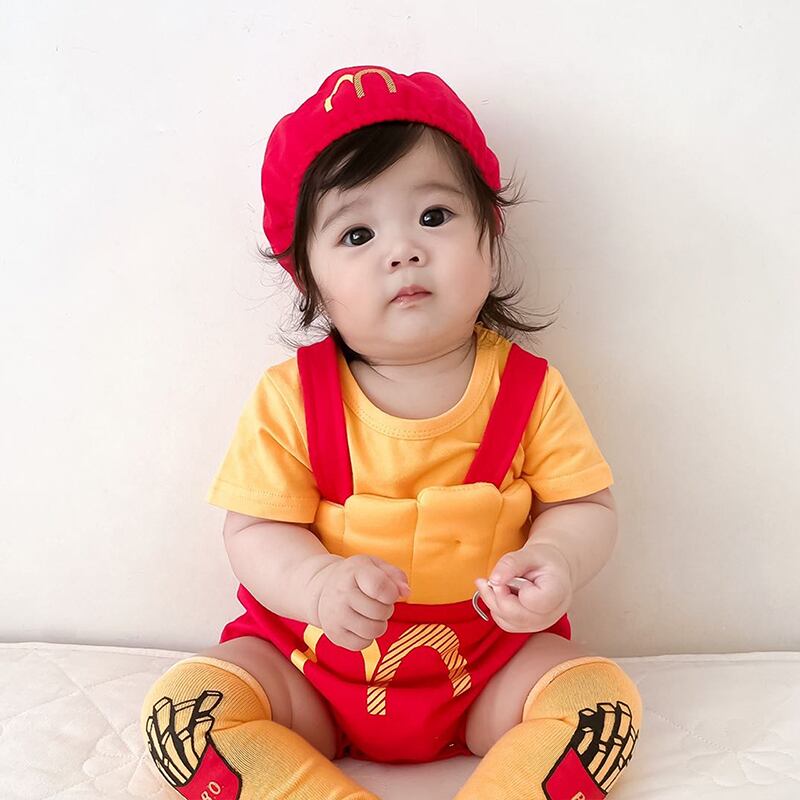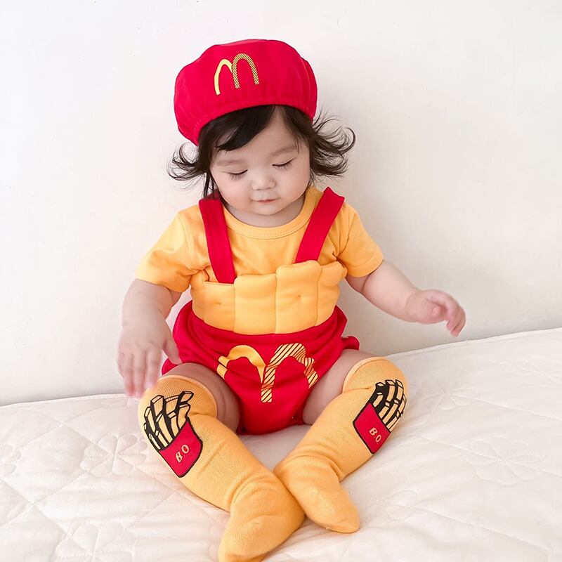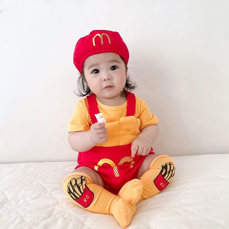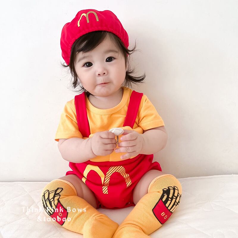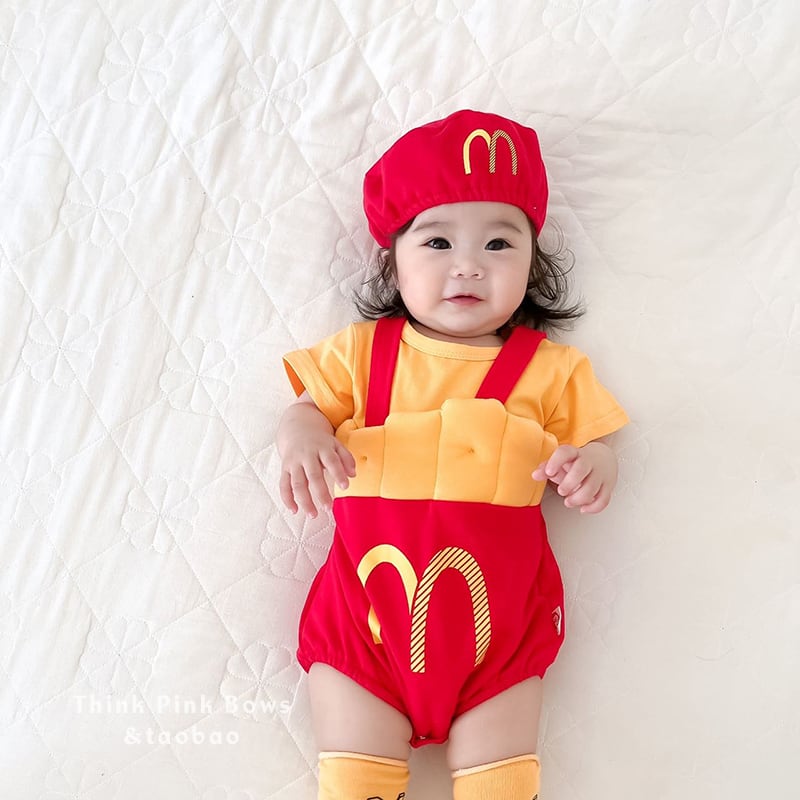 色:フライドポテトの帽子+ロンパース,黄色の半袖Tシャツ,フライドポテト,ロンパース+帽子+ショートイエローTシャツ,ロンパース+帽子+Tシャツ+靴下