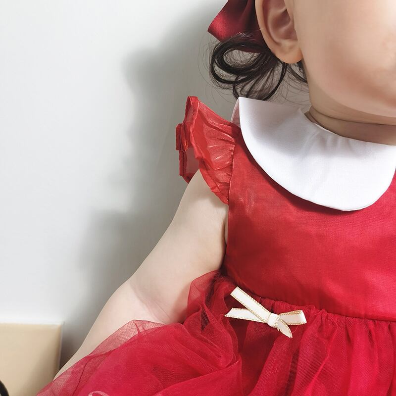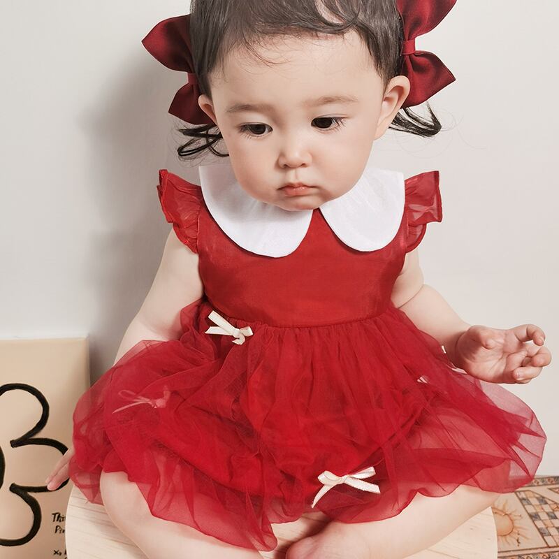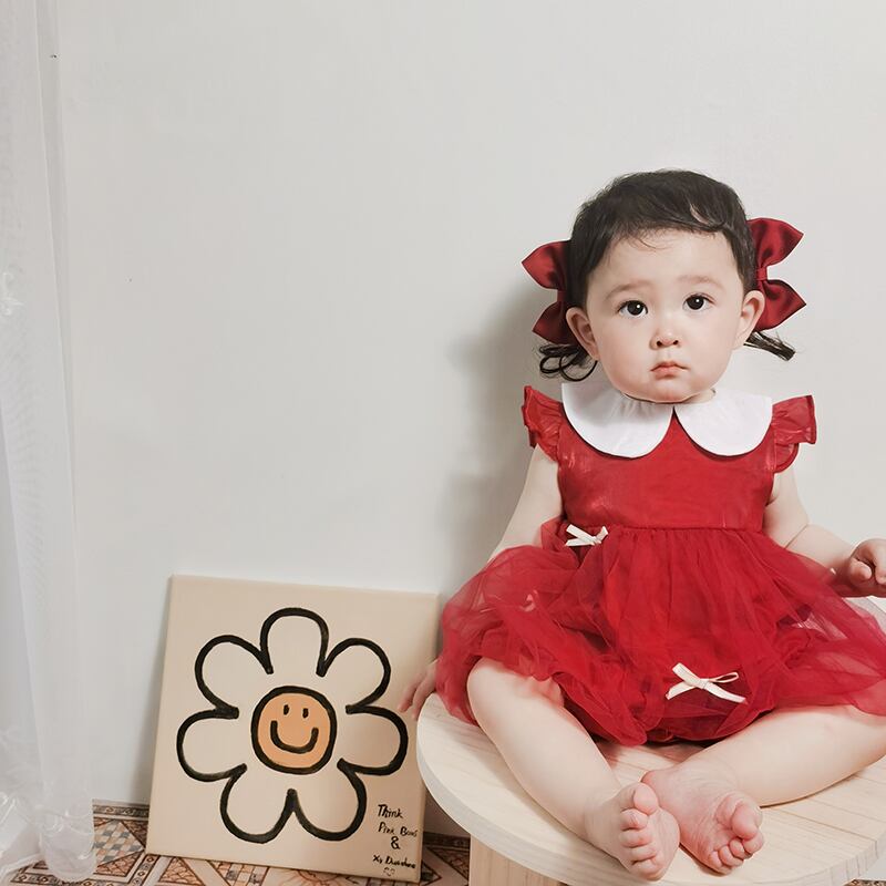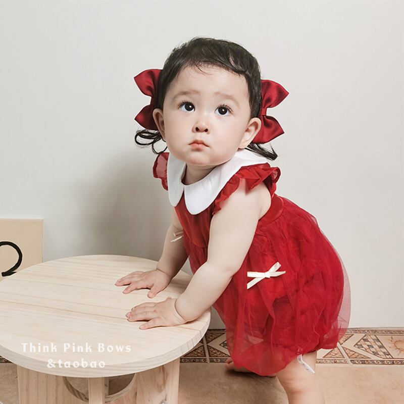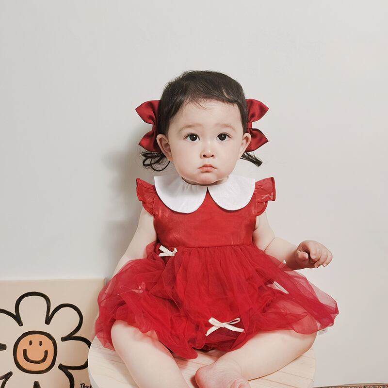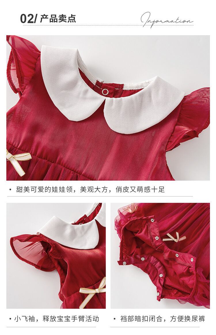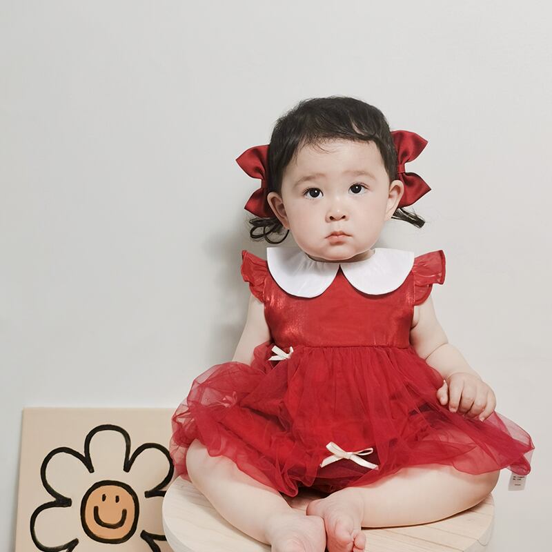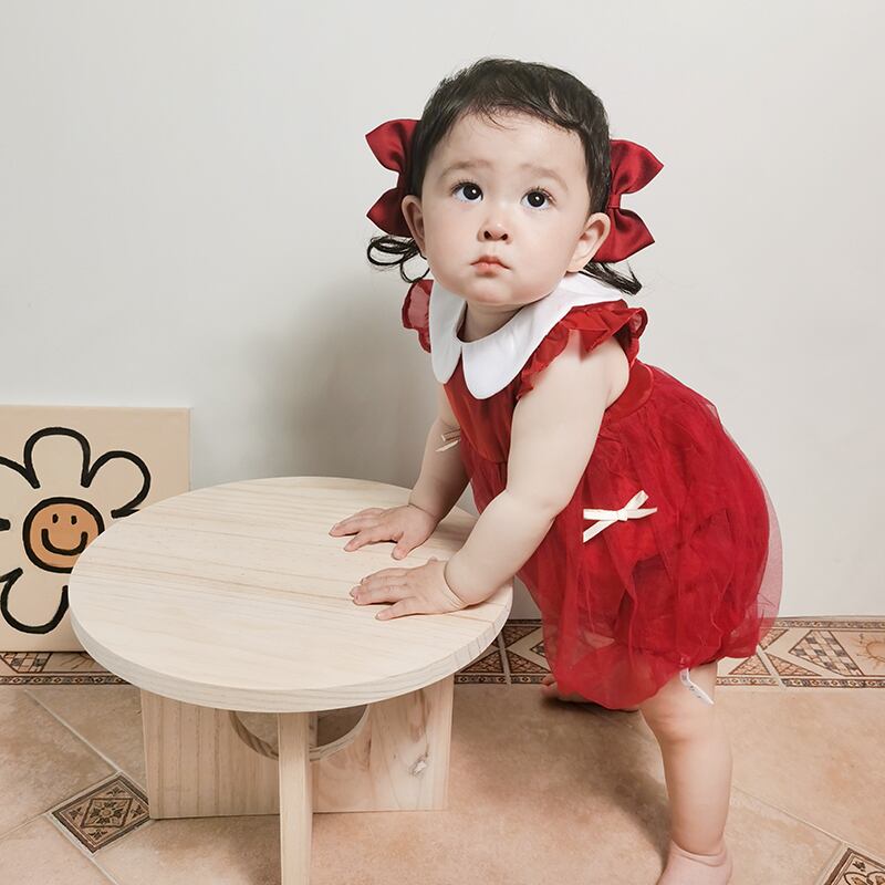 色:ブルゴーニュメッシュボウ半袖ロンパース