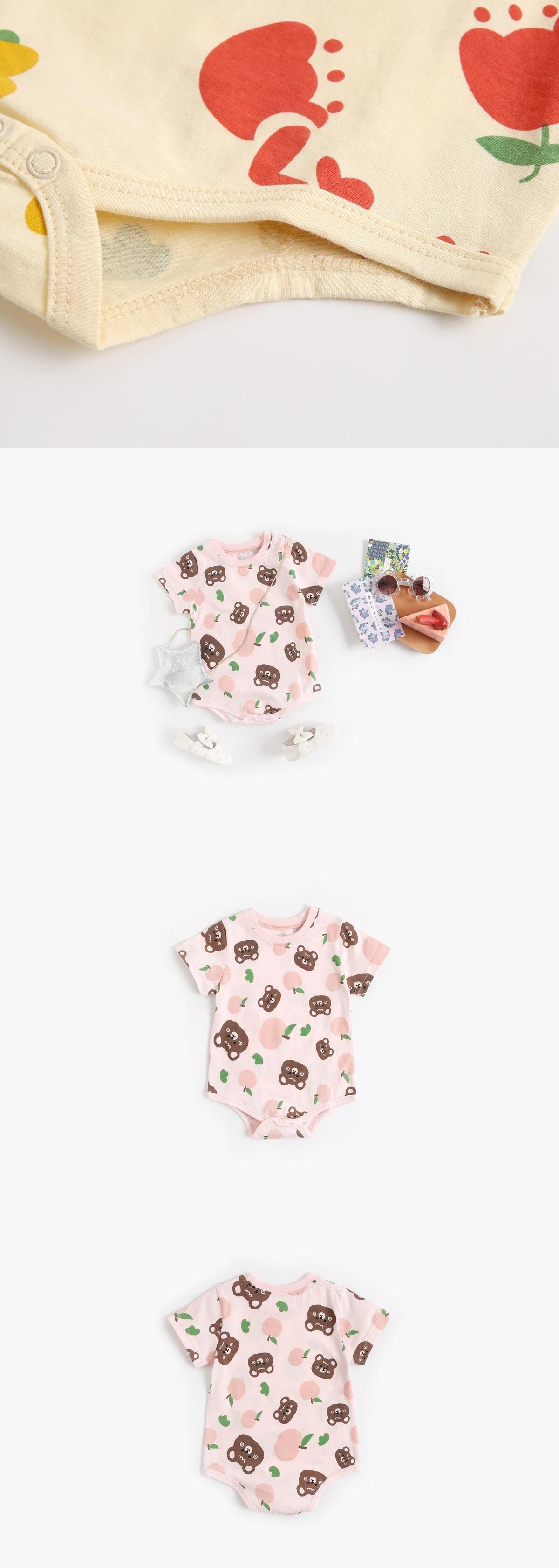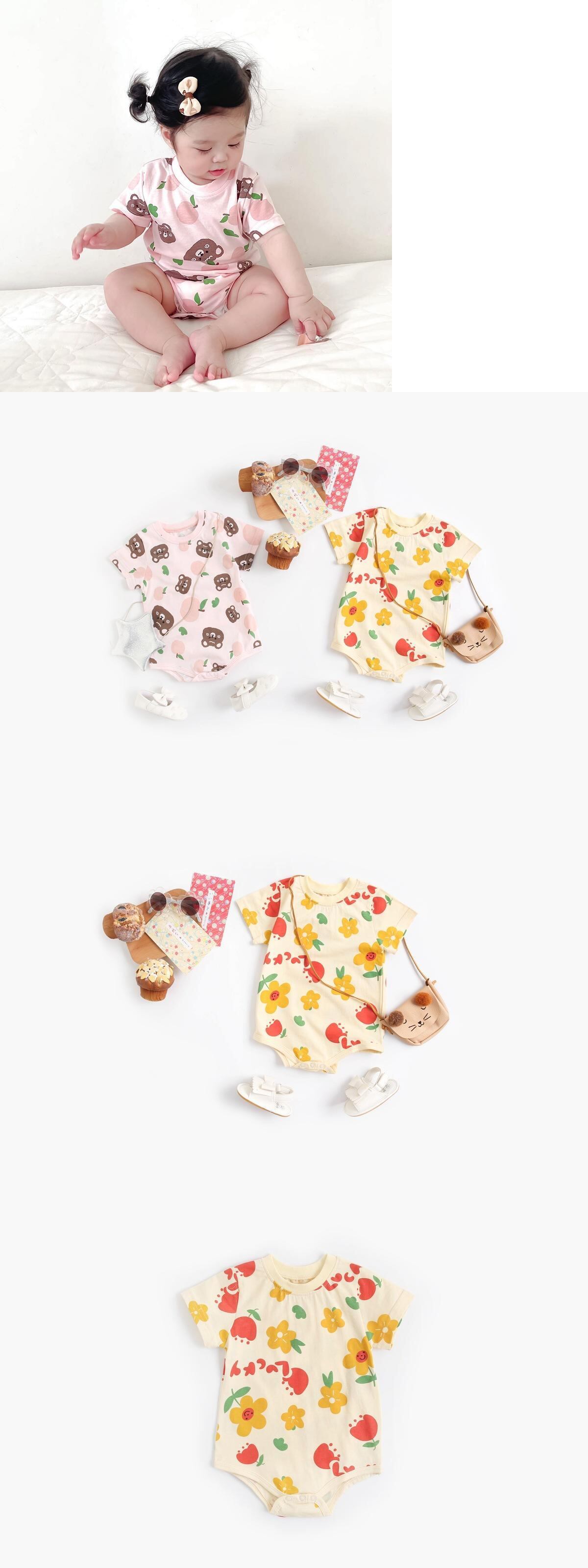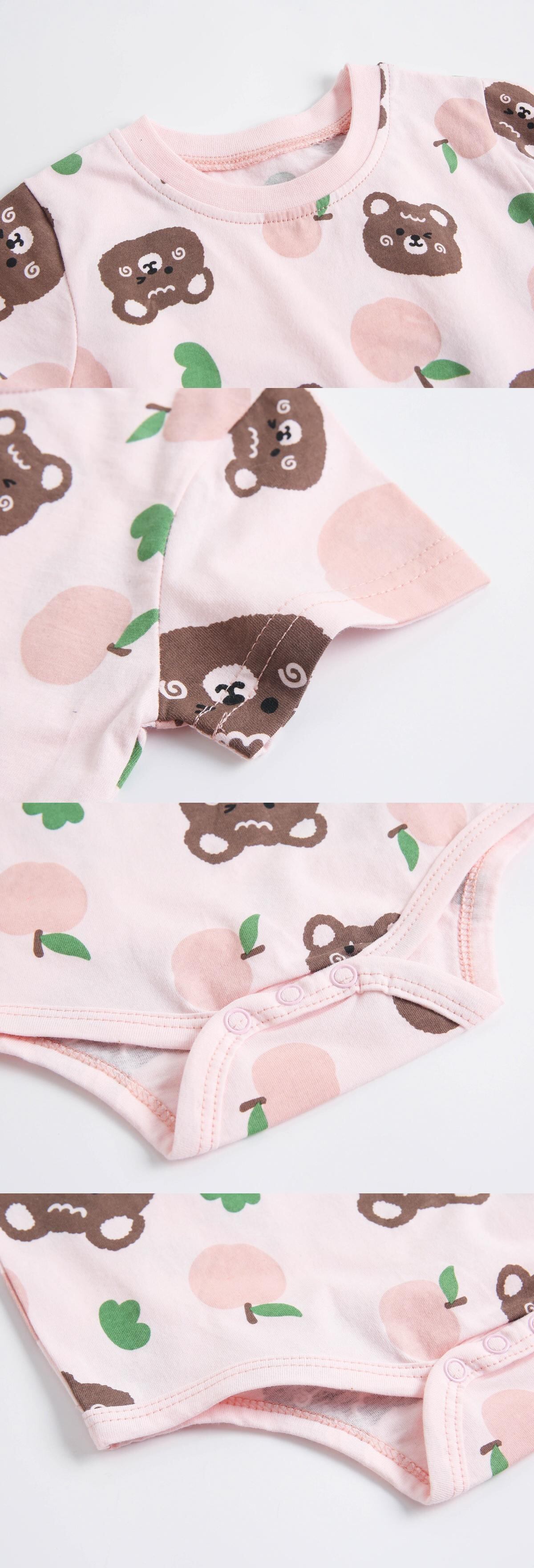 色:アプリコットフラワーロンパース,ピンクのクマのロンパース