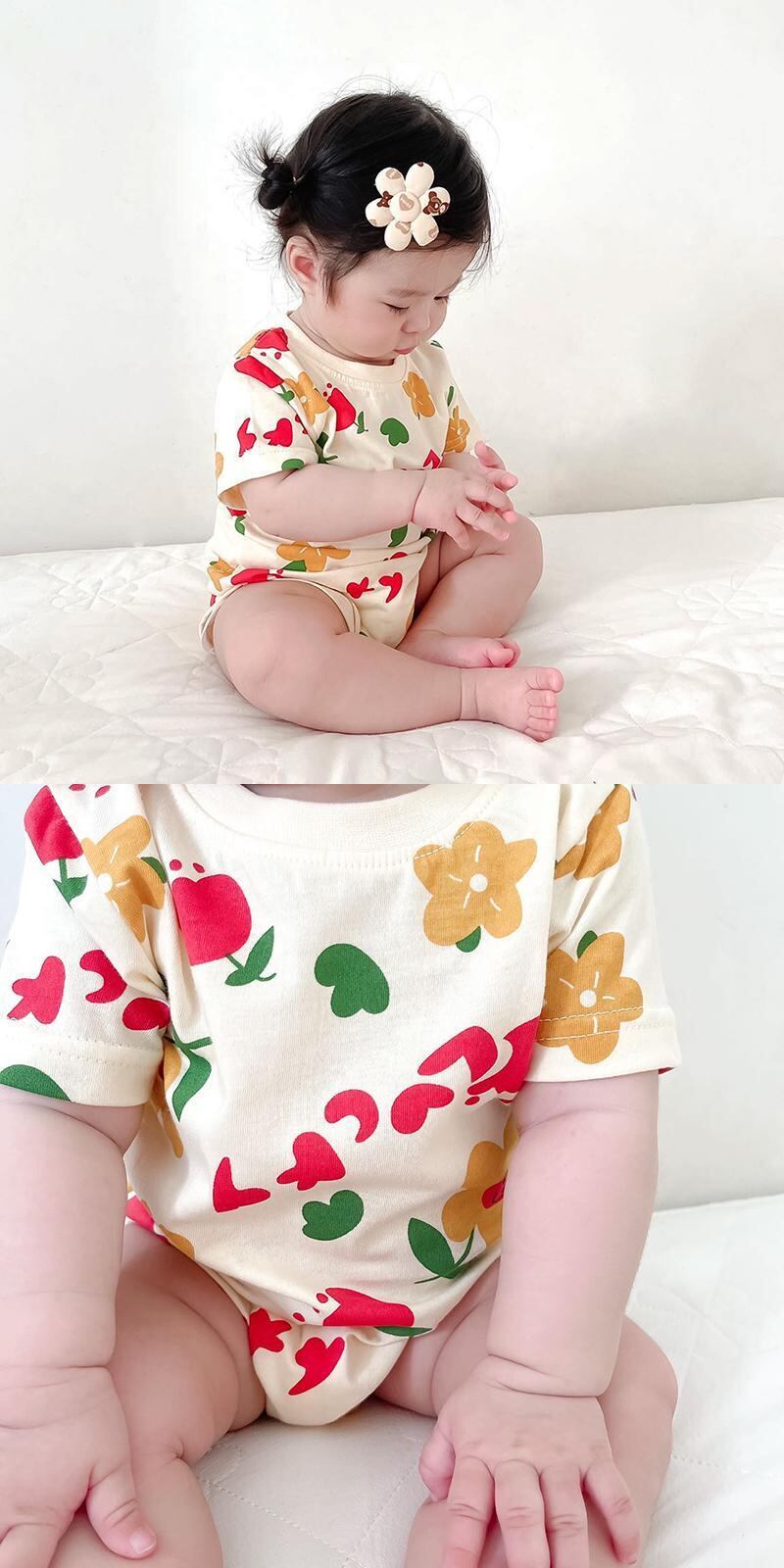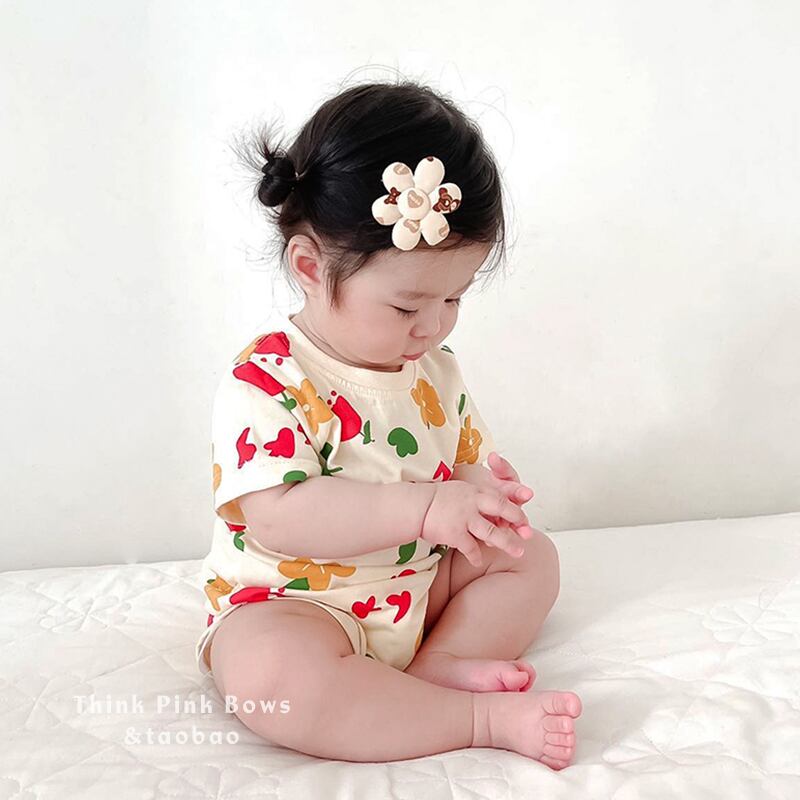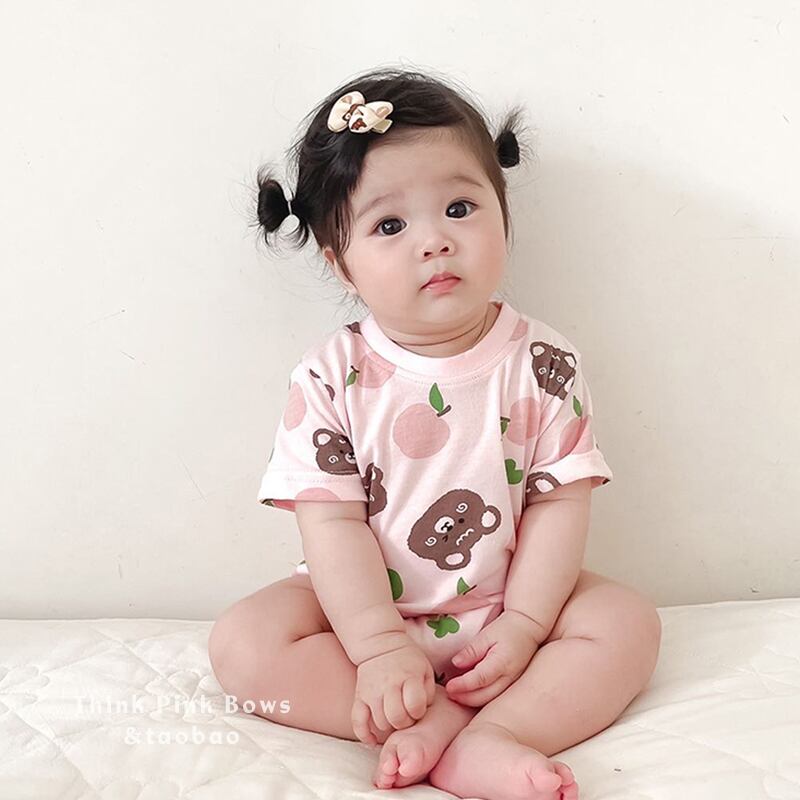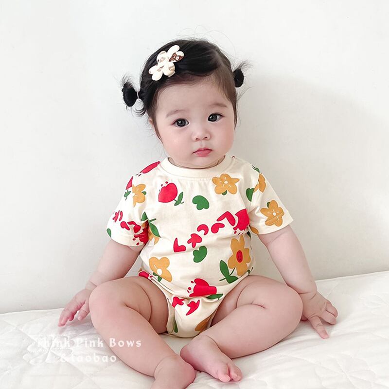 色:アプリコットフラワーロンパース,ピンクのクマのロンパース