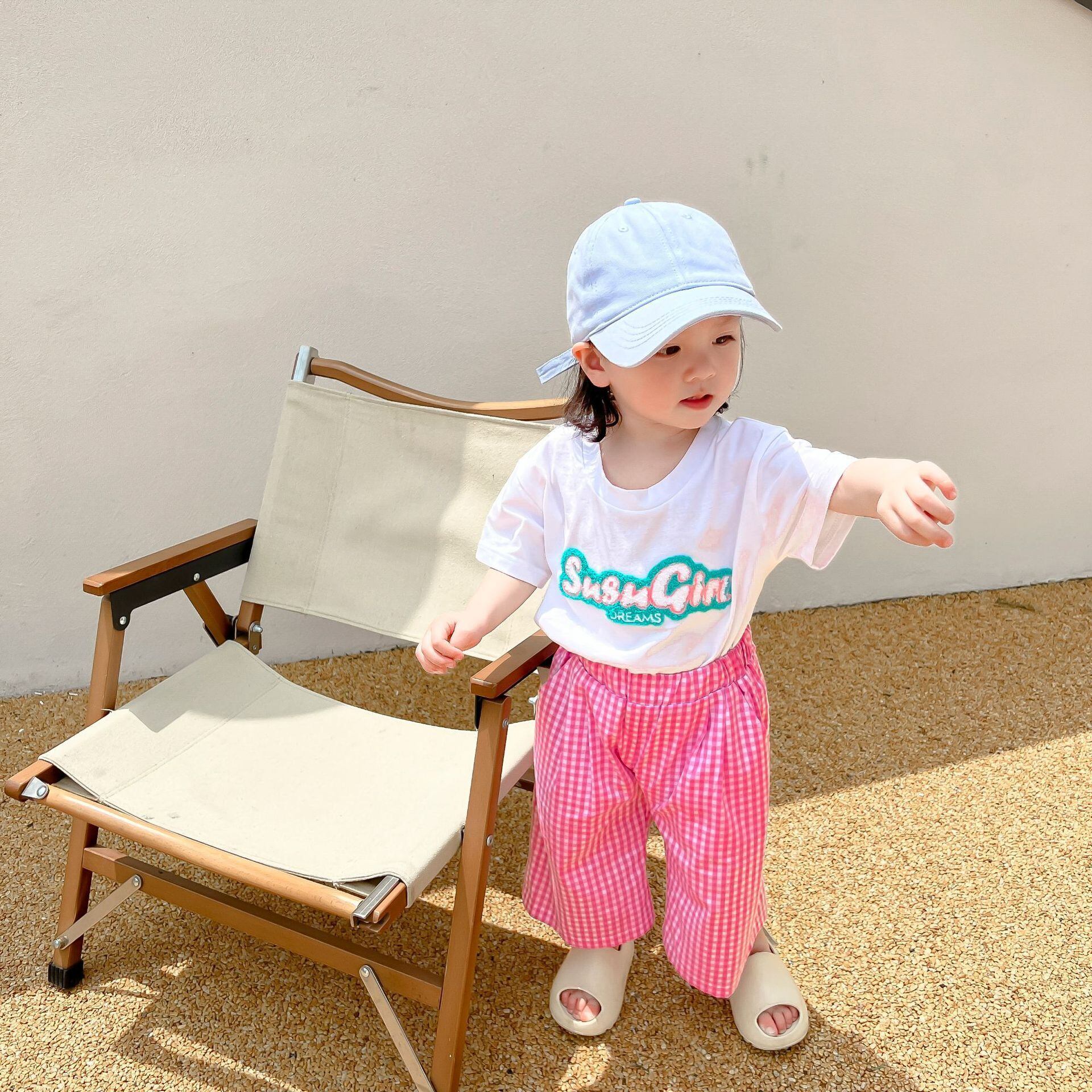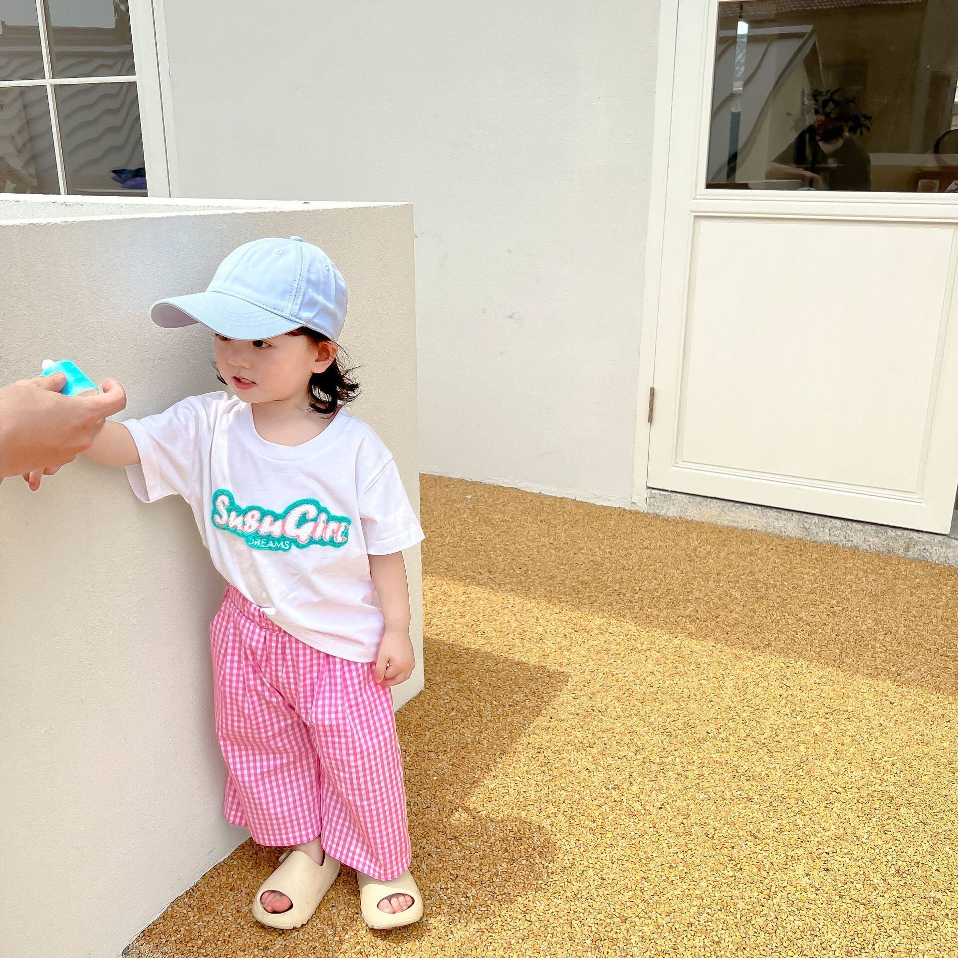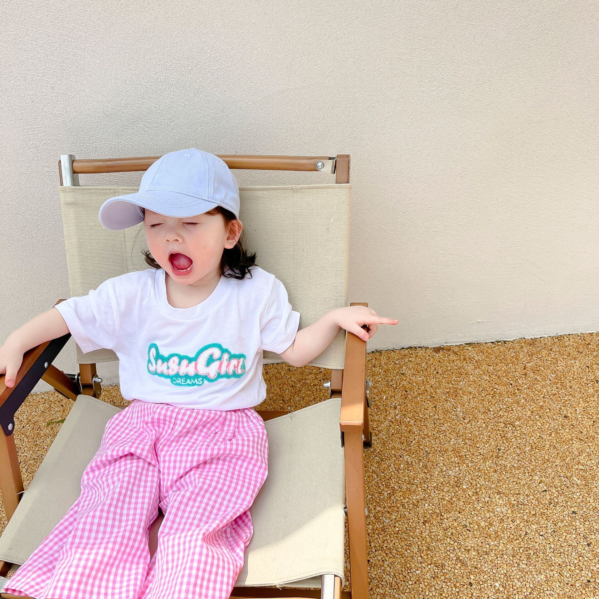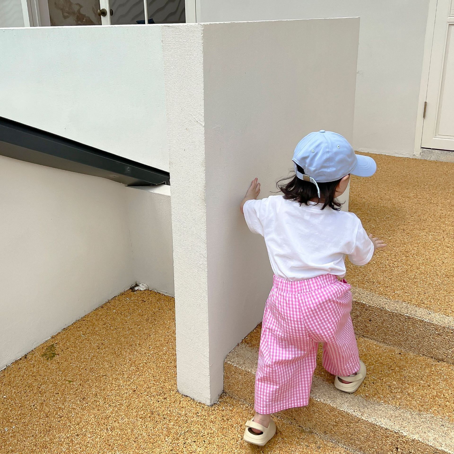 色:タオル刺しTシャツ,ピンクのチェック柄パンツ