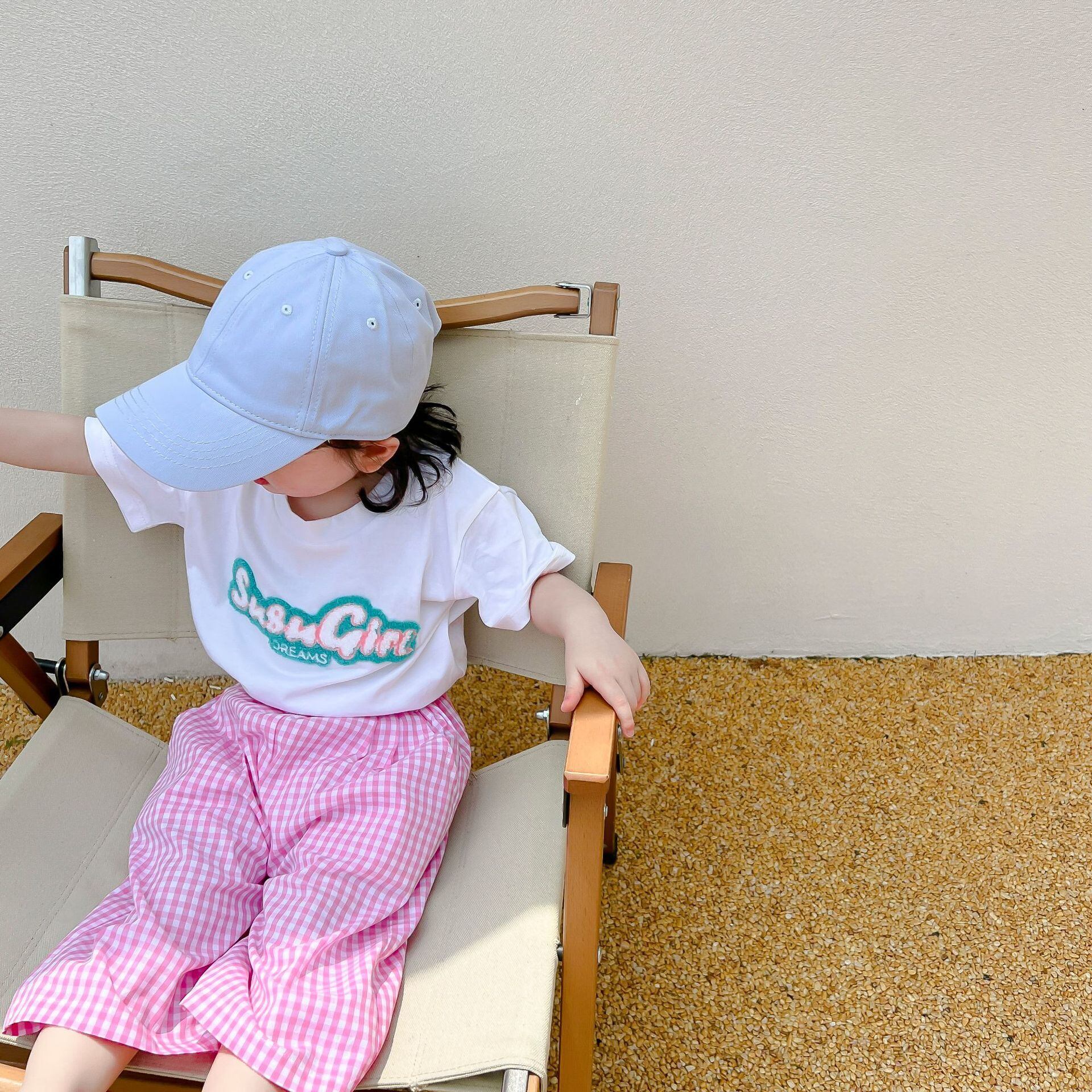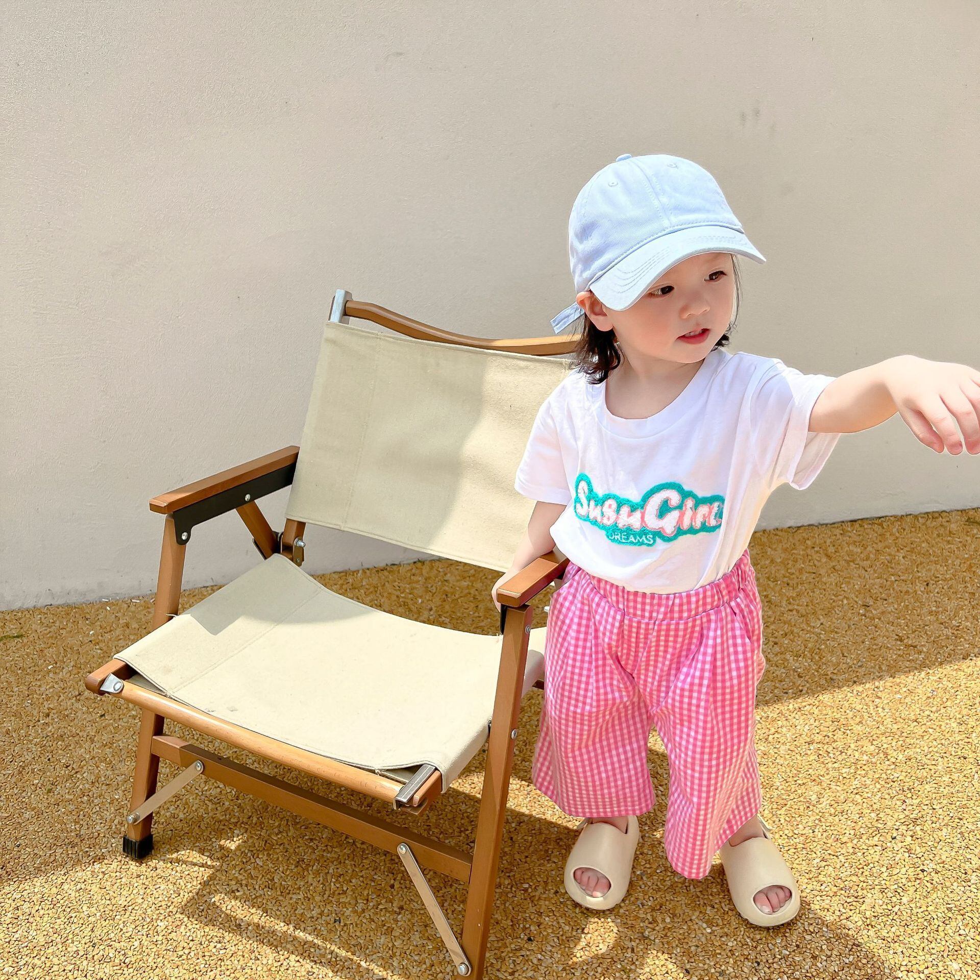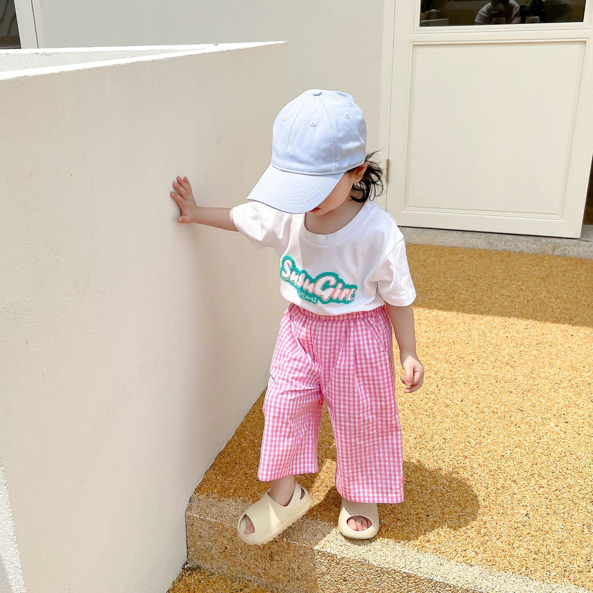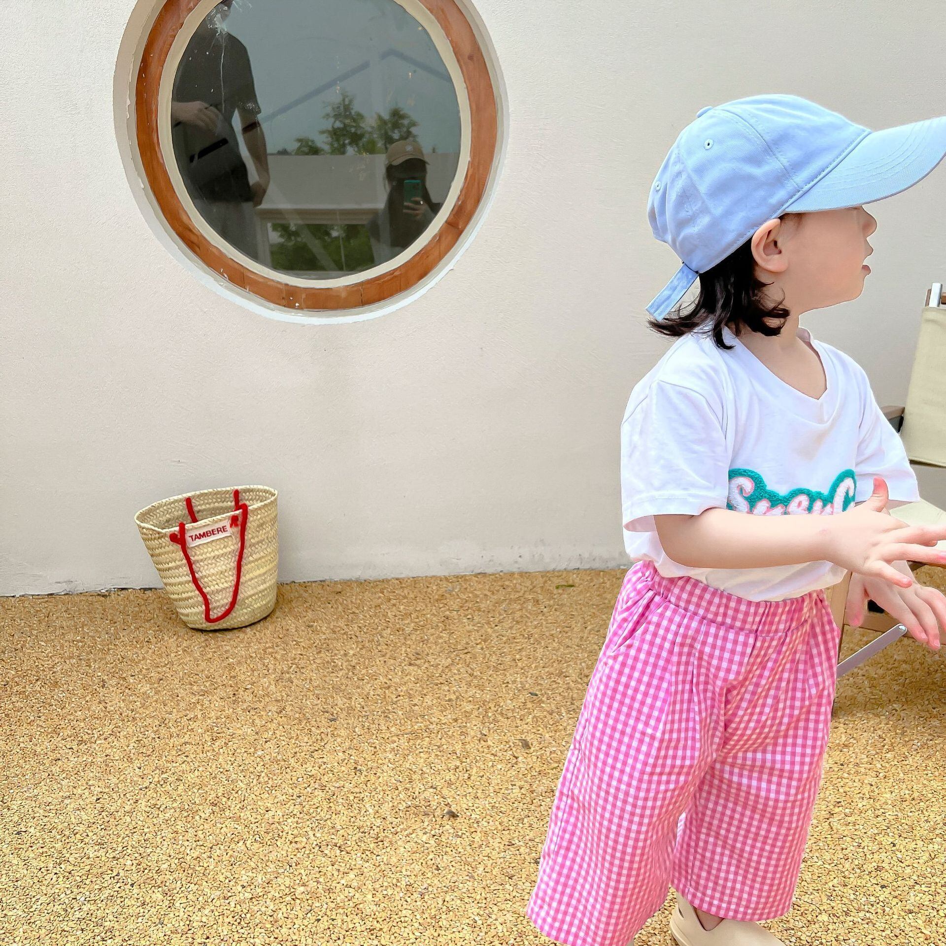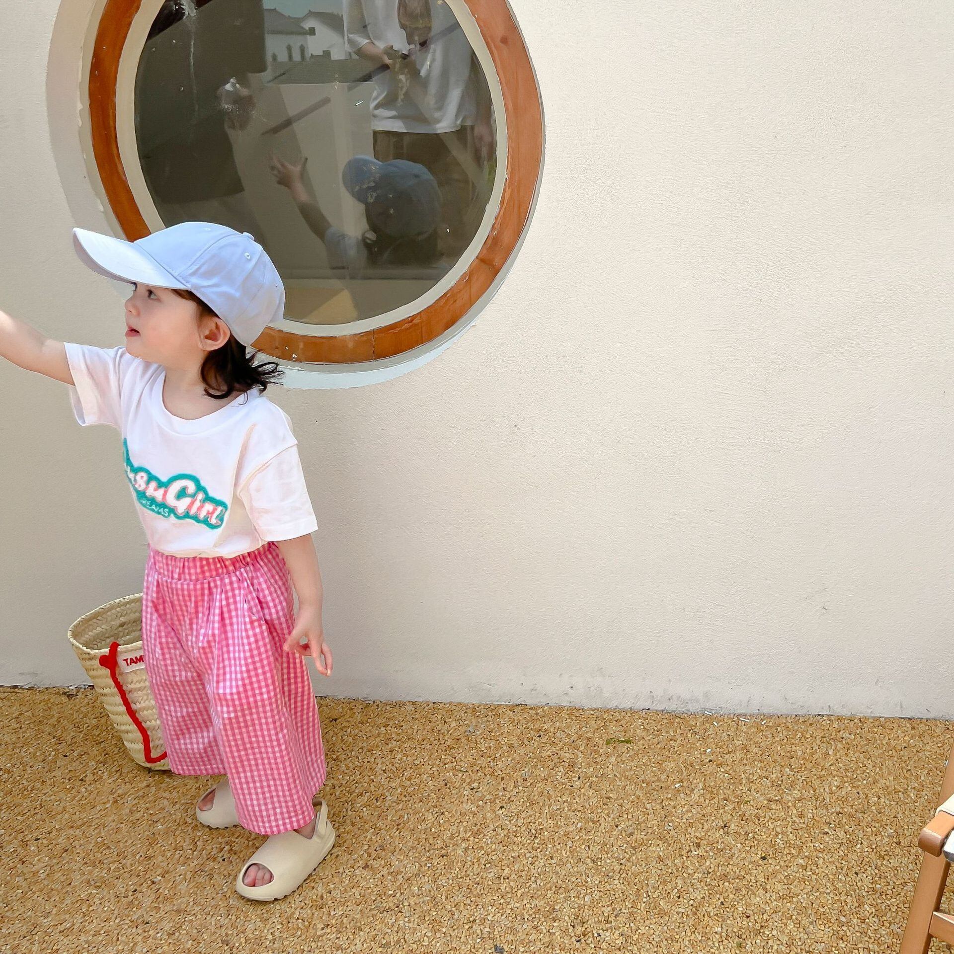 色:タオル刺しTシャツ,ピンクのチェック柄パンツ