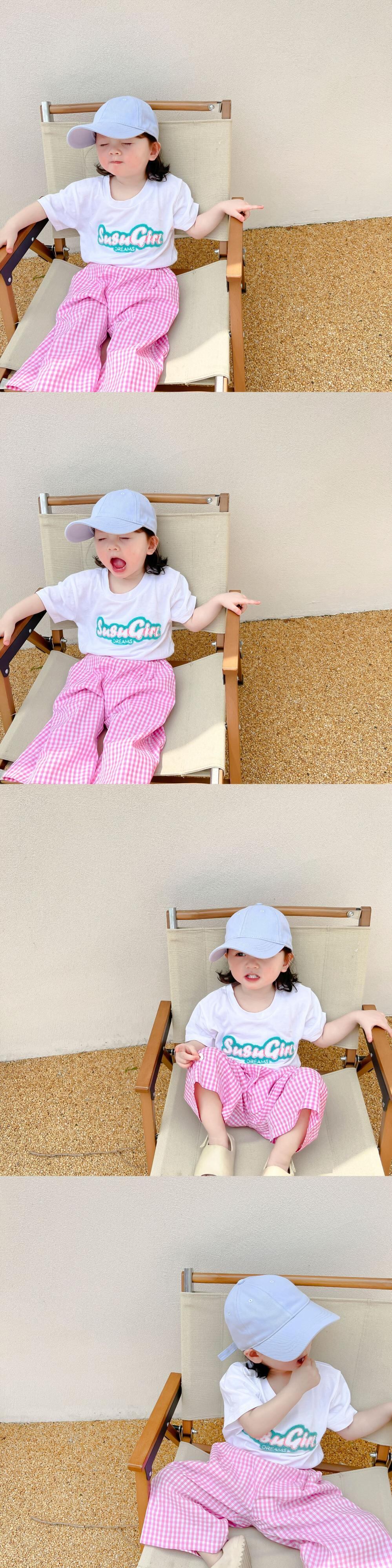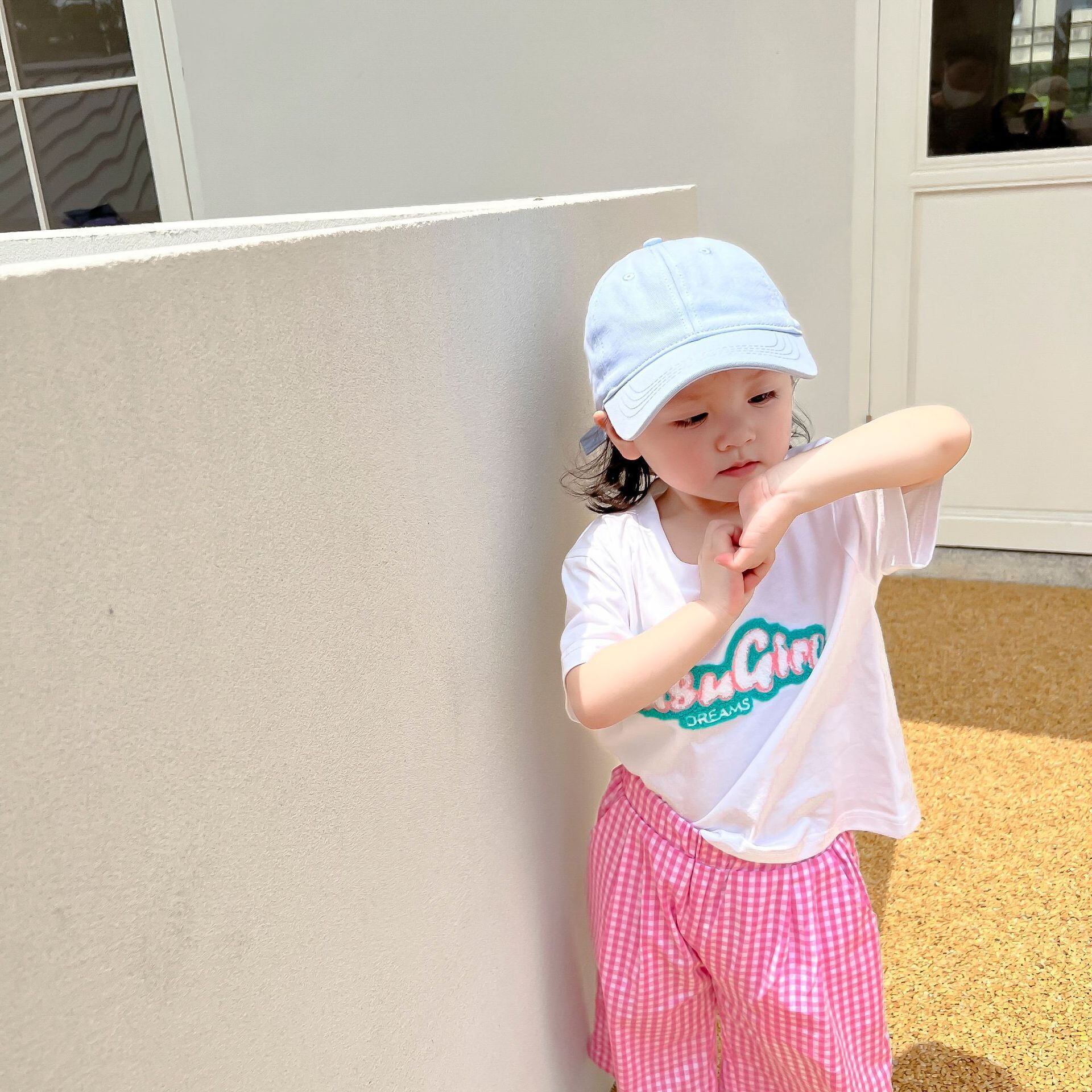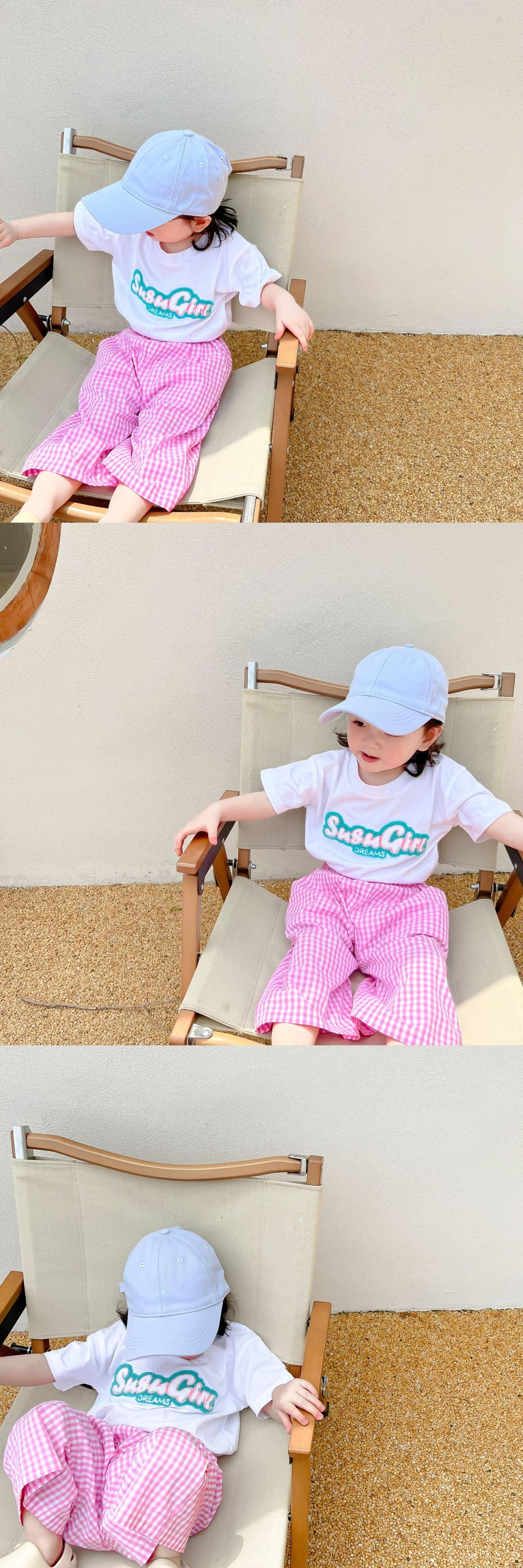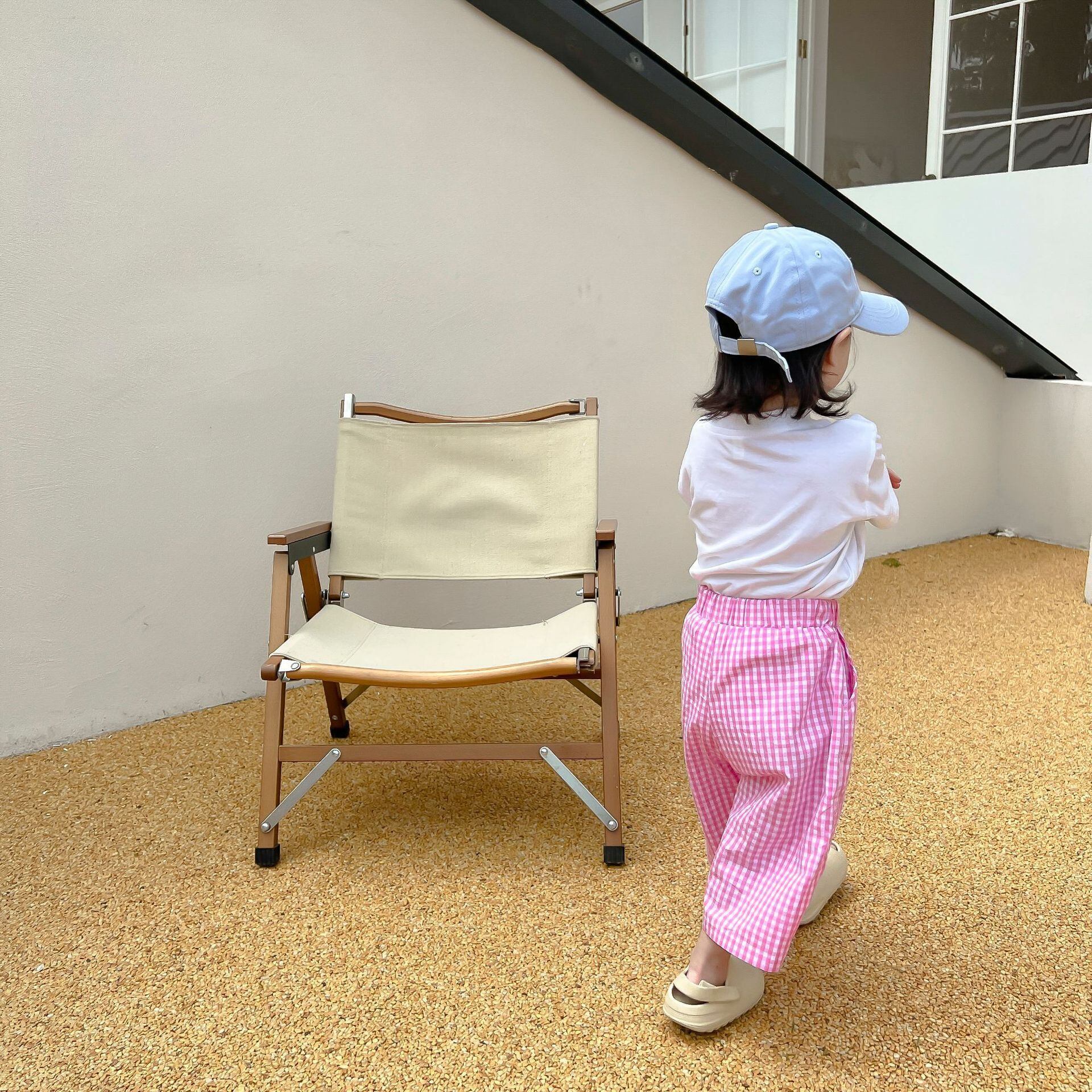 色:タオル刺しTシャツ,ピンクのチェック柄パンツ