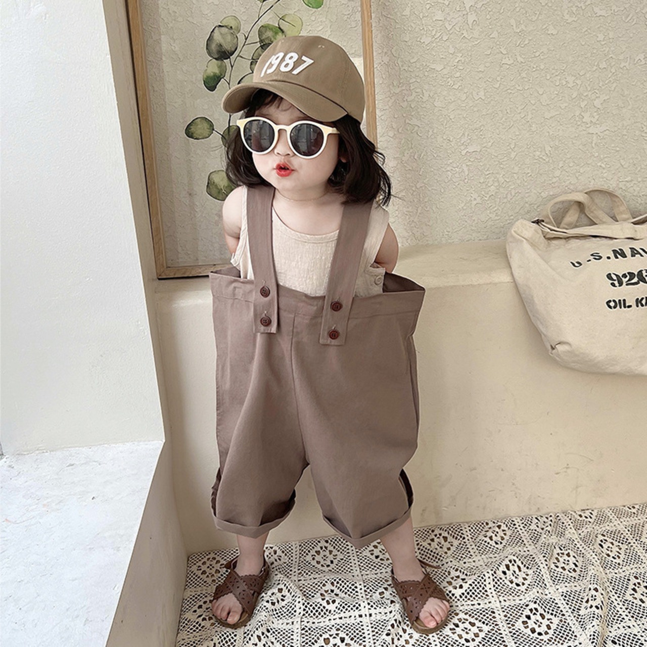 色:ブラウンのオーバーオール,アプリコット