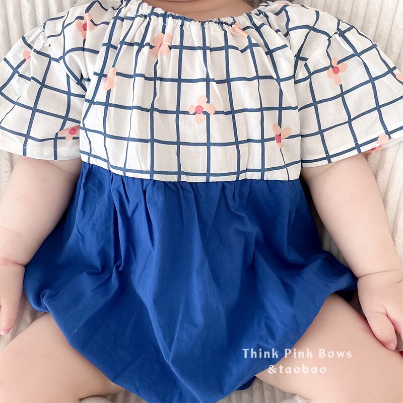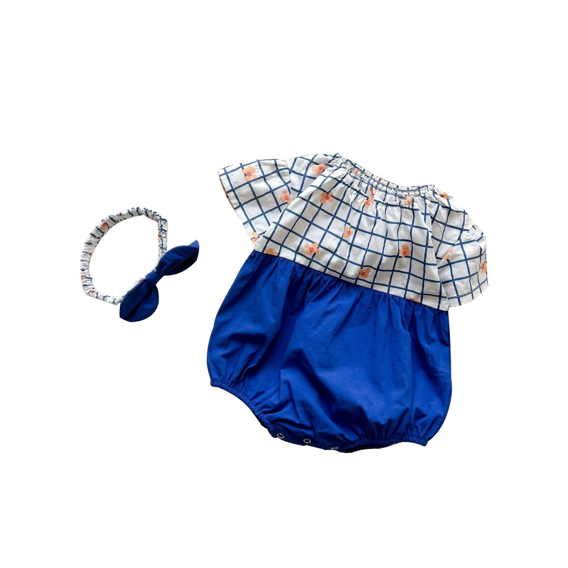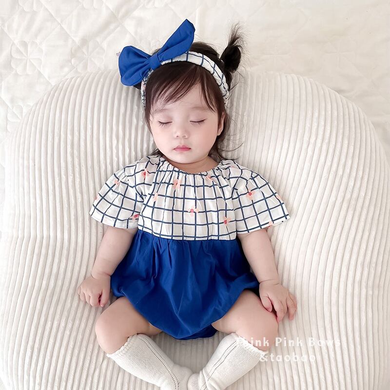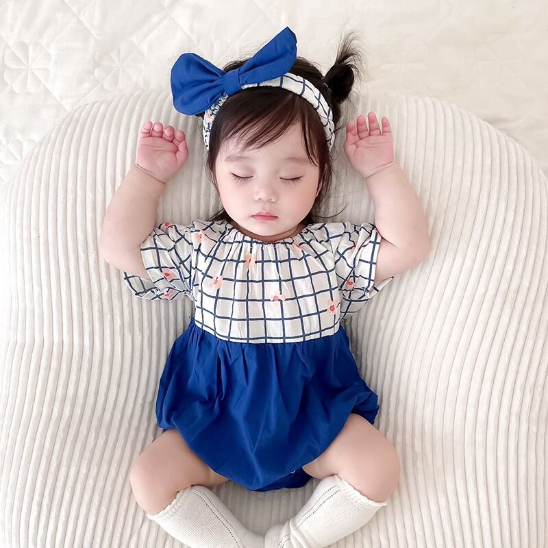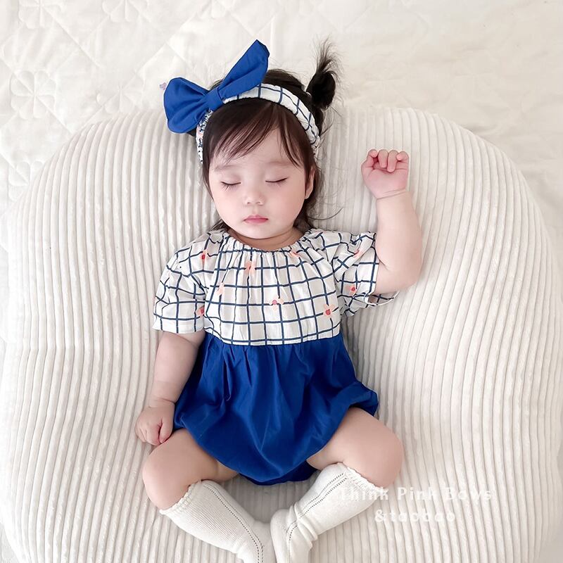 色:チェック柄ブルーロンパース+ヘアバンド