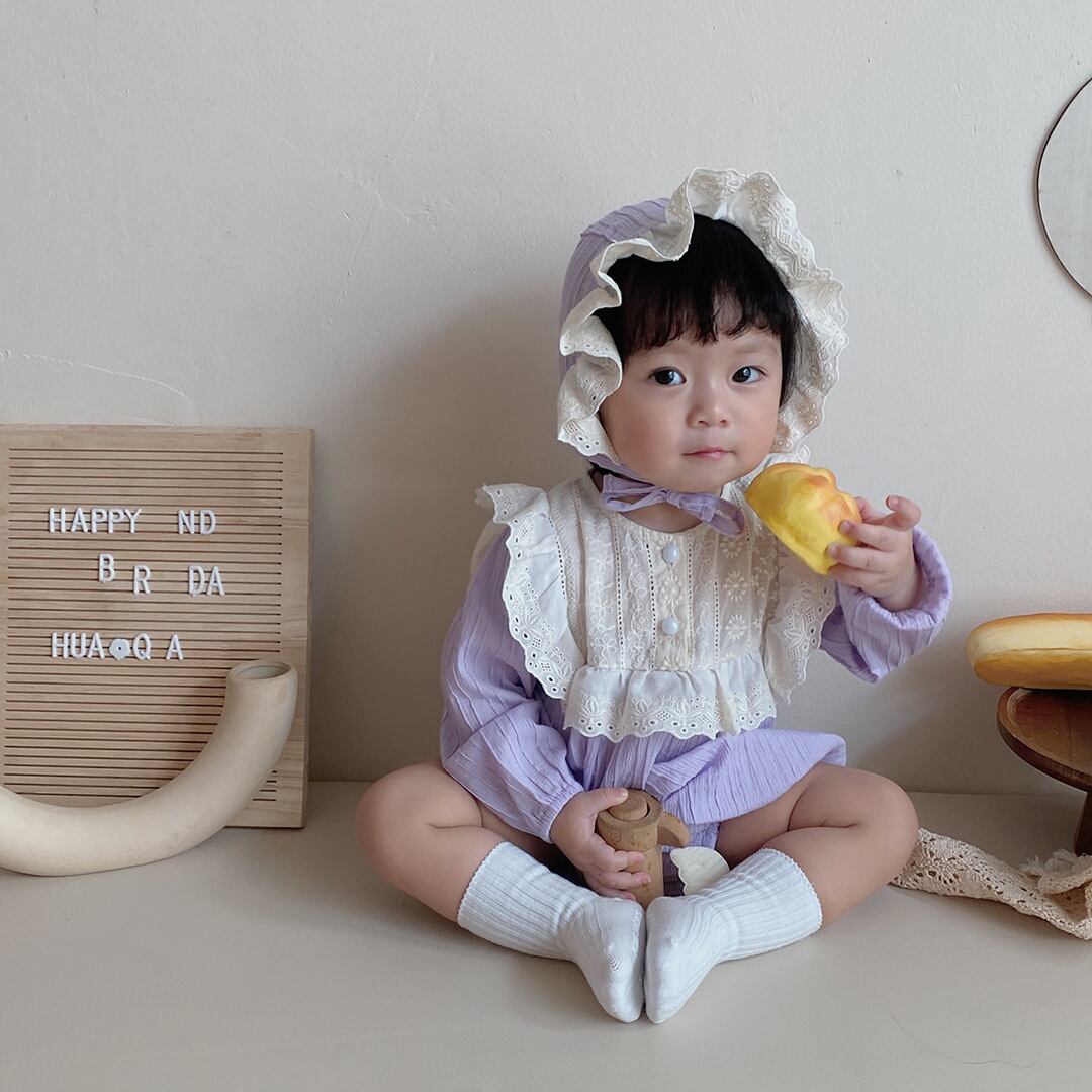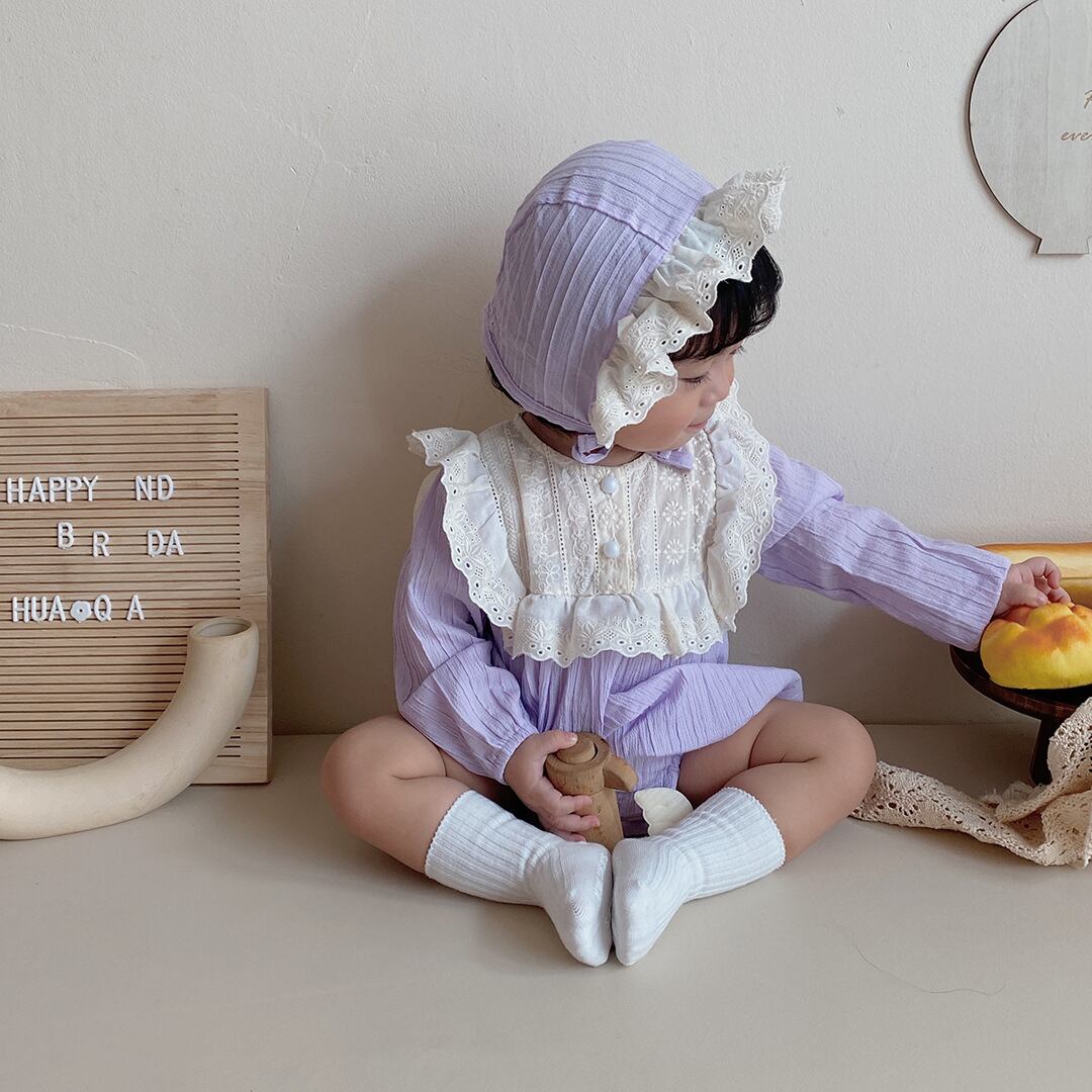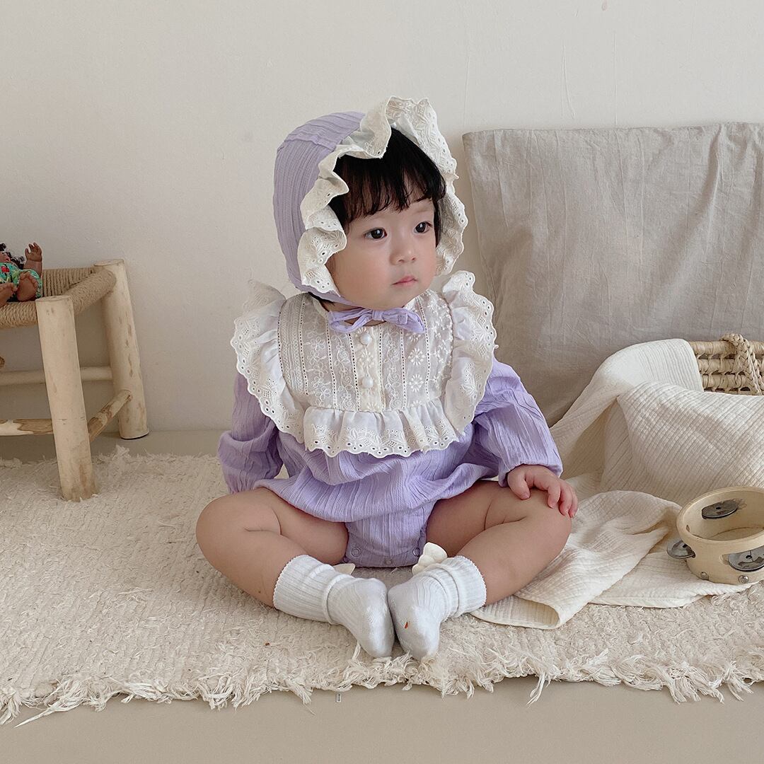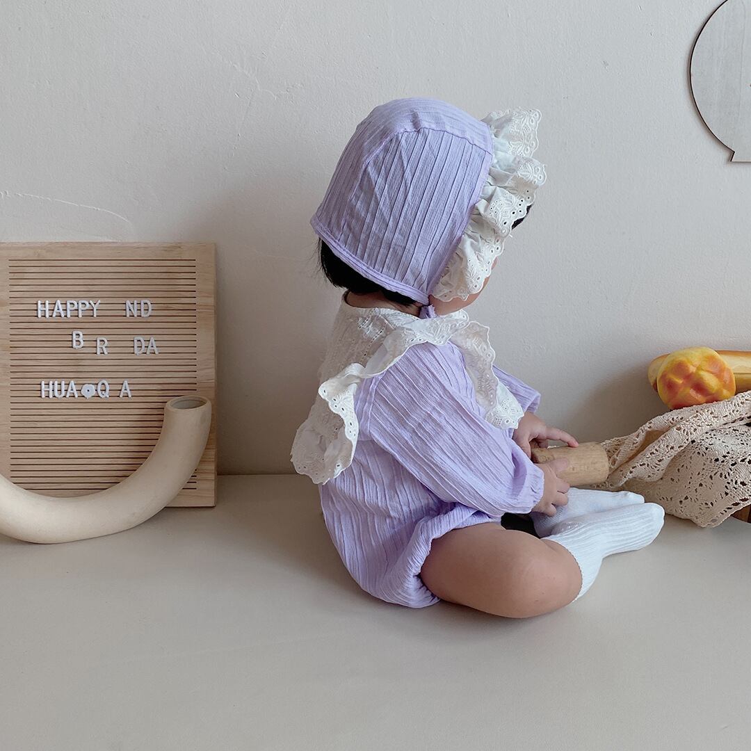 色:パープルカラーブロックロンパース+ハット