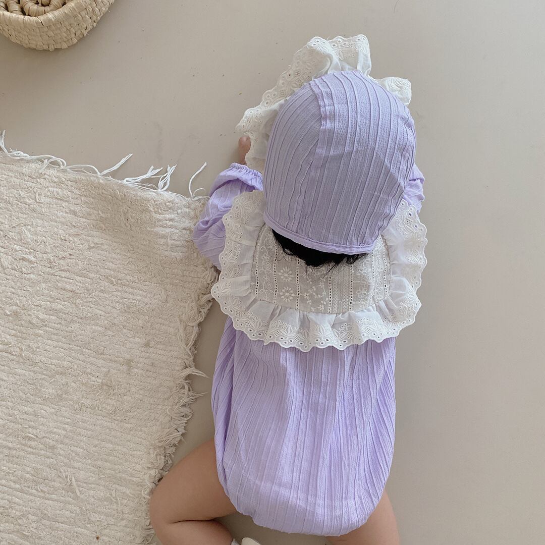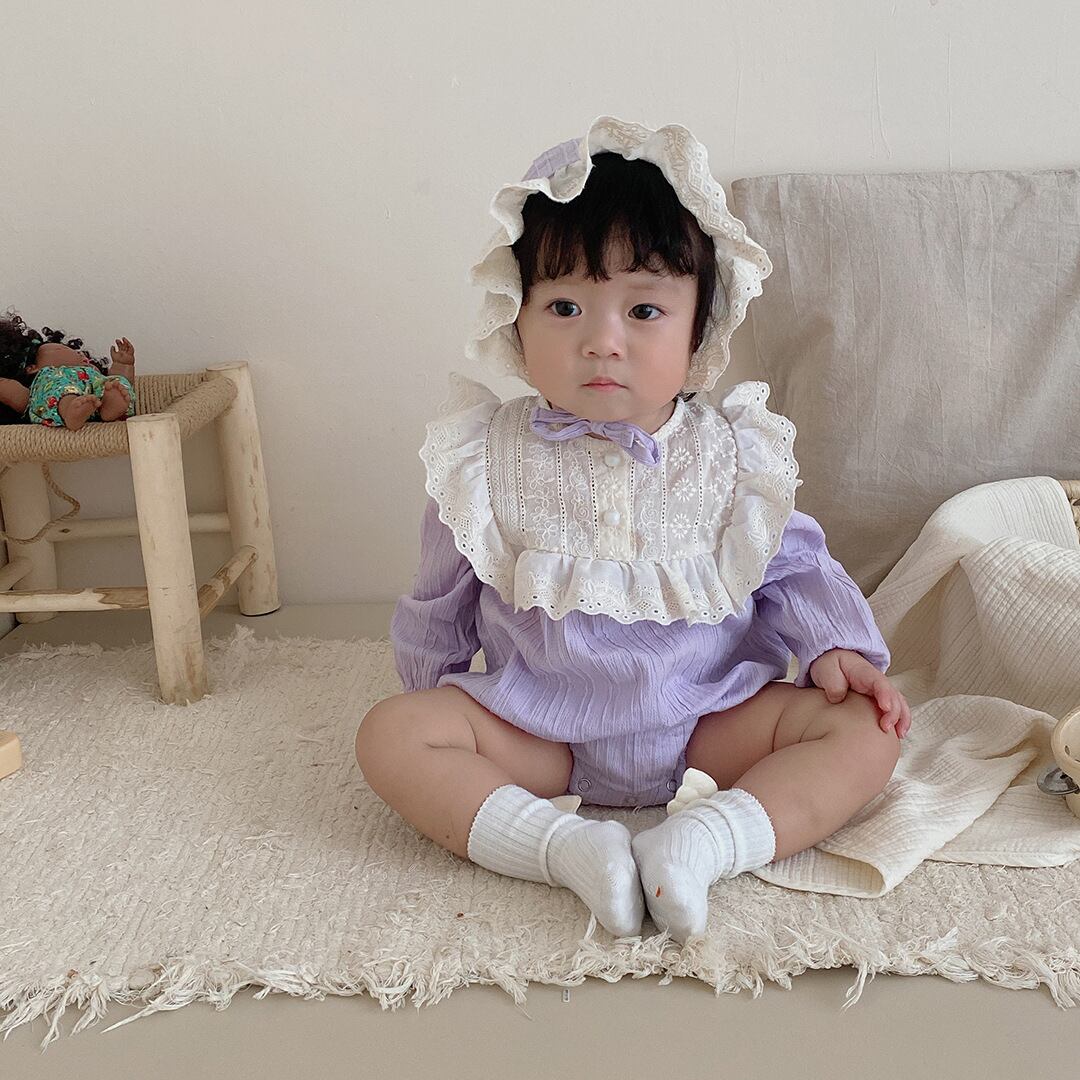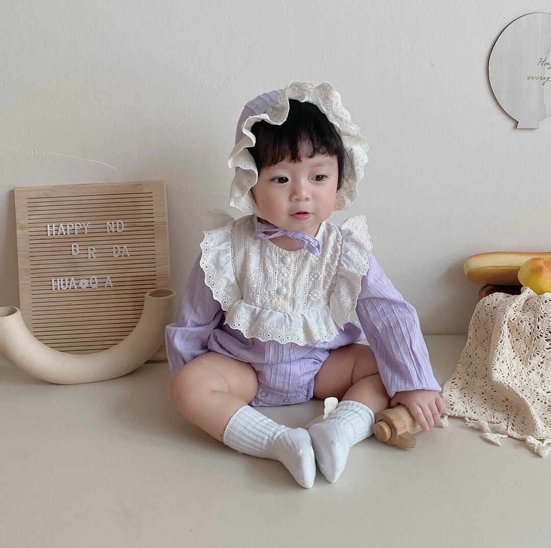 色:パープルカラーブロックロンパース+ハット