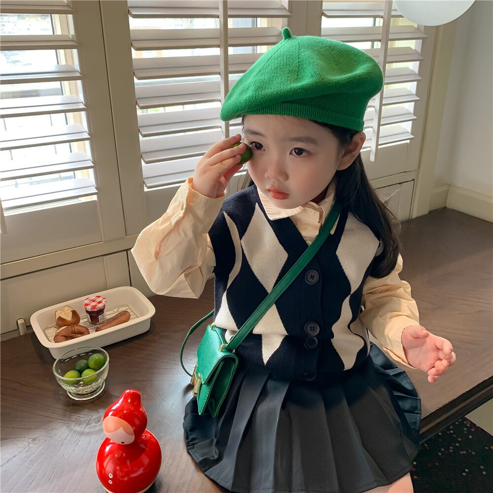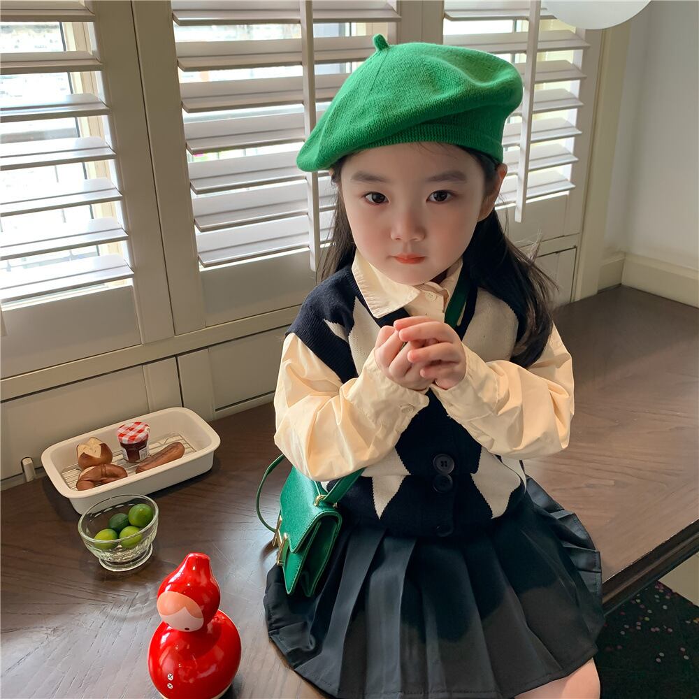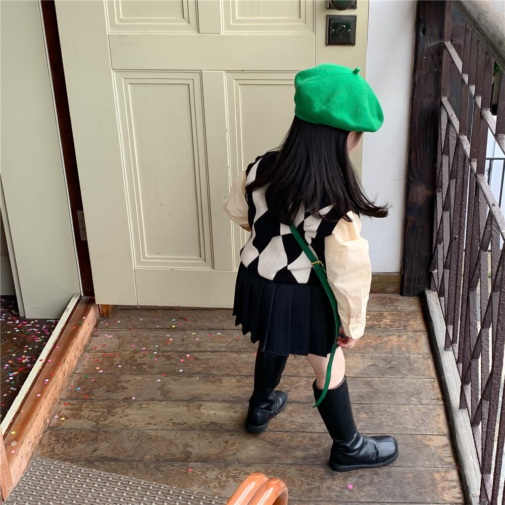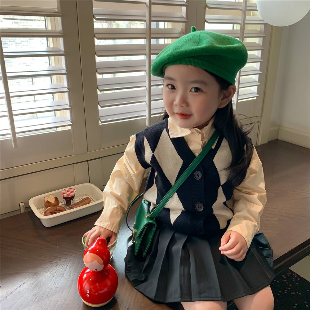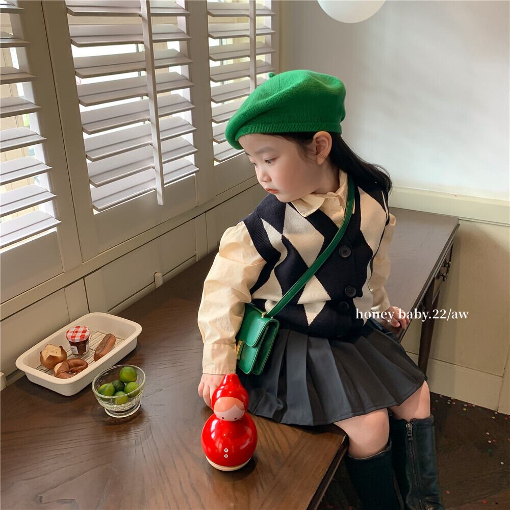 色:ダイヤモンドセーターベスト,ベージュのシャツ,プリーツスカート