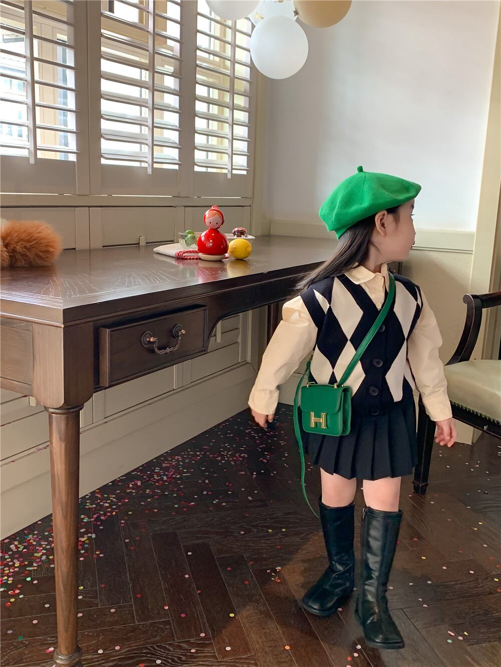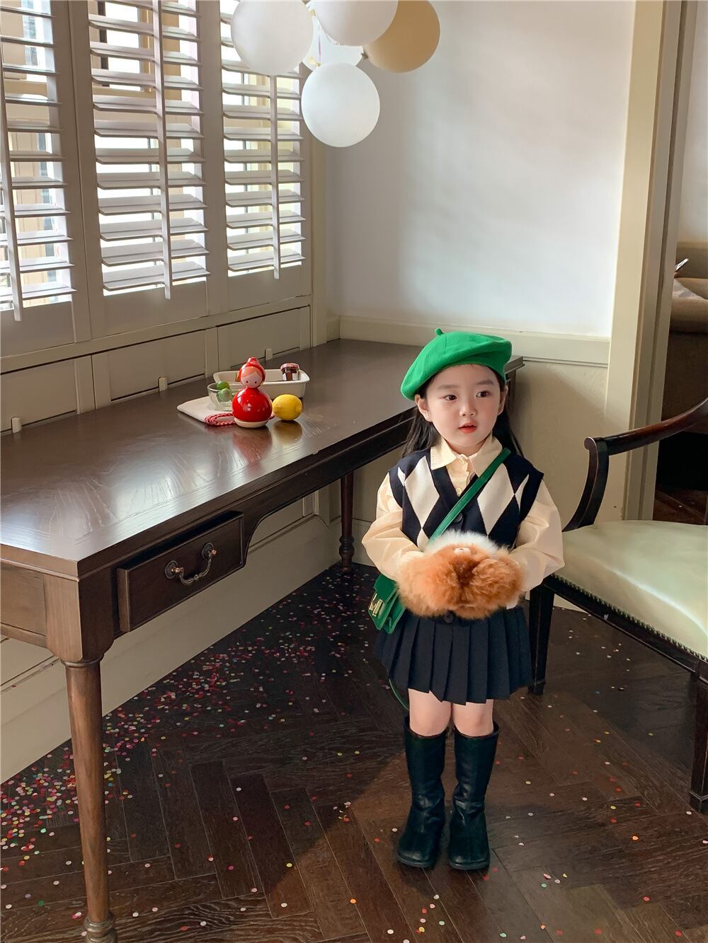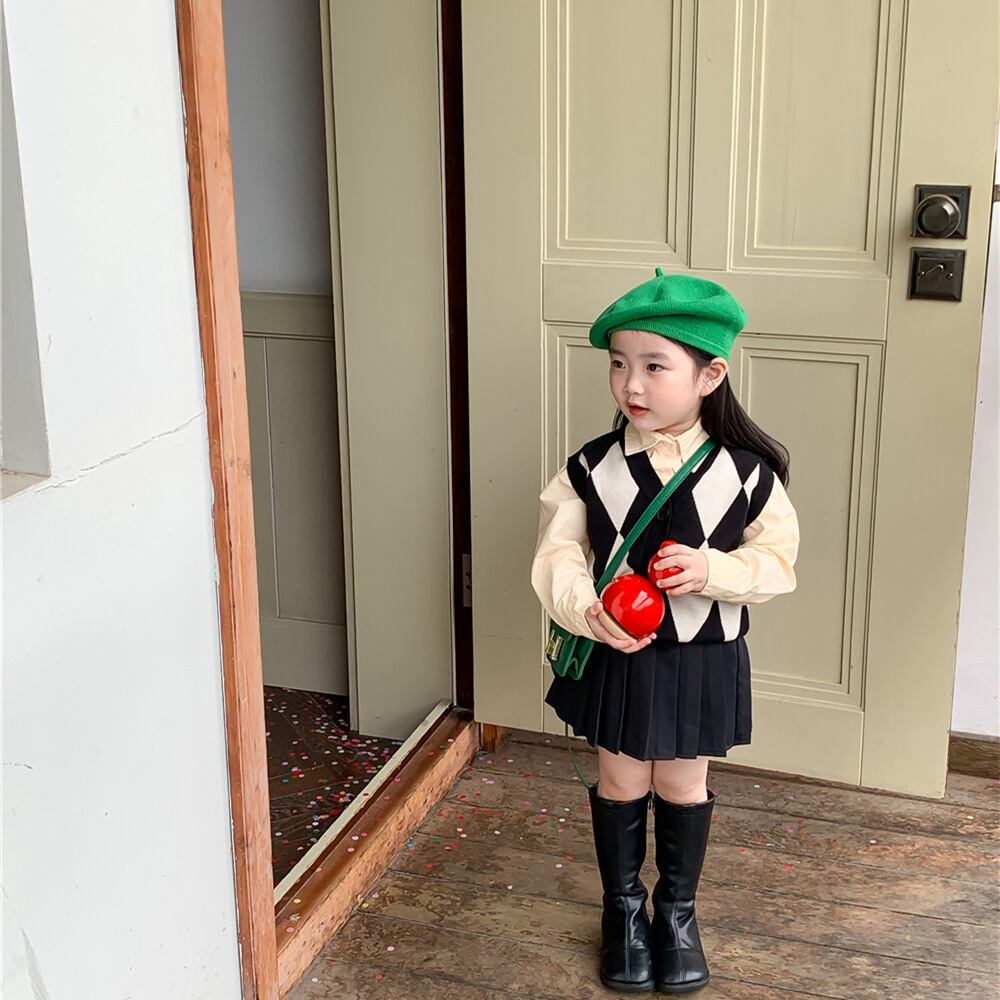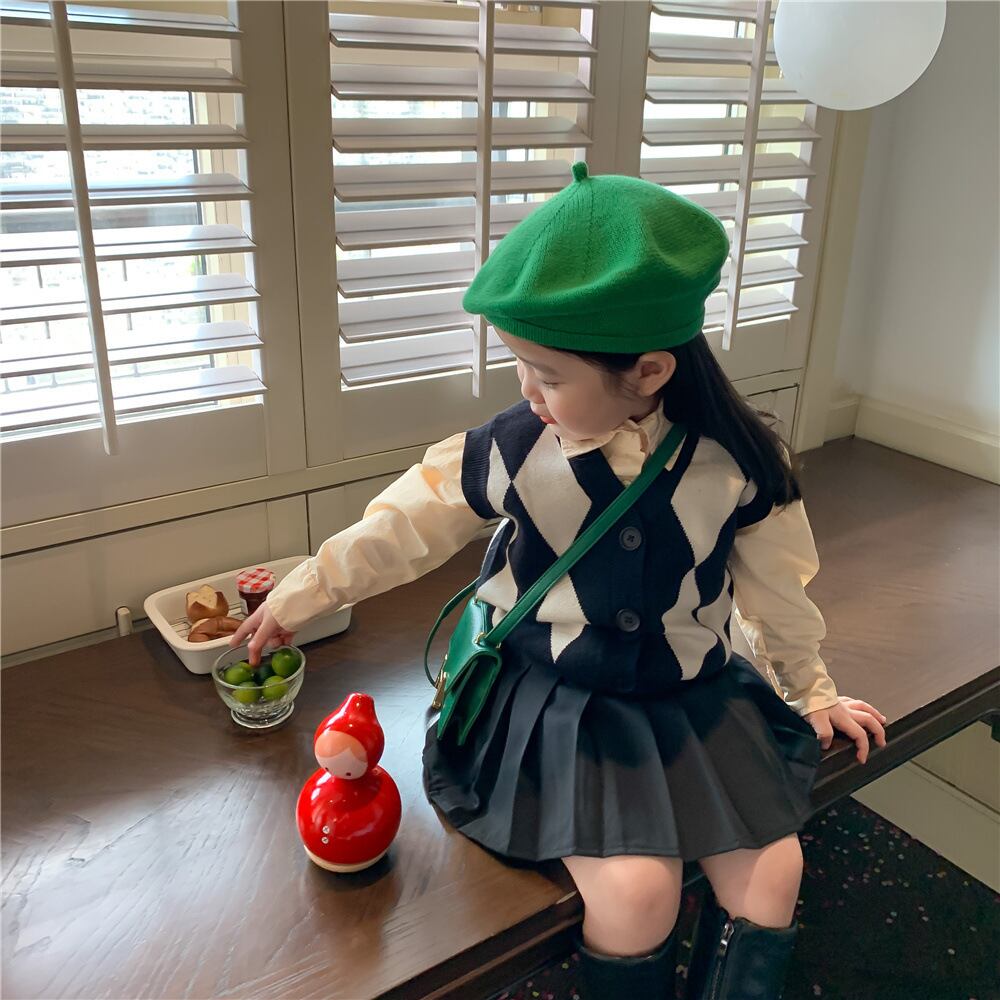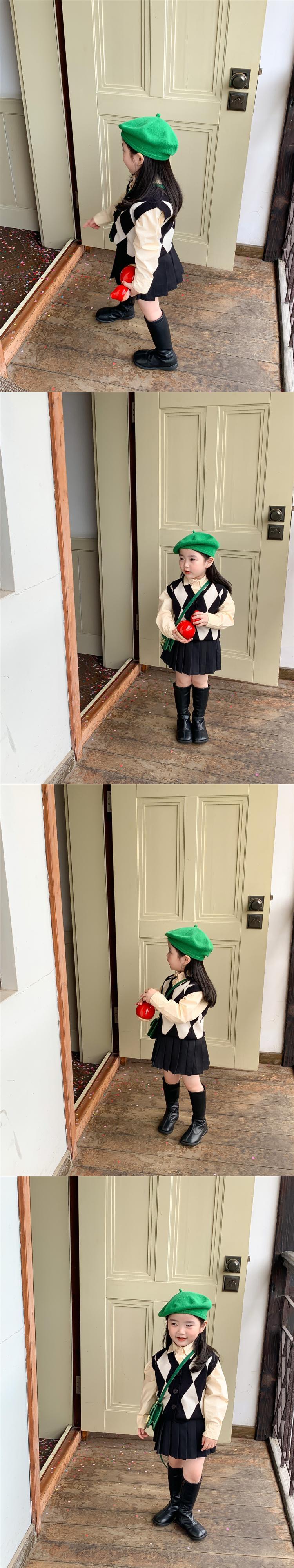 色:ダイヤモンドセーターベスト,ベージュのシャツ,プリーツスカート