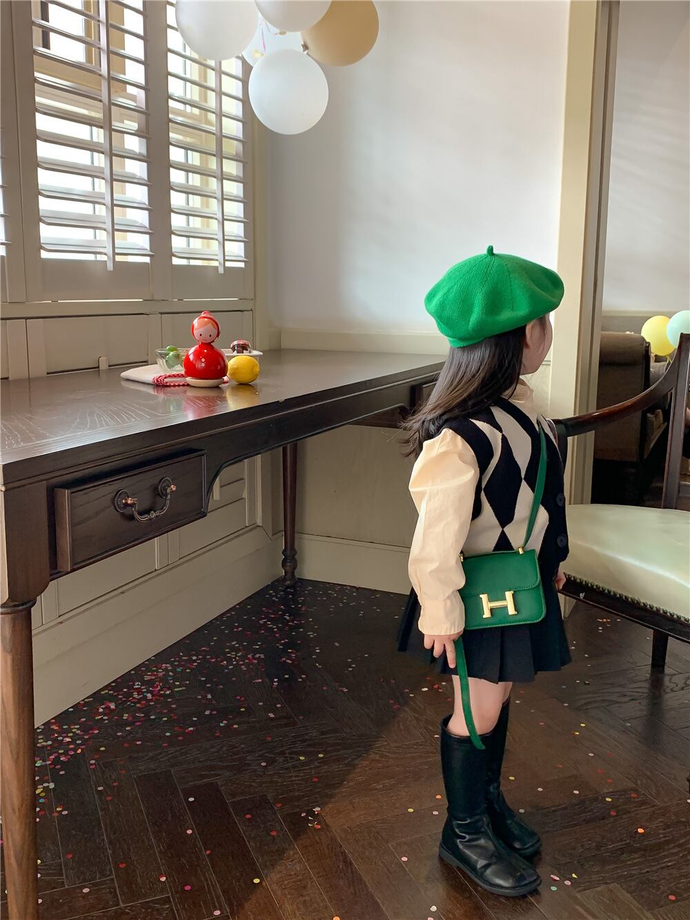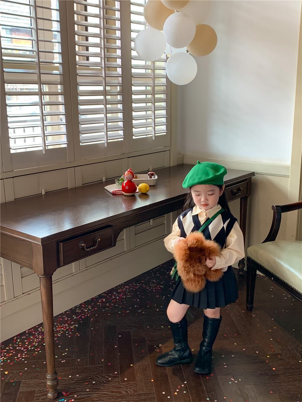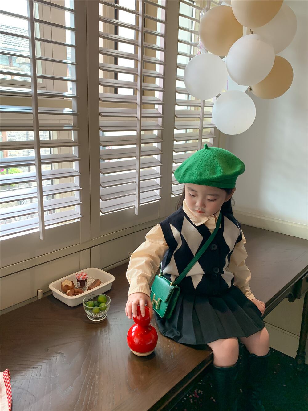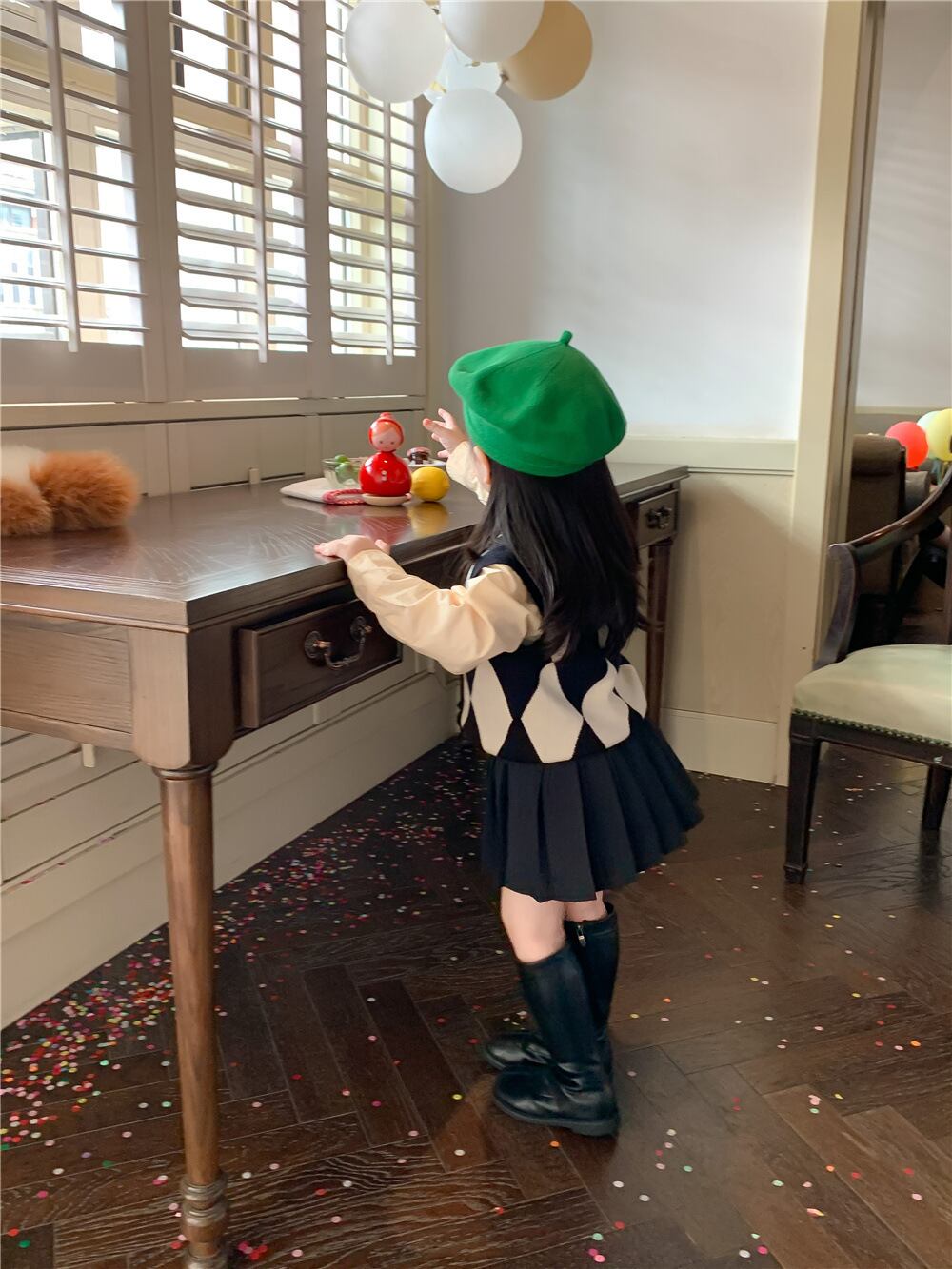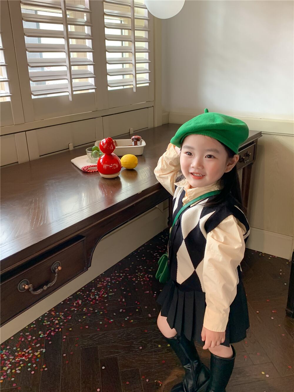 色:ダイヤモンドセーターベスト,ベージュのシャツ,プリーツスカート