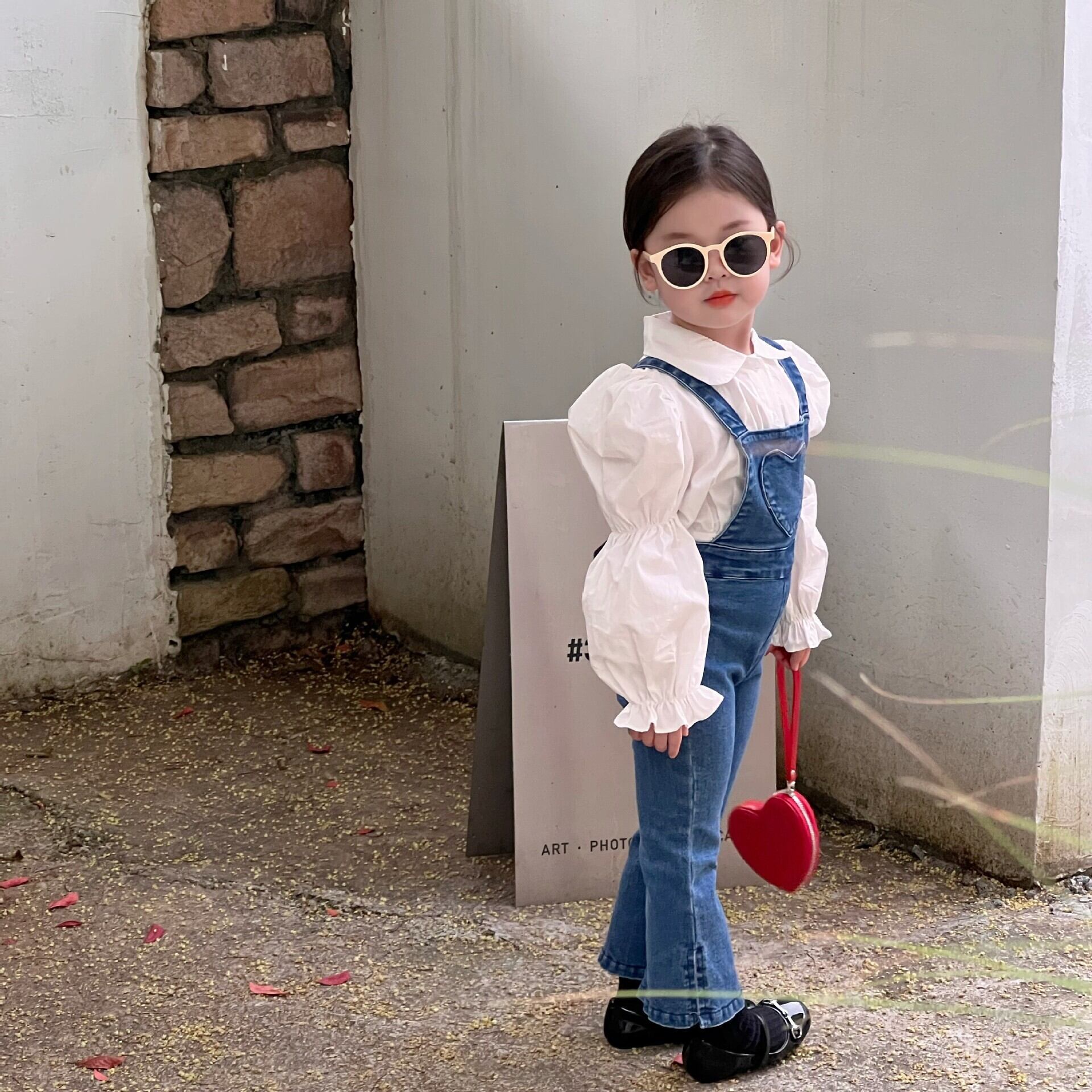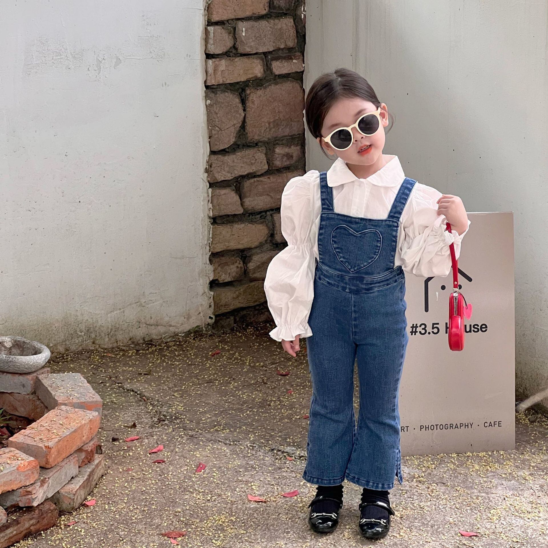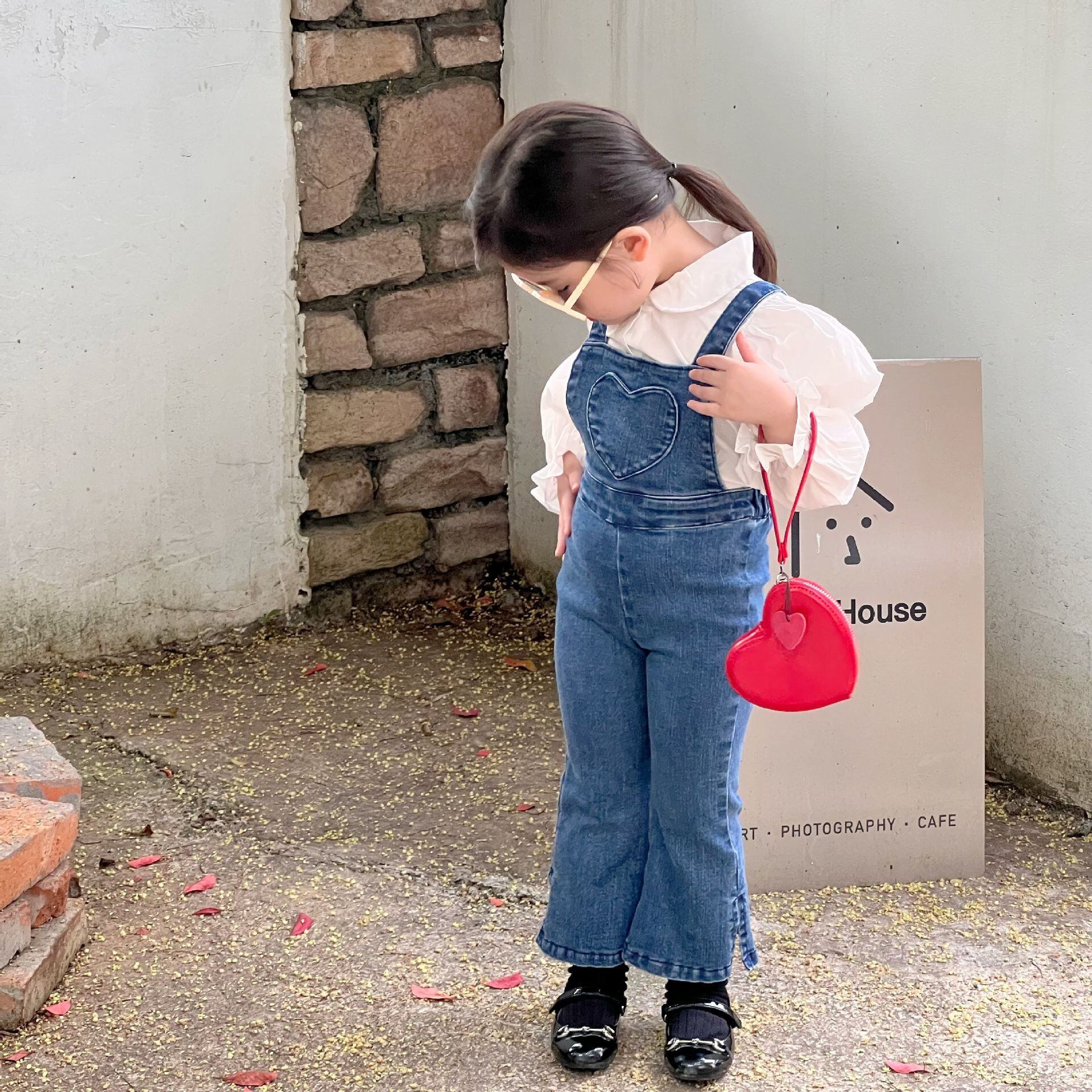 色:ハートデニムオーバーオール,白のシャツ