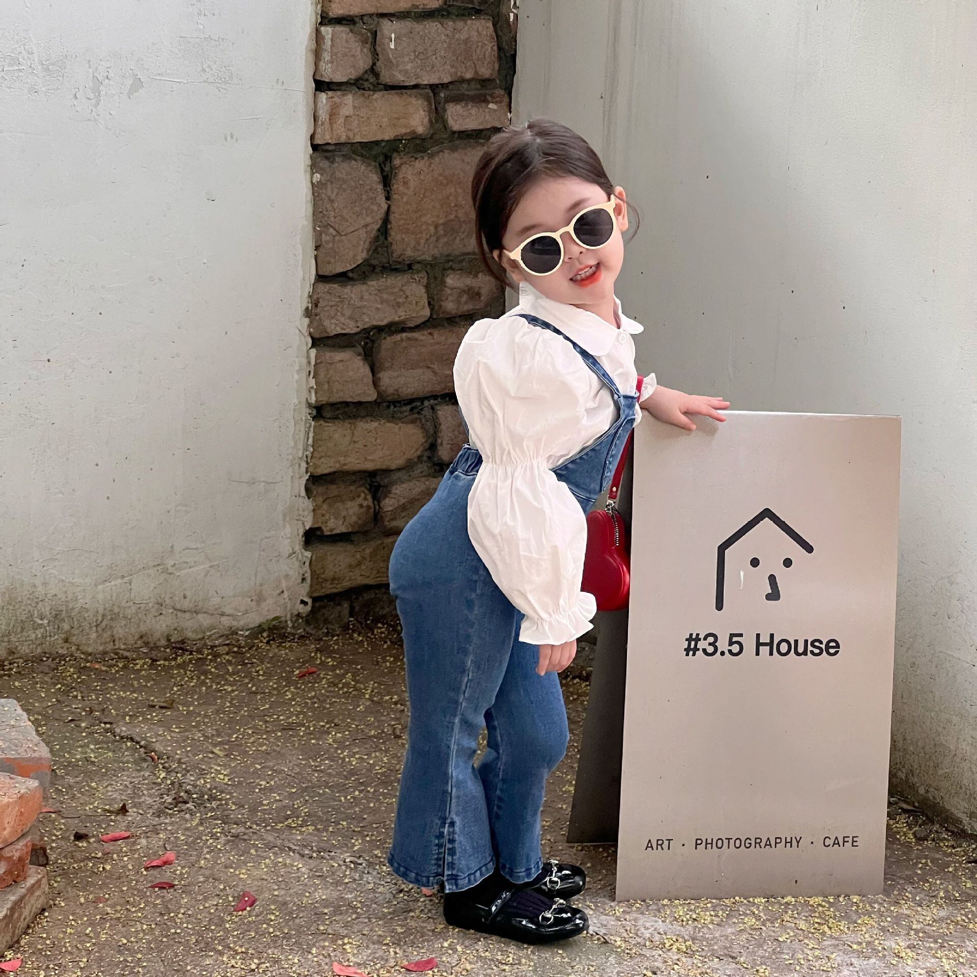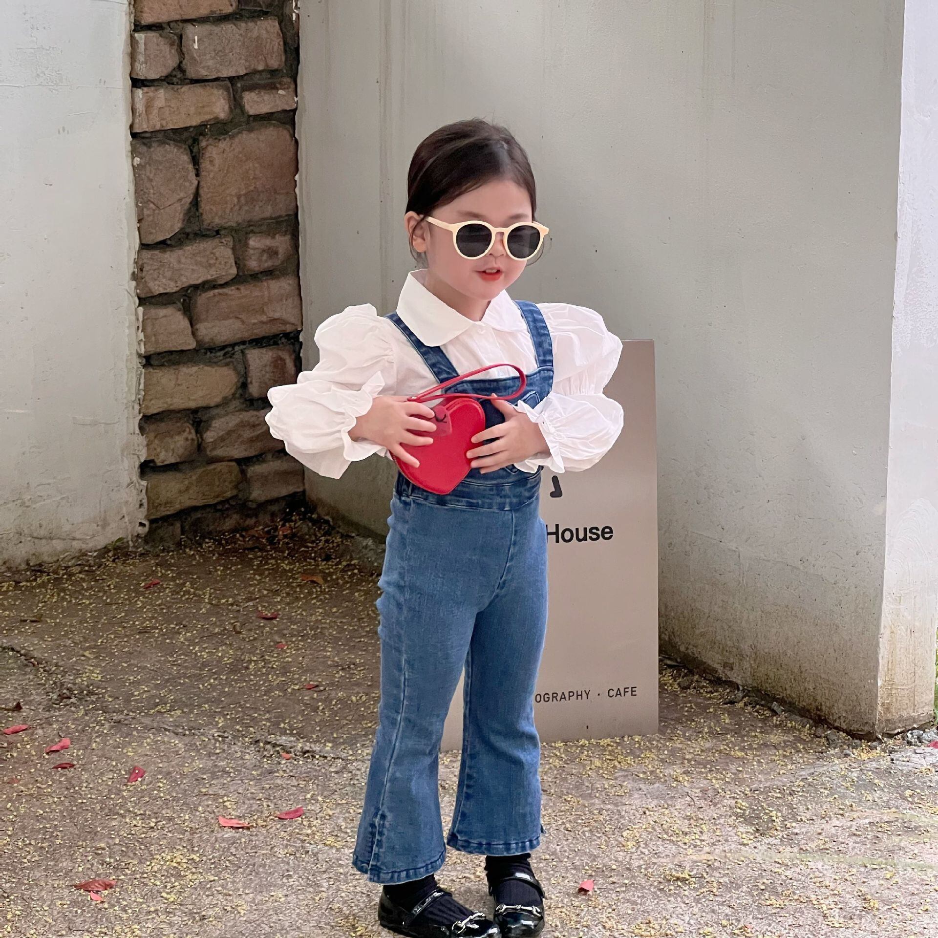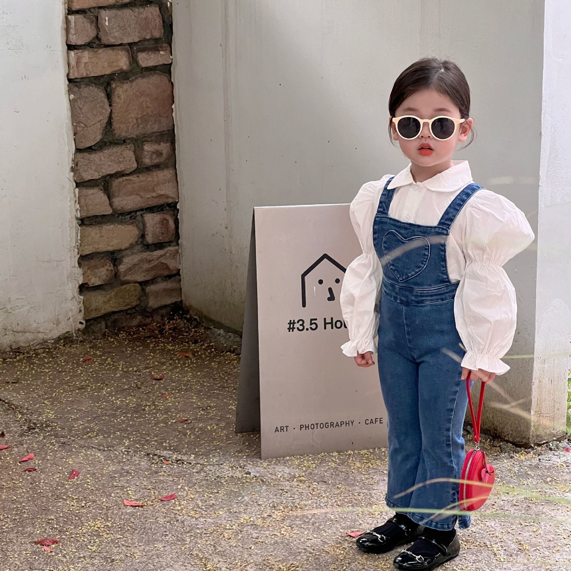 色:ハートデニムオーバーオール,白のシャツ