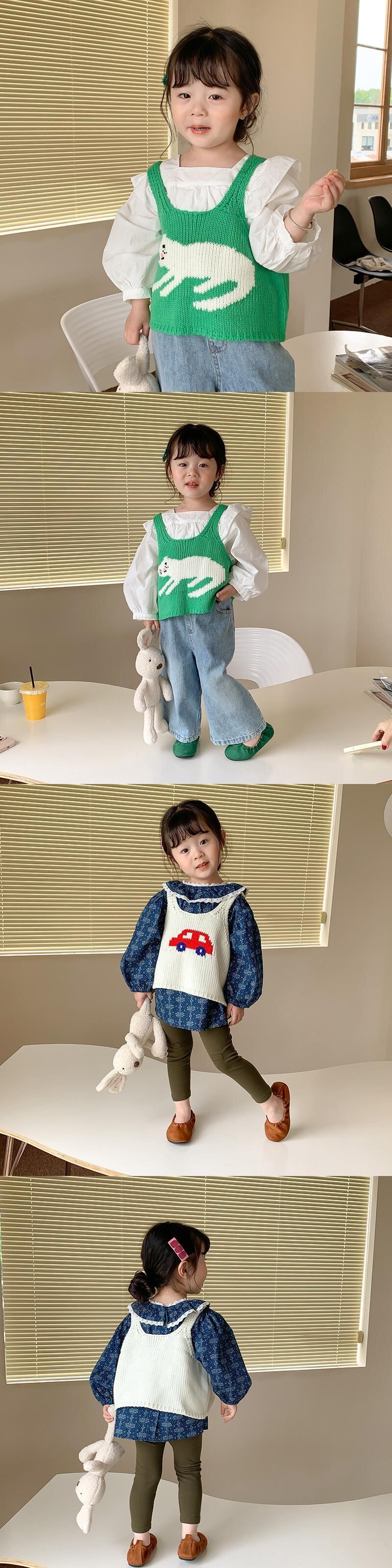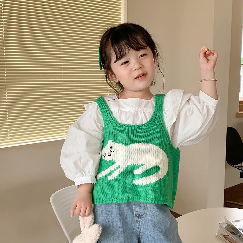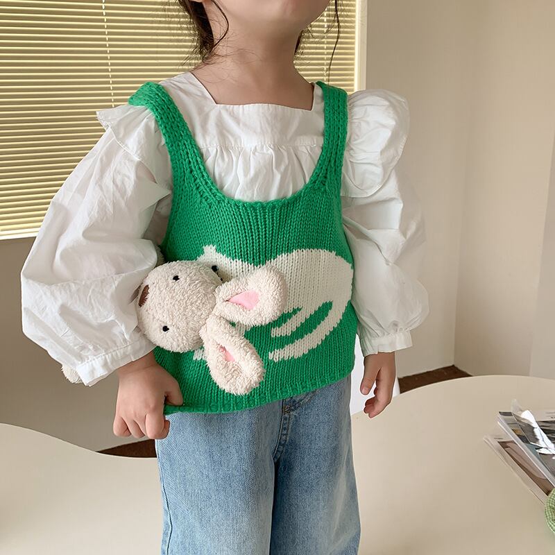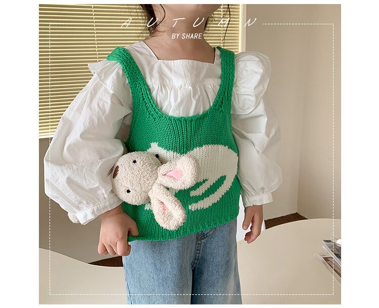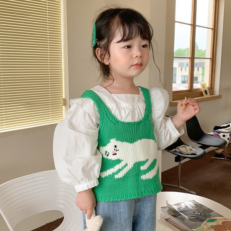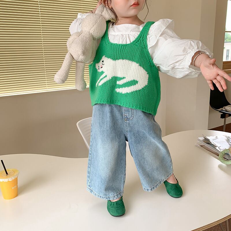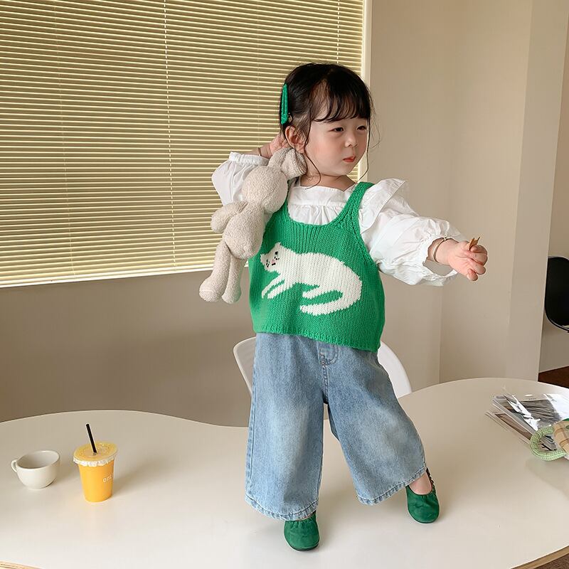 色:グリーンベスト,ベージュのベスト,白のシャツ,ジーンズ