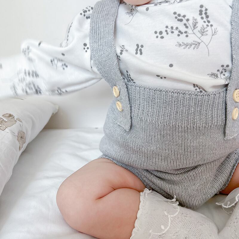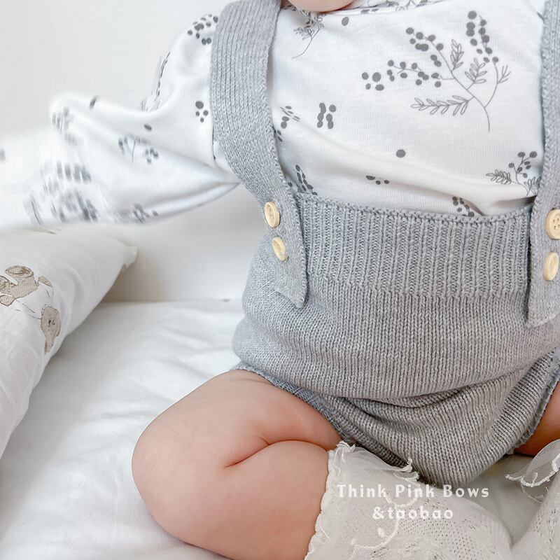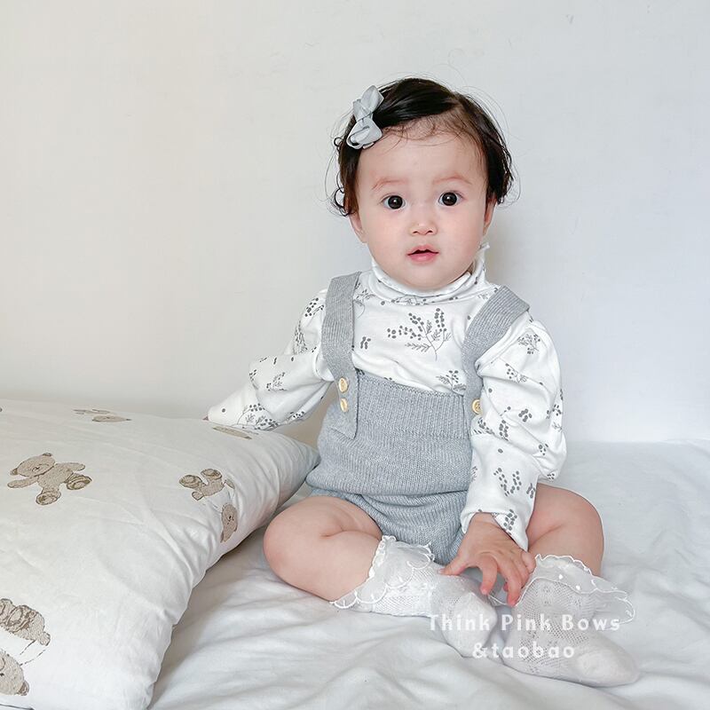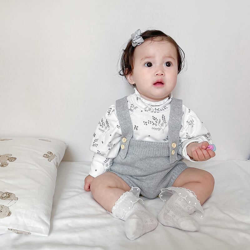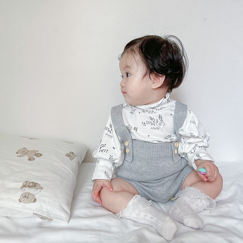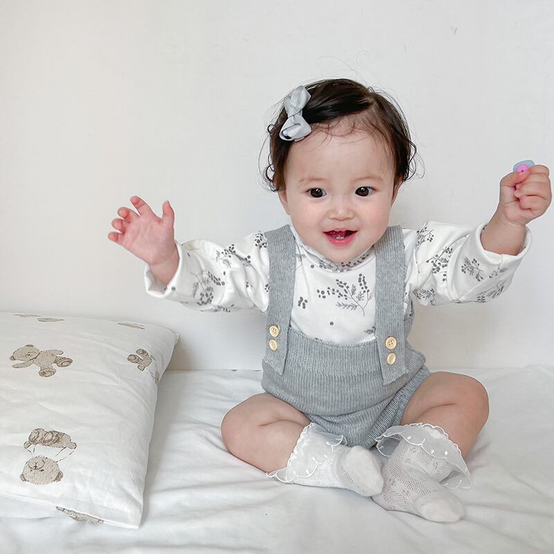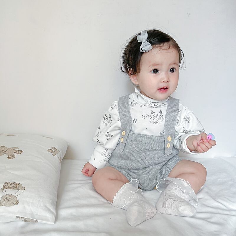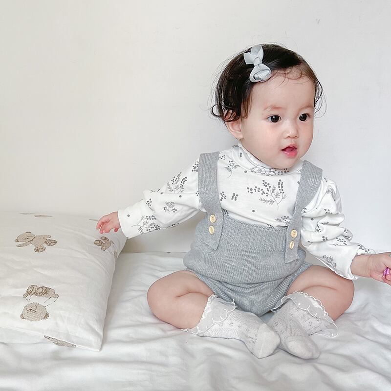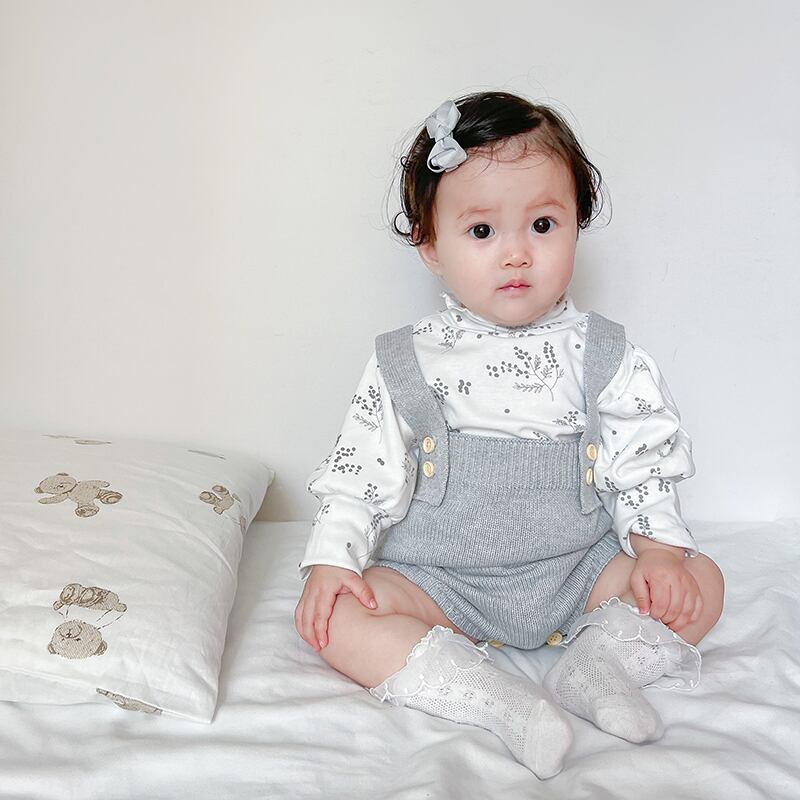 色:ライトグレーのオーバーオール,ベージュカーディガン,フローラルボトムスシャツ