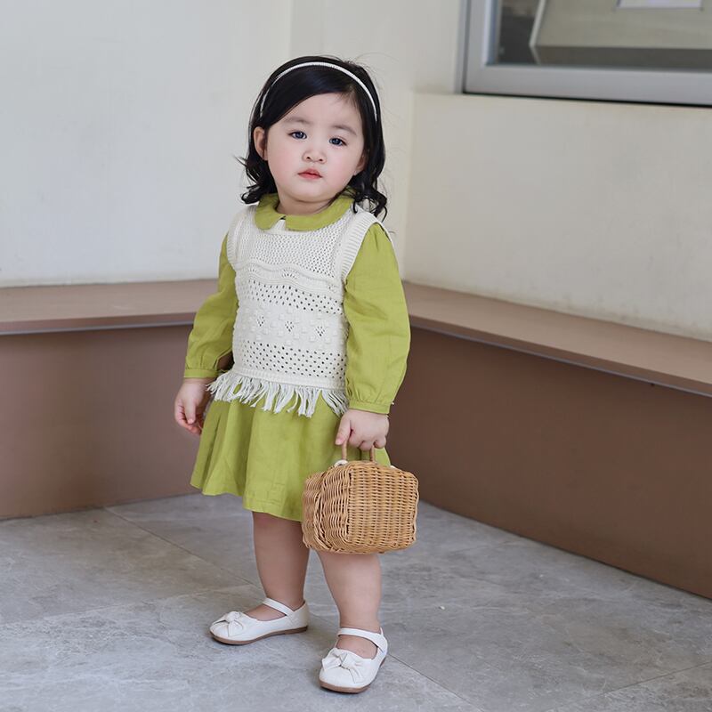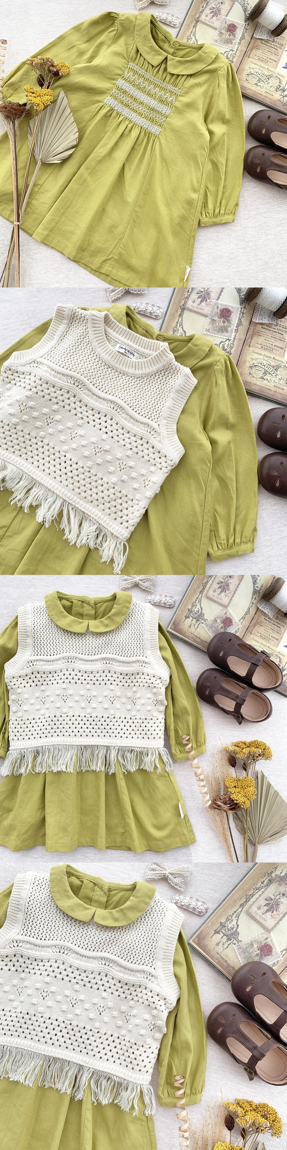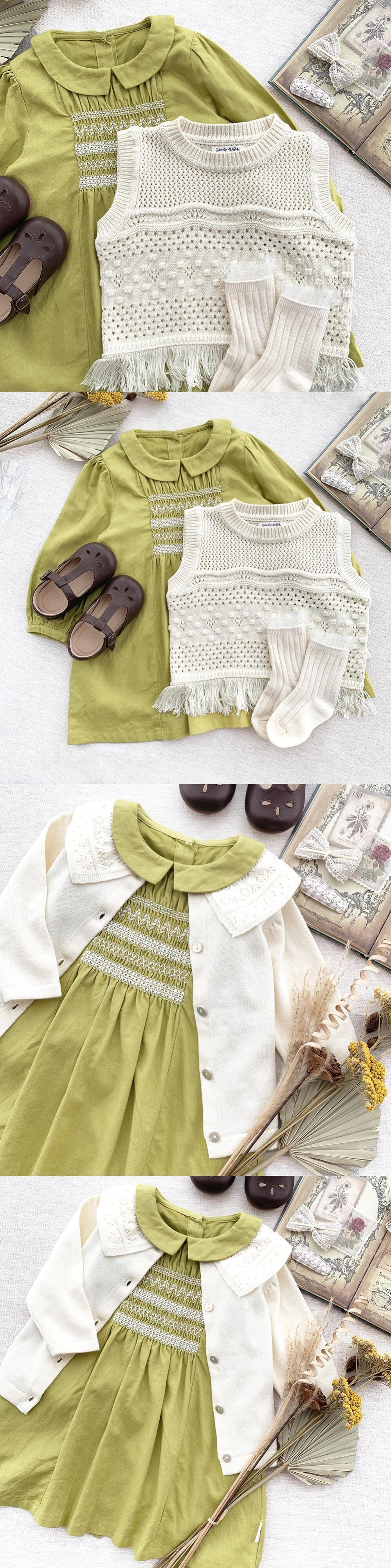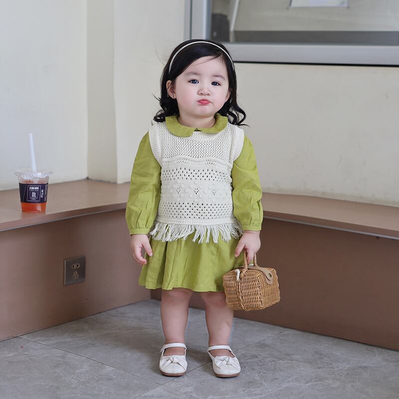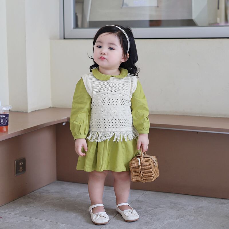 色:黄緑色のドレス,ホワイトニットベスト